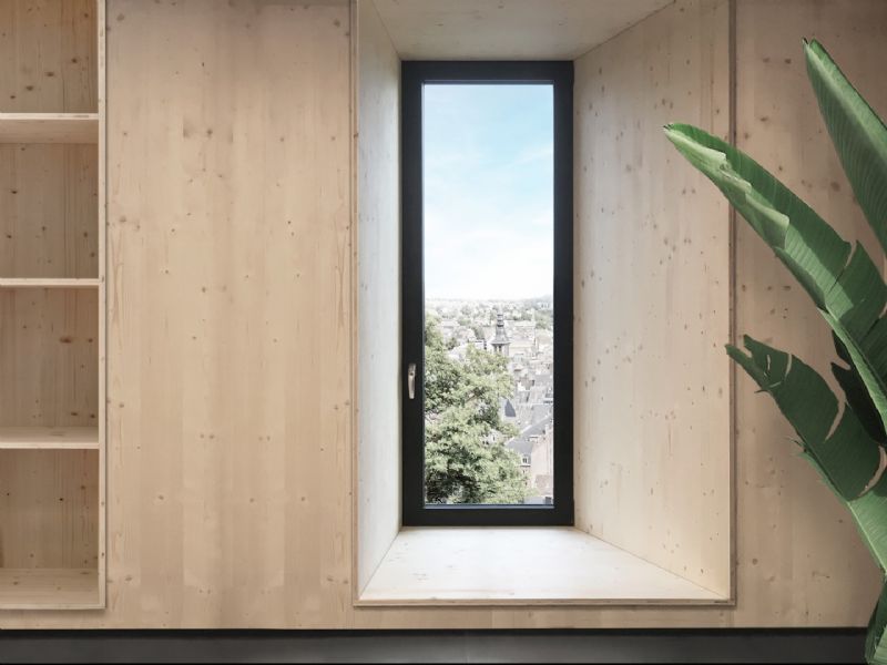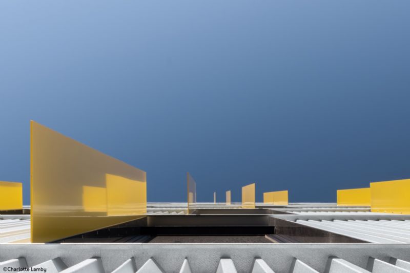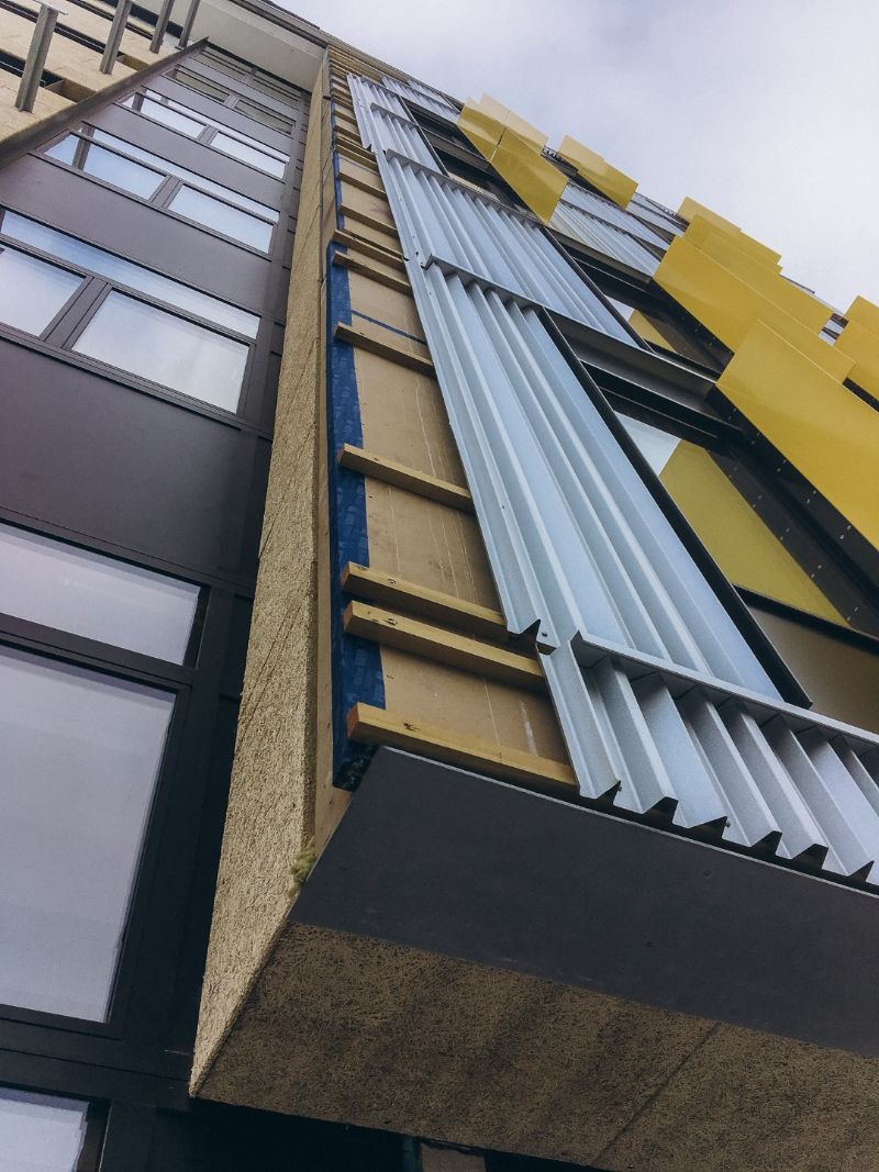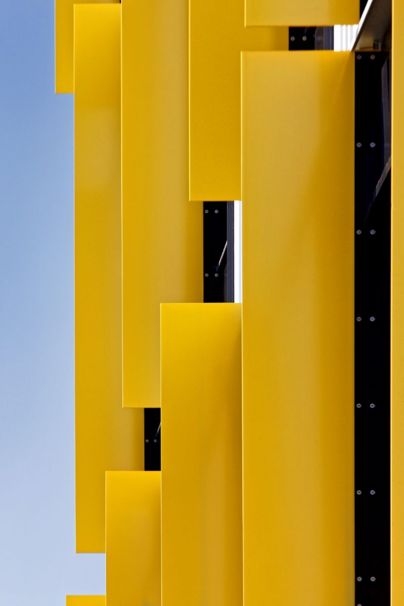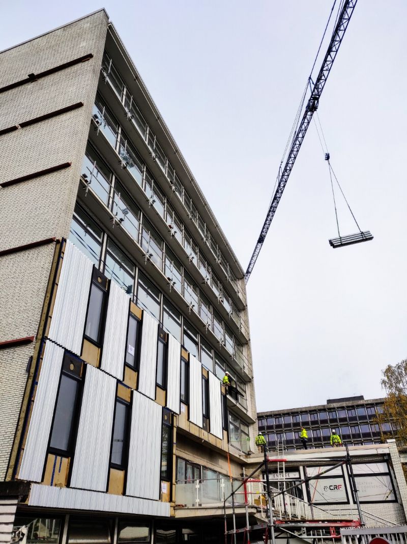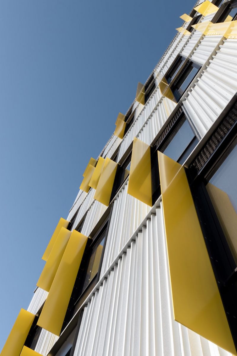 Le choix des architectes s'est porté sur une façade en caissons préfabriqués avec des châssis triple vitrage en aluminium et un parement en tôles d'acier. L'ensemble diminue fortement la quantité de vitrages existante, mais donne au bâtiment un look printanier et moderne.
