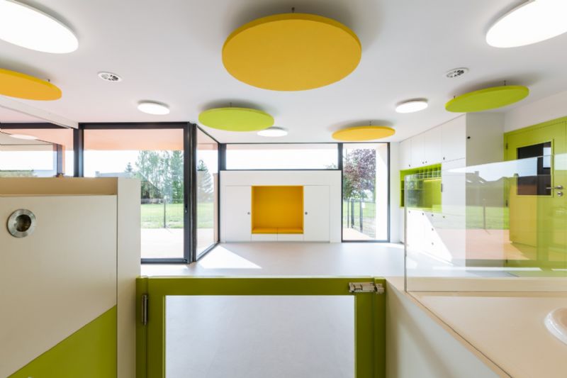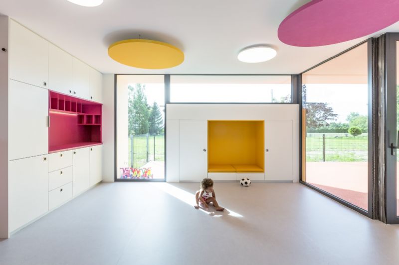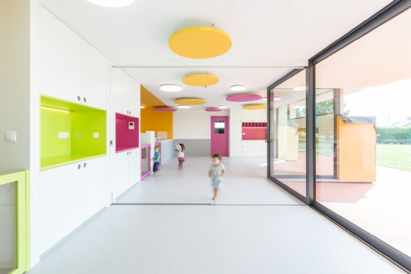 Helium3 signe la conception lumineuse et colorée d'une crèche à Momalle, en région liégeoise. On sent ici que le bien-être des enfants mais aussi celui des puéricultrices a été au centre des préoccupations des architectes.