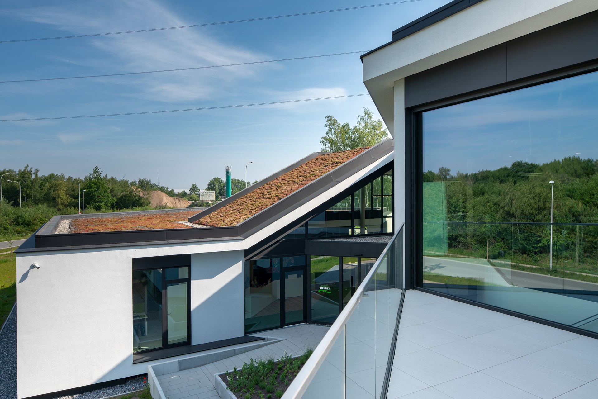 Le bâtiment, réalisé par MAMU architects, produit plus d’énergie qu’il n’en a besoin, au moyen d’une éolienne, de 3 suiveurs solaires et de l’énergie géothermique. Infinity est une association unique de BREEAM Outstanding et de LEED Gold. Il est l’un des 33 bureaux dans le monde à avoir obtenu la plus haute certification BREEAM. L’utilisation de RubberGard EPDM d’Elevate (anciennement systèmes d’étanchéité de toiture Firestone) a contribué à l’obtention du meilleur score de la part de ces deux programmes. Le toit a été installé par l’un des Master Contractors d’Elevate en Belgique