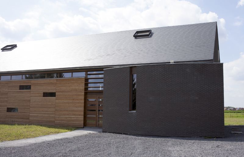 L'Atelier d'architecture Barbara Noirhomme a dessiné à Brunehaut une maison de village utilisée essentiellement par les associations locales. Son apparence traditionnelle, avec toiture en bâtière, s’intègre parfaitement dans le paysage. Le choix des matériaux et l’agencement de la façade confèrent néanmoins à cette maison passive un caractère contemporain.