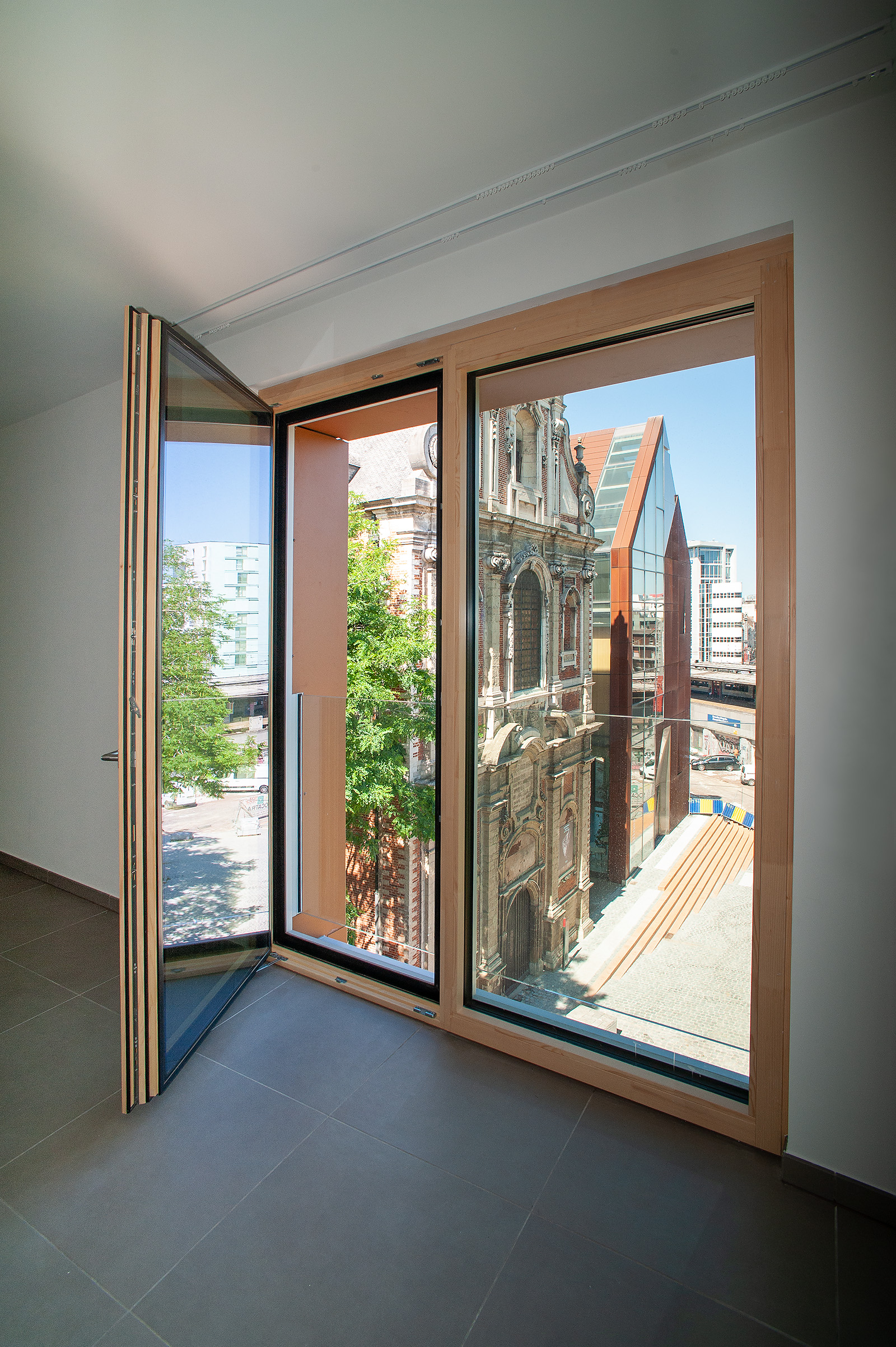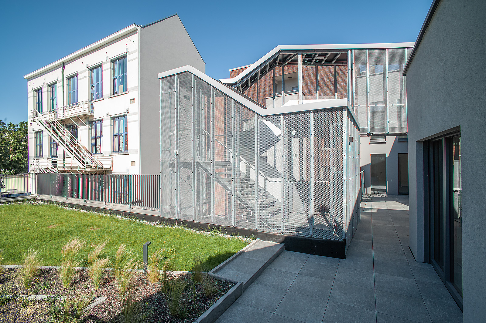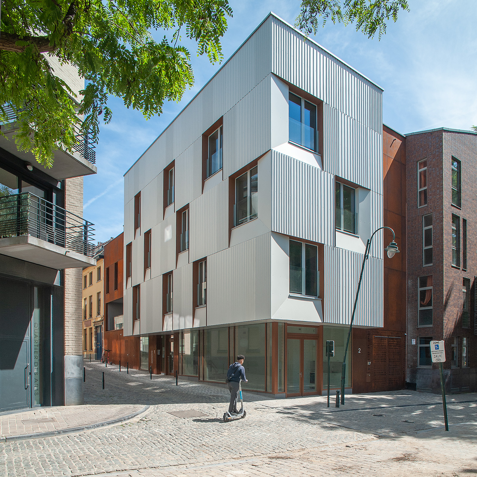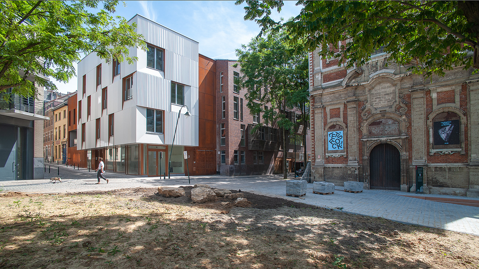Le contexte urbanistique, marqué par le tracé du chemin de fer, a généré des découpes d’îlots, des bâtiments et des espaces publics particuliers et atypiques. Dans ce cadre, nous avons marqué l’angle de manière structurante et signifiante, par la conception claire et lisible du volume d’angle en encorbellement et par un traitement à la fois abstrait et architectonique des façades. Nous avons utilisé l’acier corten comme matériau de liaison aux voisins et au contexte, référence chromatique à la terre cuite traditionnelle et à l’extension des Brigittines.