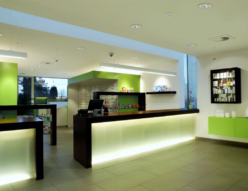 Les maîtres-mots pour l’espace intérieur sont fonctionnalité et jeux de lumière. L’officine est divisée transversalement en quatre zones suivant les fonctions : la zone clients (attente, présentoirs, parapharmacie), le comptoir (accueil, service, conseil), la zone spécialités et déballage, la zone laboratoire et bureau. Cette dernière donnant sur le paysage géométrique du jardin privé. D’est en ouest, l’accueil est traversé par une verrière accentuant la luminosité sur le comptoir ; la nuit sa face avant est baignée d’une lumière diffuse.