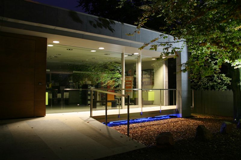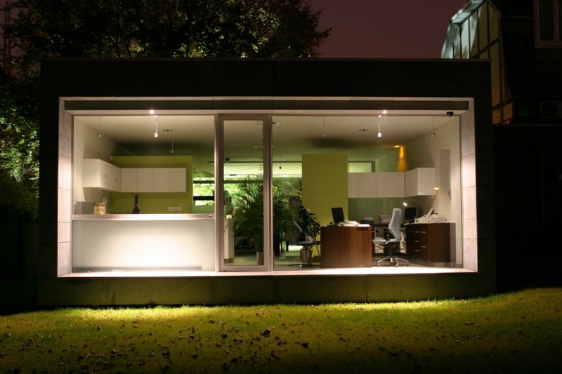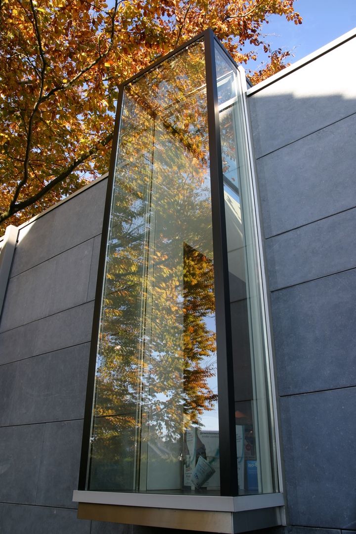 Le volume est un parallélépipède rectangle 100% vitré sur les façades avant et arrière. Côté rue, il se détache du sol par un porte à faux qui accentue l’aspect immatériel de l’annexe et a permis de sauvegarder le grand hêtre existant en évitant toute fondation à proximité. De nuit, cet encorbellement est souligné par un éclairage bleu qui nous donne la sensation d’être en apesanteur.