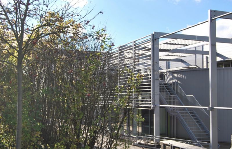 Le hall industriel comprend plusieurs zones (stockage, soudage, collage, meulage). Une zone de classes pratiques est en contact direct avec l’atelier. De part et d’autre de la rue, on retrouve les bureaux, la cafétéria, les salles de cours théoriques. La rue couverte est traitée comme un lieu de rencontre très lumineux avec vues plongeantes sur les ateliers.
