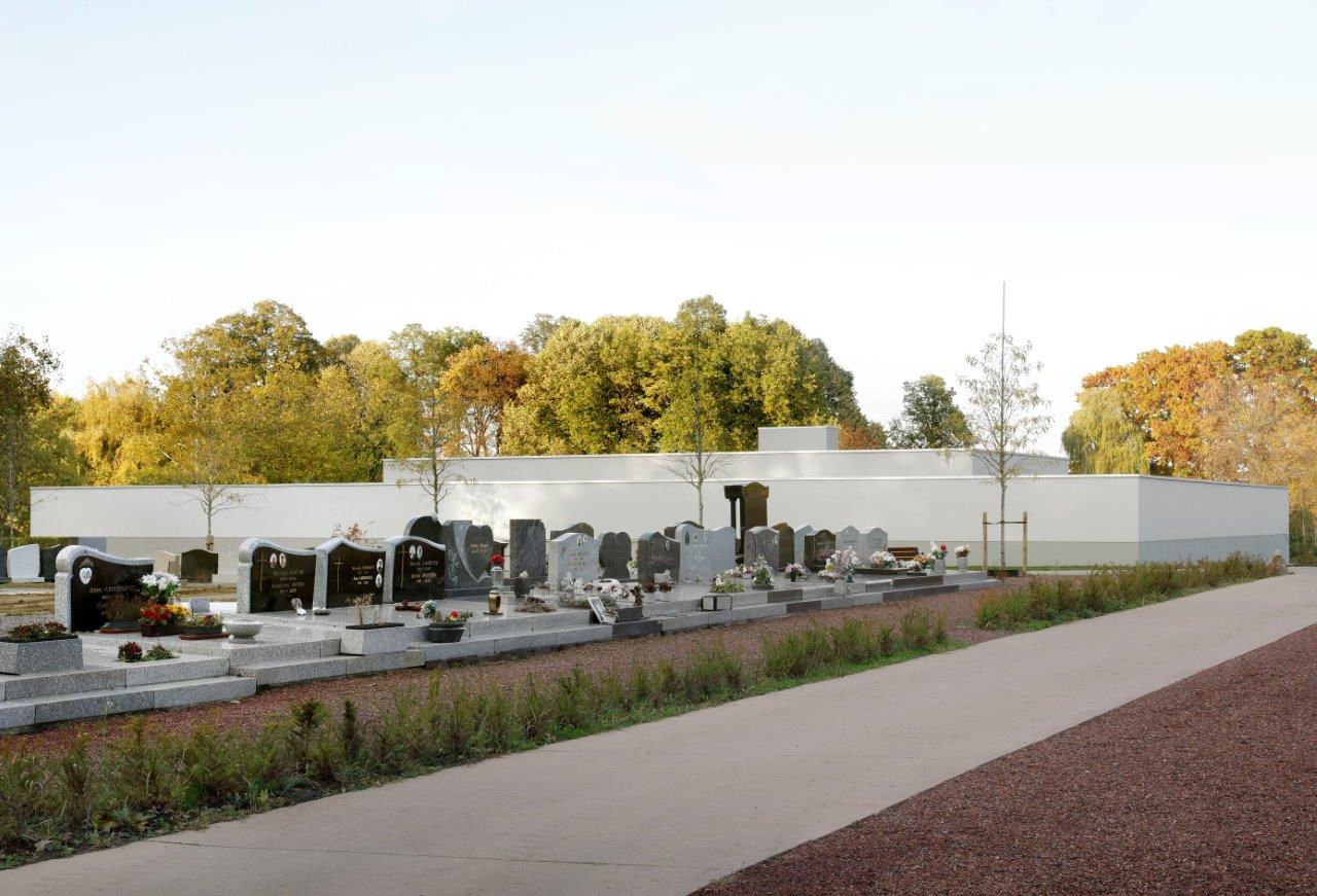Nieuwe bouw van een crematiecentrum dat op het gelijkvloers voornamelijk bestaat uit een ontvangst, 2 ceremoniezalen, een rouwtafelruimte (HoReCa), een bistroterras, condoleanceruimtes en privé salons, evenals administratieve kantoren en gebruikslokalen. 7 patio's definiëren de binnen/buiten-relaties van dit programma met betrekking tot de begraafplaats (privacy/introspectie). De technische zones die in de kelder zijn ontwikkeld, omvatten hoofdzakelijk de toegangszone voor uitvaartondernemingen die leiden naar de verbrandingszalen, ovenzones, technische ruimtes en opslagruimtes, evenals de kleedkamers en sanitaire voorzieningen voor het personeel. Bouw op bezette begraafplaats, milieuvergunning, energierecuperatie, fotovoltaïsche elektriciteitsproductie.