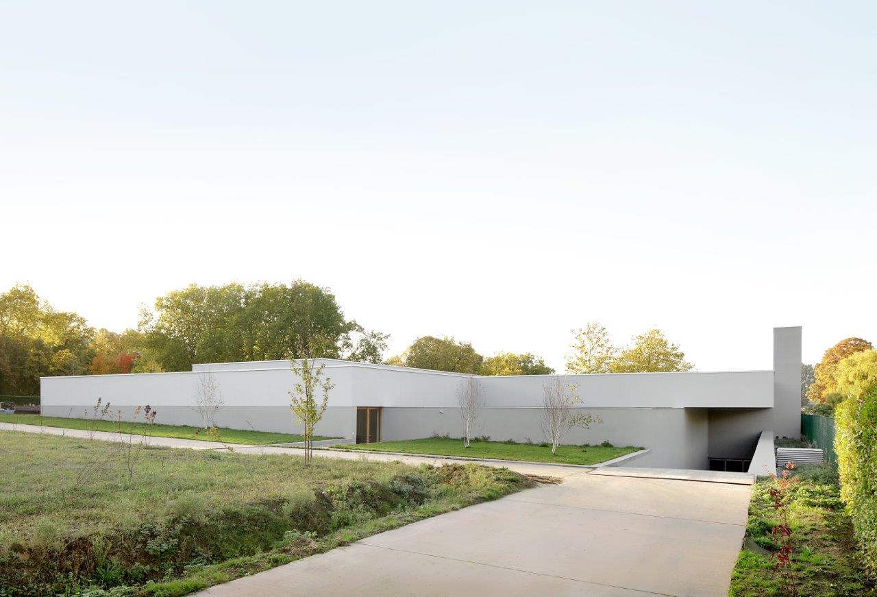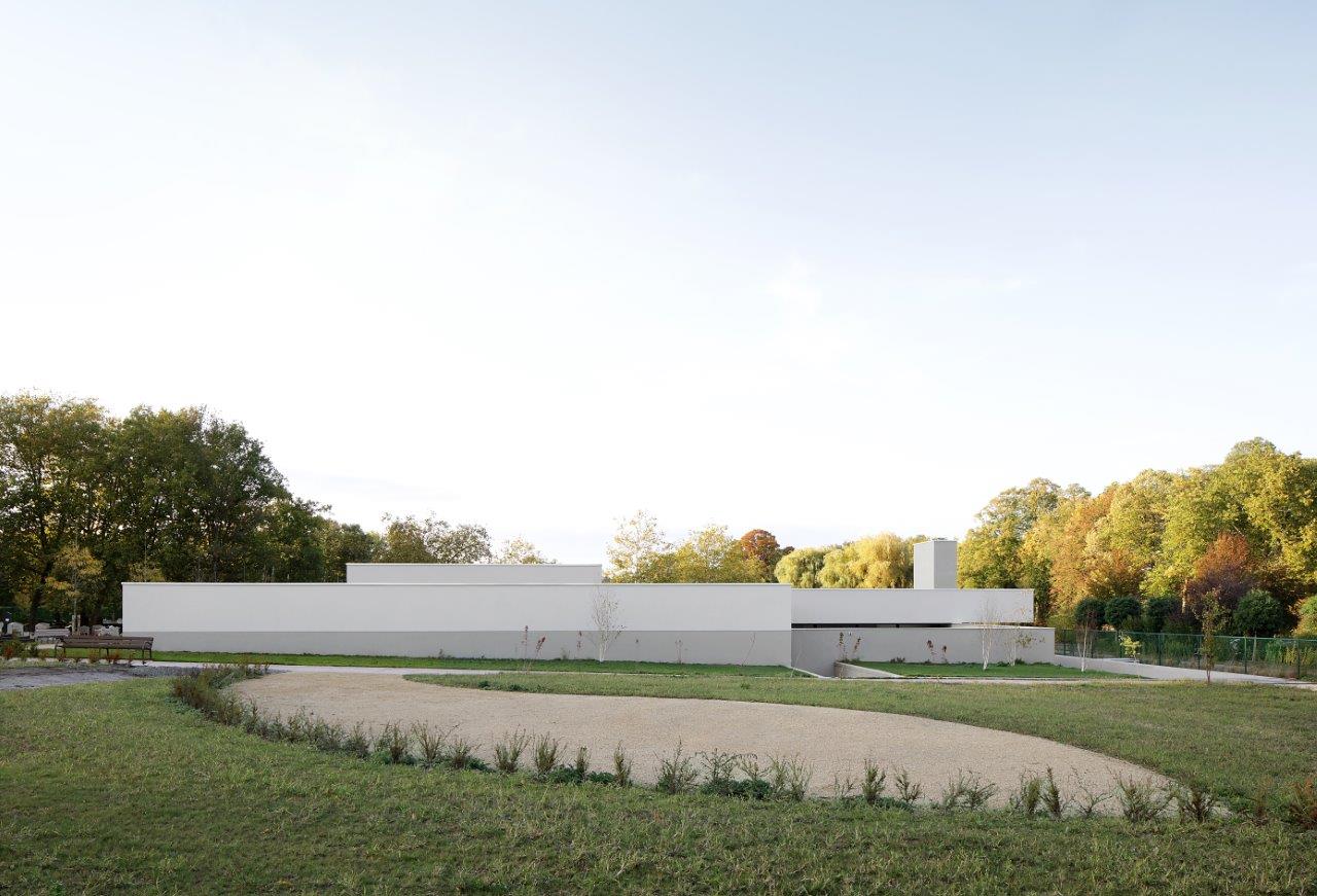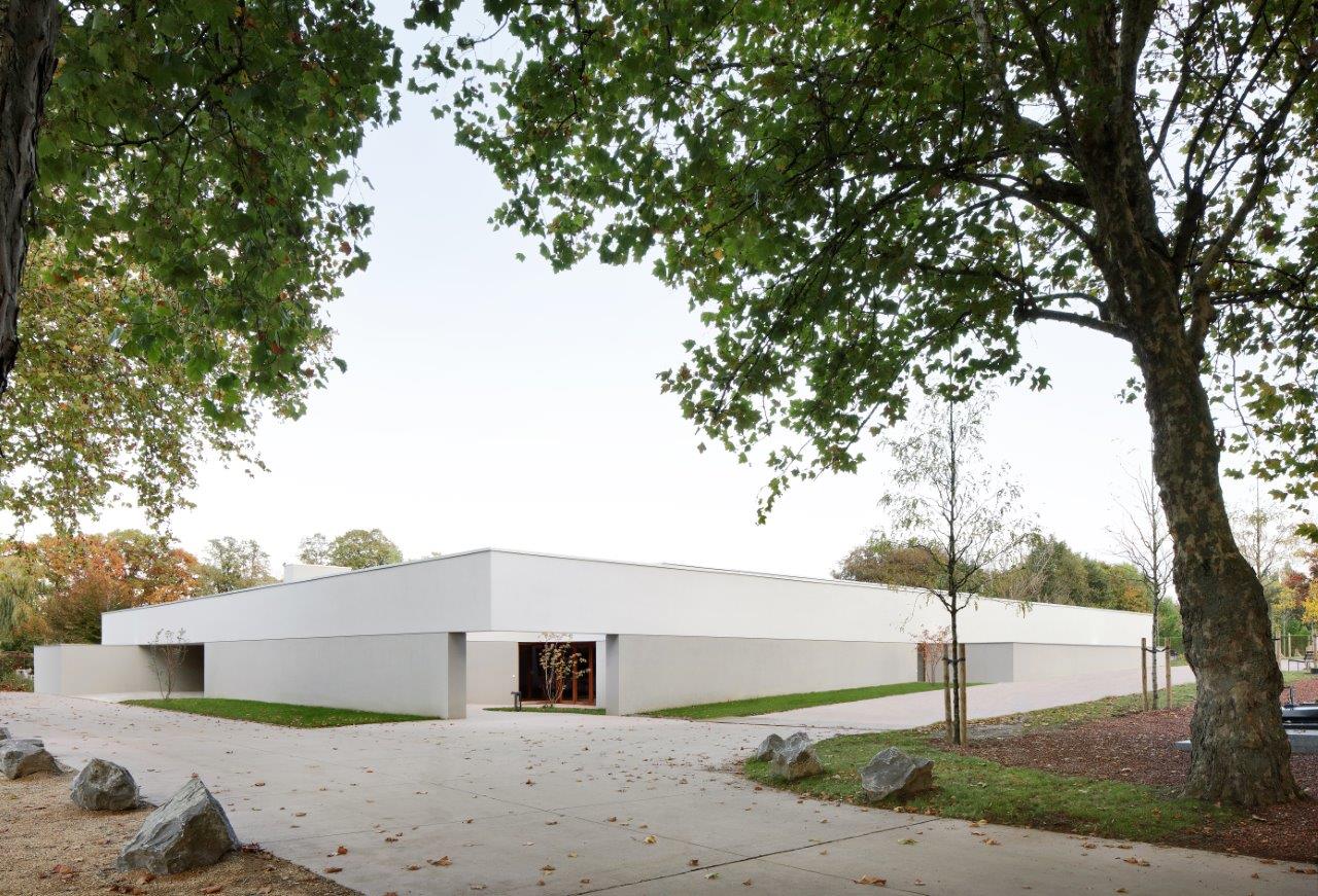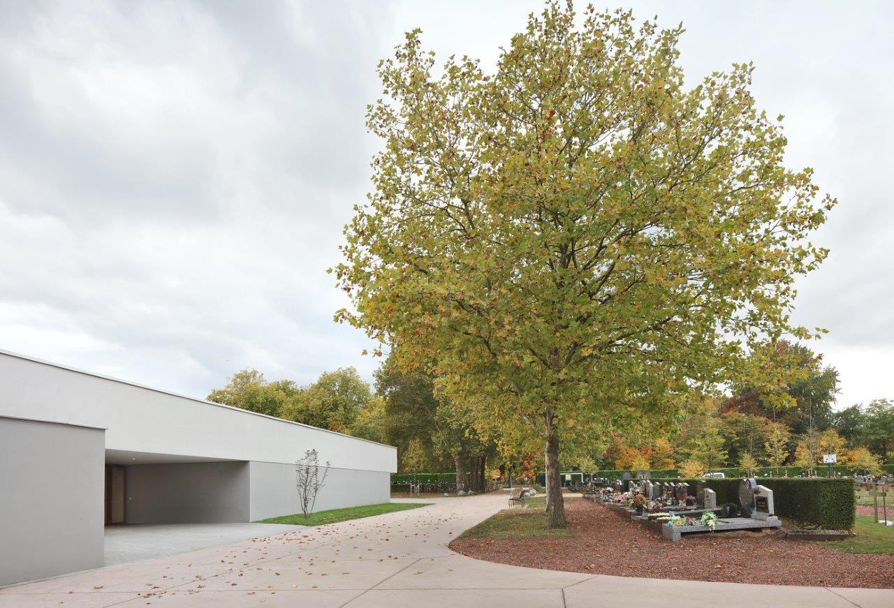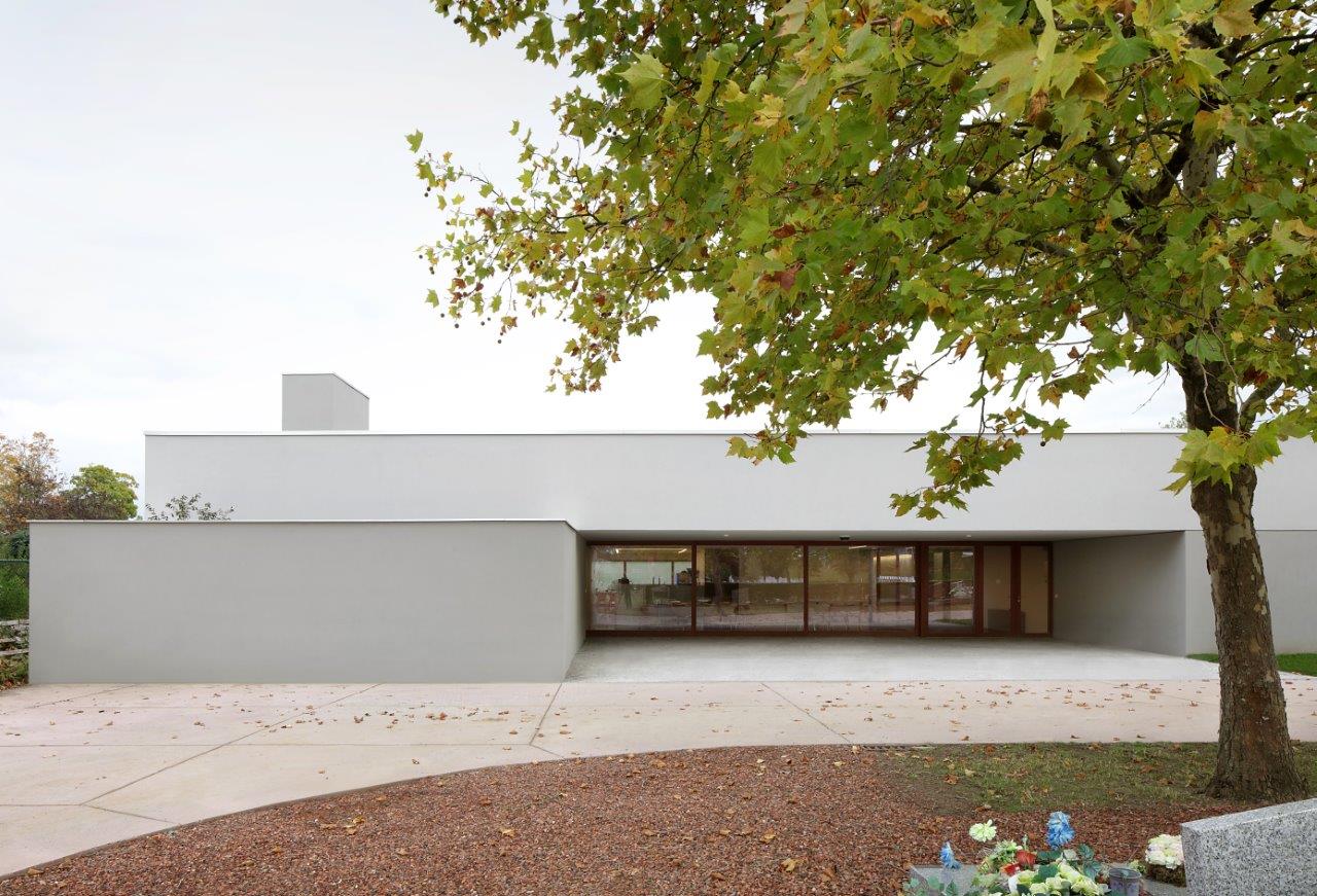 Het gebouw meet zichzelf met de plek, omringd door een groene rand die de ruimte van bezinning beschermt. De ingang bevindt zich op de hoek, bij de kruising van de as van de begraafplaats en een pad, via een patio. De toegang, licht hellend, nodigt families en naasten uit. De patio fungeert als een voorwoord, een inleiding geschikt voor bezinning. De ruimte verwelkomt, bedient de ceremoniezalen die baden in natuurlijk licht. Aan de tegenovergestelde hoek bevindt zich de dienstingang, die leidt naar de niet-publieke technische ruimtes. Na de bezinning zet de processie zich voort, komt de tijd voor condoleances, de terugkeer naar het leven, begint men de afwezigheid te aanvaarden. In een sobere ruimte waar familie kan ontvangen, in de eenvoud herwonnen van een cafetaria, of zich richtend naar het verstrooiing gazon.