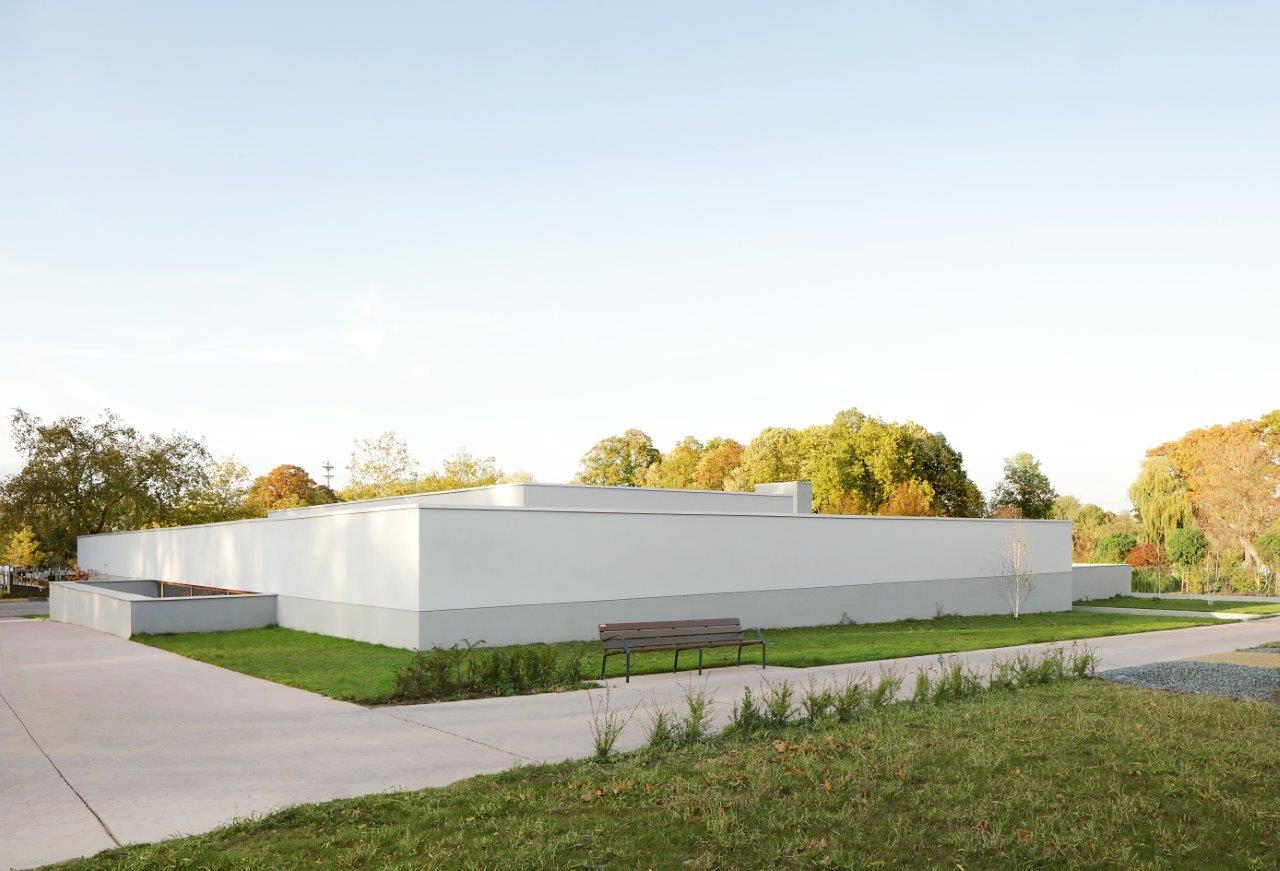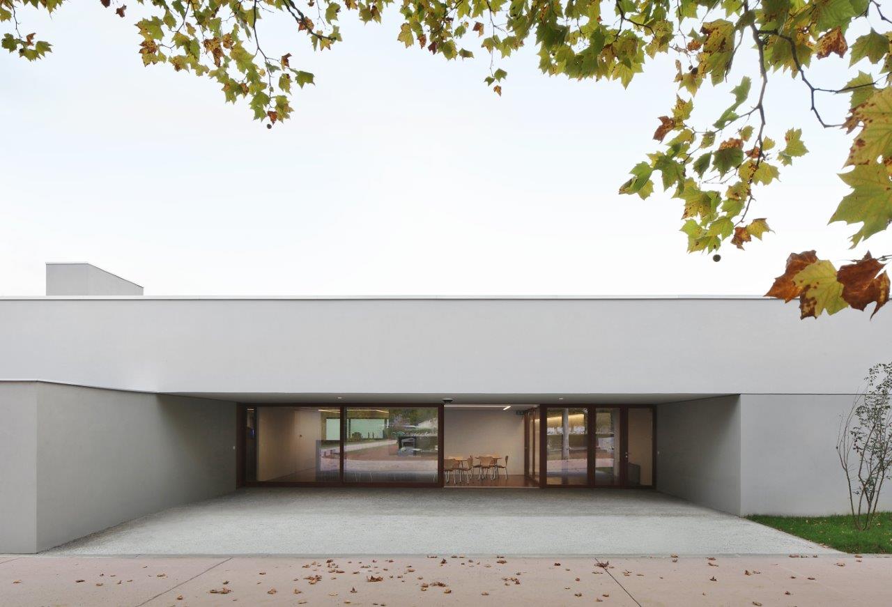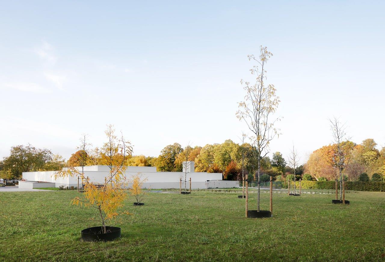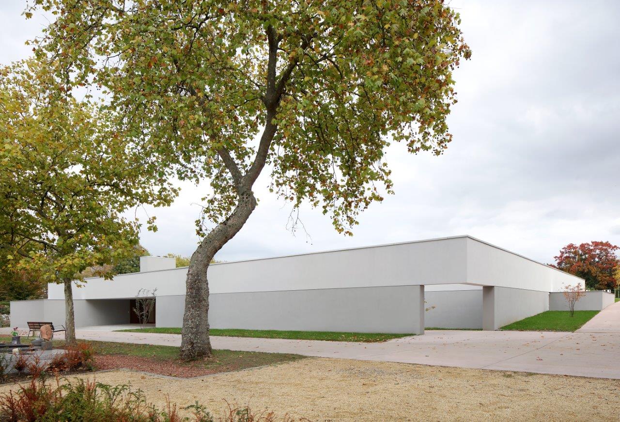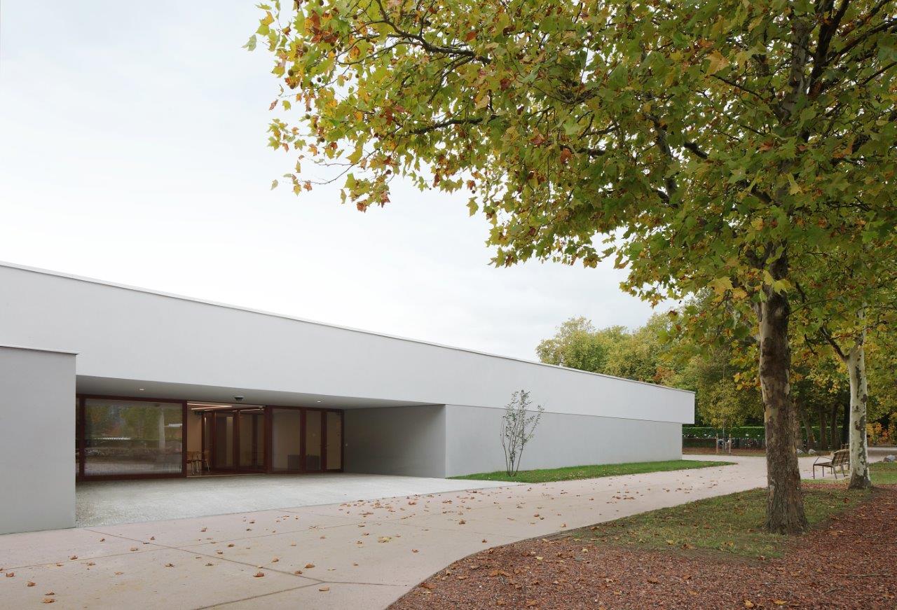Het gebouw meet zichzelf met de plek, omringd door een groene rand die de ruimte van bezinning beschermt. De ingang bevindt zich op de hoek, bij de kruising van de as van de begraafplaats en een pad, via een patio. De toegang, licht hellend, nodigt families en naasten uit. De patio fungeert als een voorwoord, een inleiding geschikt voor bezinning. De ruimte verwelkomt, bedient de ceremoniezalen die baden in natuurlijk licht. Aan de tegenovergestelde hoek bevindt zich de dienstingang, die leidt naar de niet-publieke technische ruimtes. Na de bezinning zet de processie zich voort, komt de tijd voor condoleances, de terugkeer naar het leven, begint men de afwezigheid te aanvaarden. In een sobere ruimte waar familie kan ontvangen, in de eenvoud herwonnen van een cafetaria, of zich richtend naar het verstrooiing gazon.
