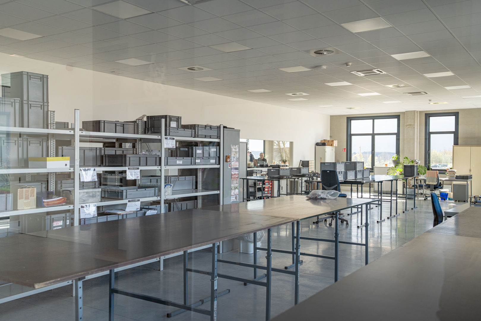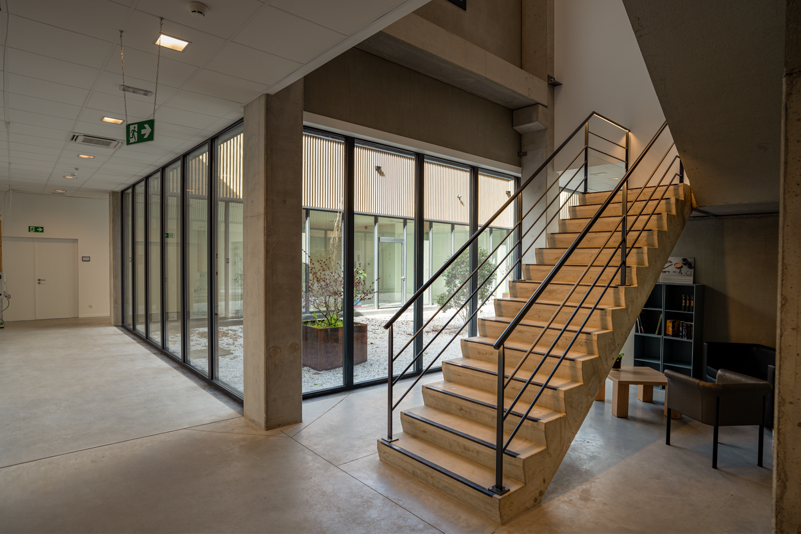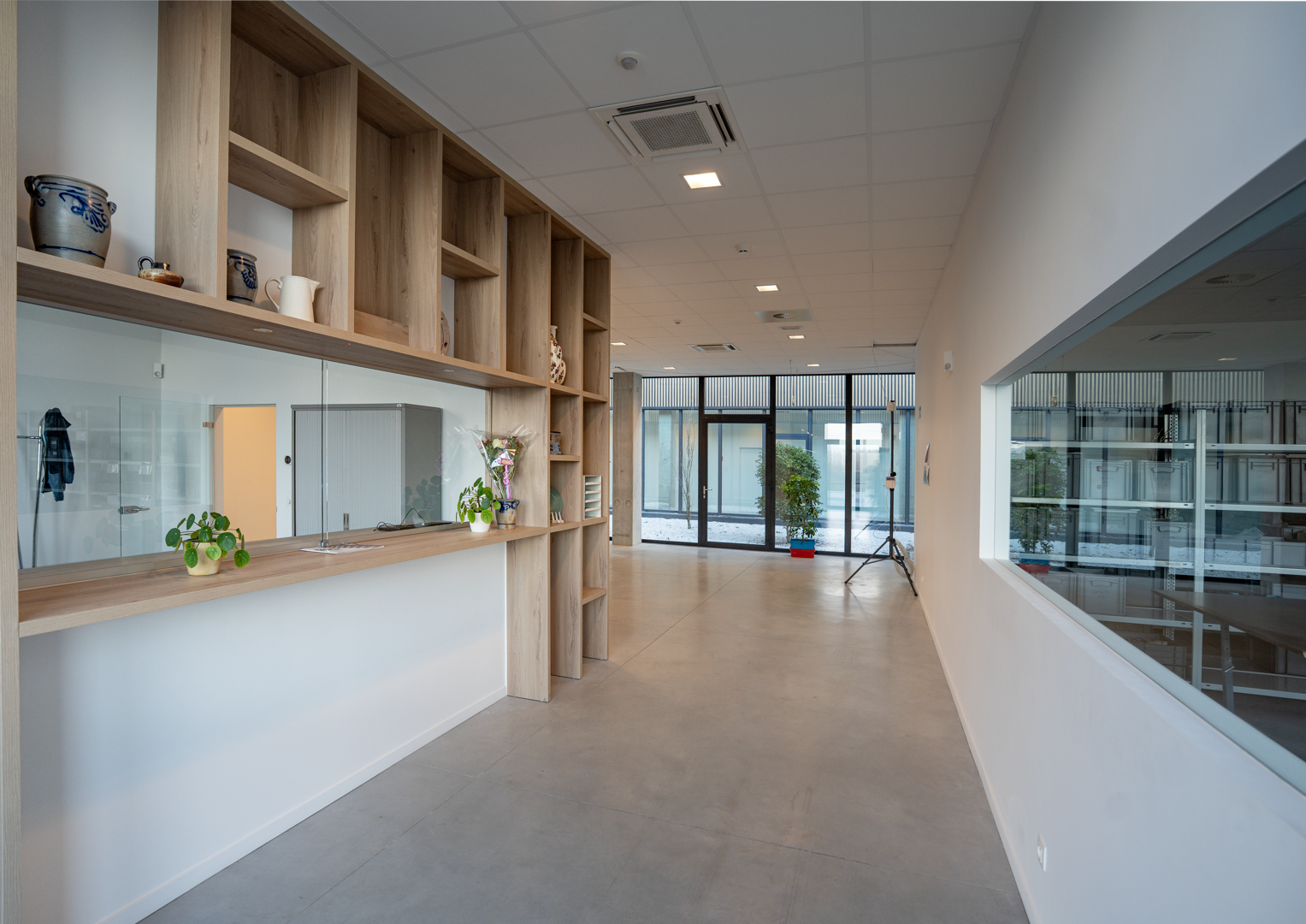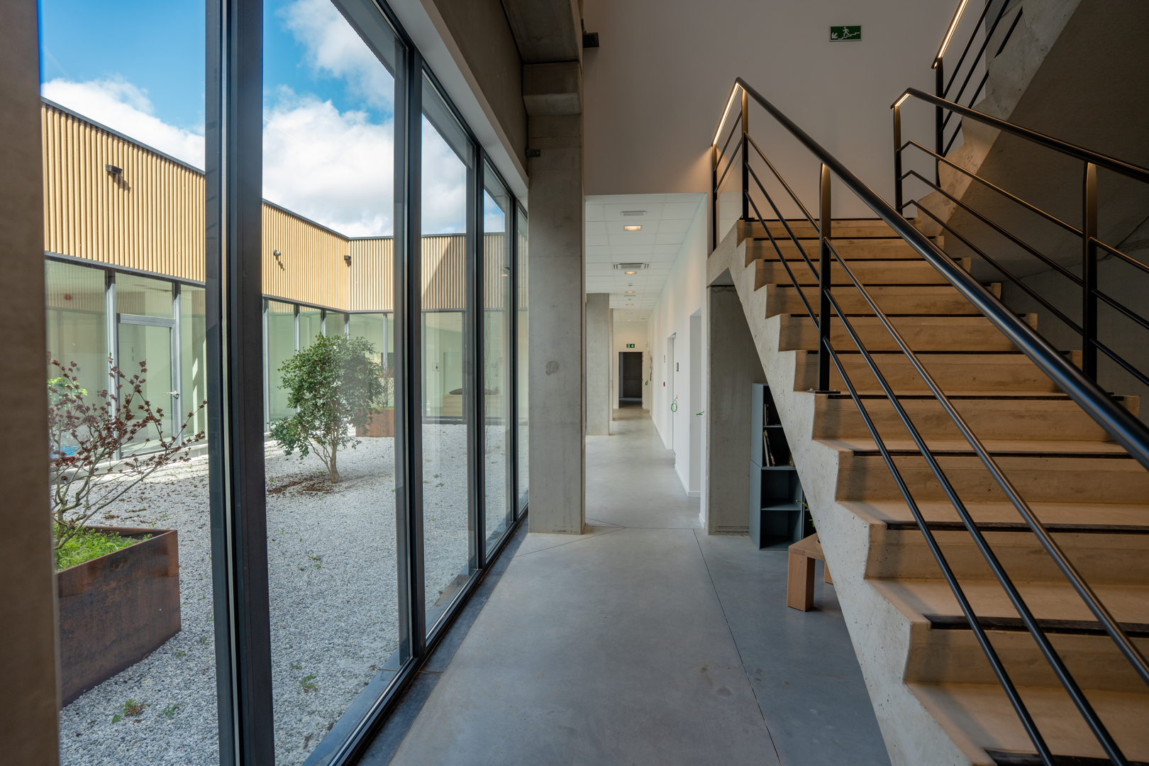 Het project moest sterk uiteenlopende functies met elkaar verbinden, variërend van opslagruimtes met strenge technische eisen tot open werkzones. De oplossing is gebaseerd op een indeling in twee complementaire delen, waardoor het gebouw duidelijk te lezen is. De indeling maakt gebruik van de natuurlijke helling van het terrein om de toegangen van elkaar te scheiden en de circulatie te optimaliseren. Het administratieve deel is georganiseerd rond een centrale patio, die de looproutes structureert, de oriëntatie verbetert en de werkruimtes een ruimtelijke kwaliteit geeft.