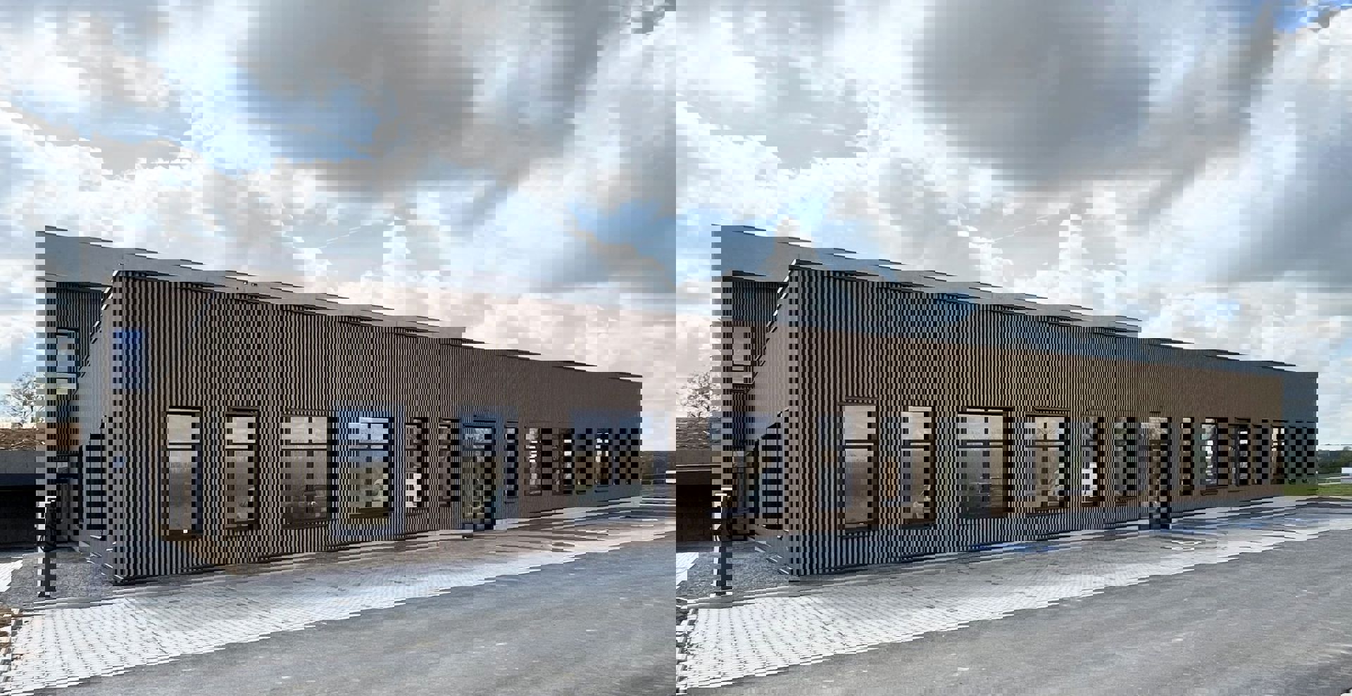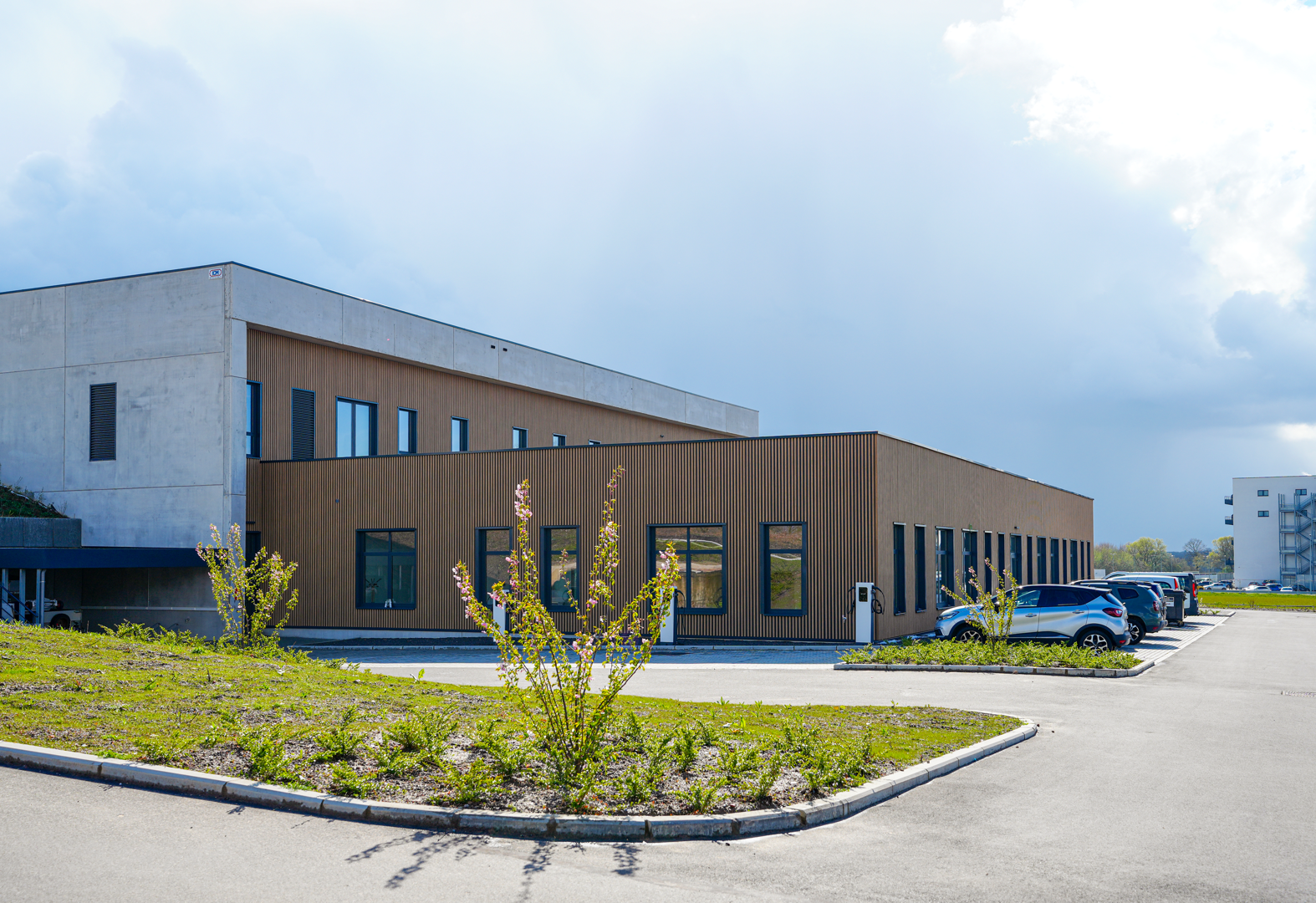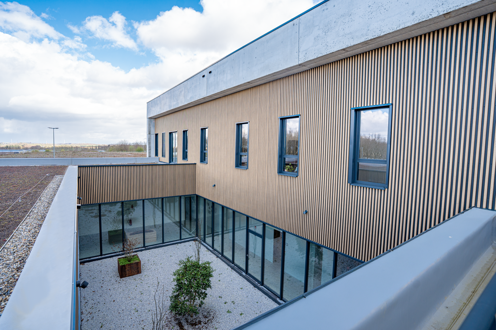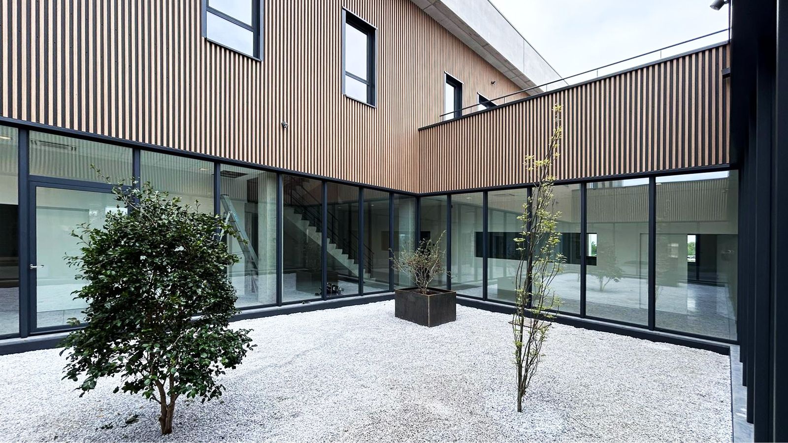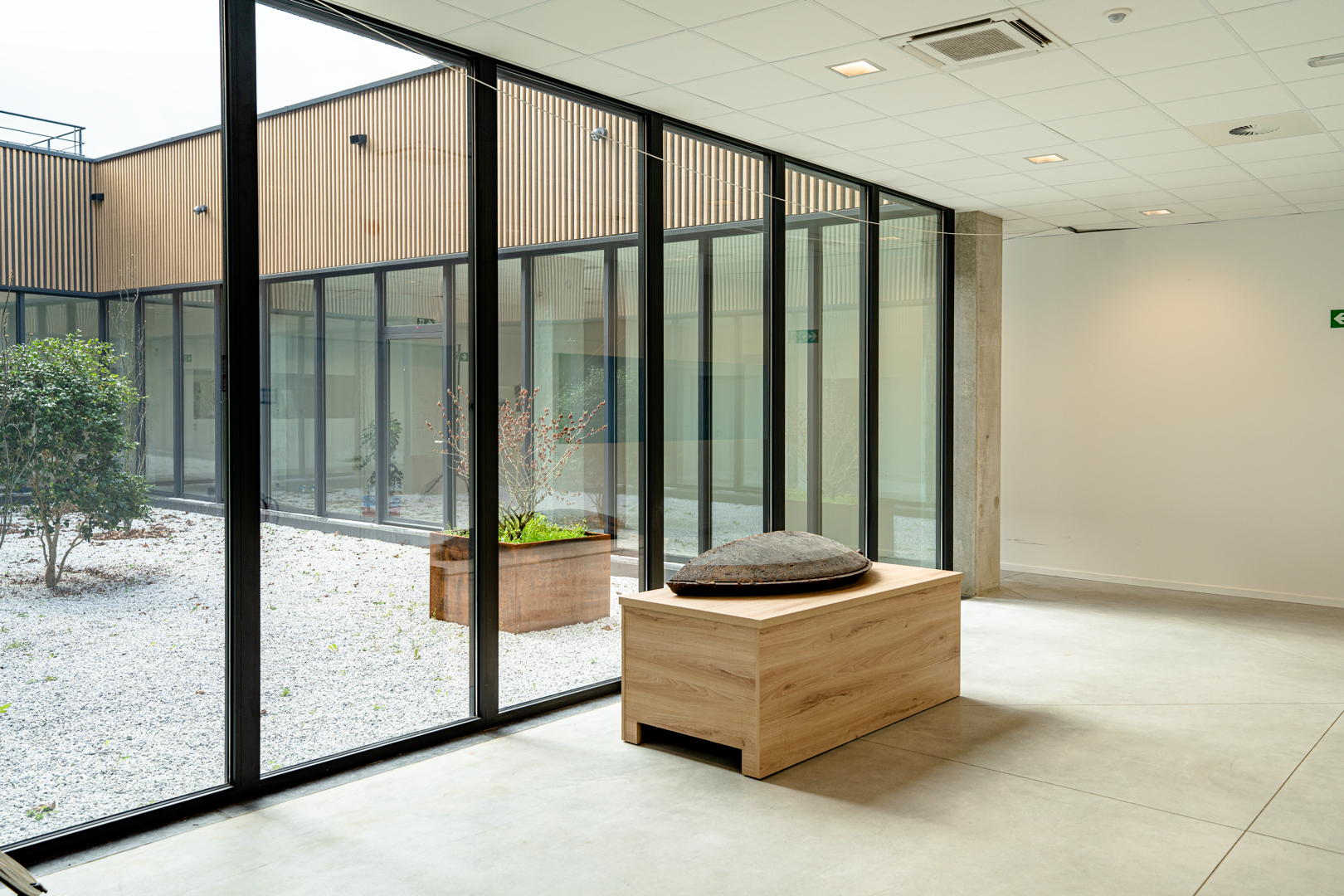 Het project moest sterk uiteenlopende functies met elkaar verbinden, variërend van opslagruimtes met strenge technische eisen tot open werkzones. De oplossing is gebaseerd op een indeling in twee complementaire delen, waardoor het gebouw duidelijk te lezen is. De indeling maakt gebruik van de natuurlijke helling van het terrein om de toegangen van elkaar te scheiden en de circulatie te optimaliseren. Het administratieve deel is georganiseerd rond een centrale patio, die de looproutes structureert, de oriëntatie verbetert en de werkruimtes een ruimtelijke kwaliteit geeft.