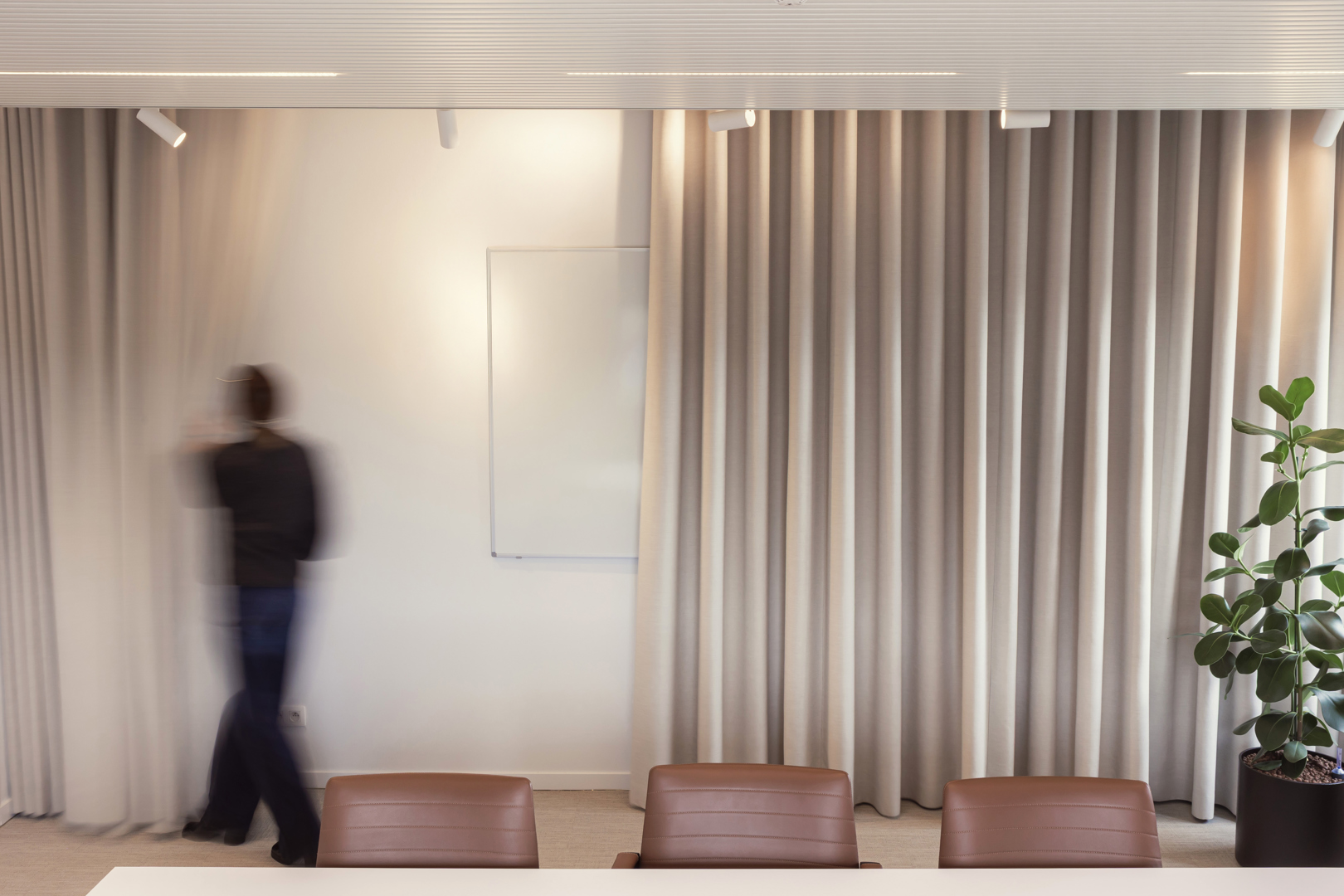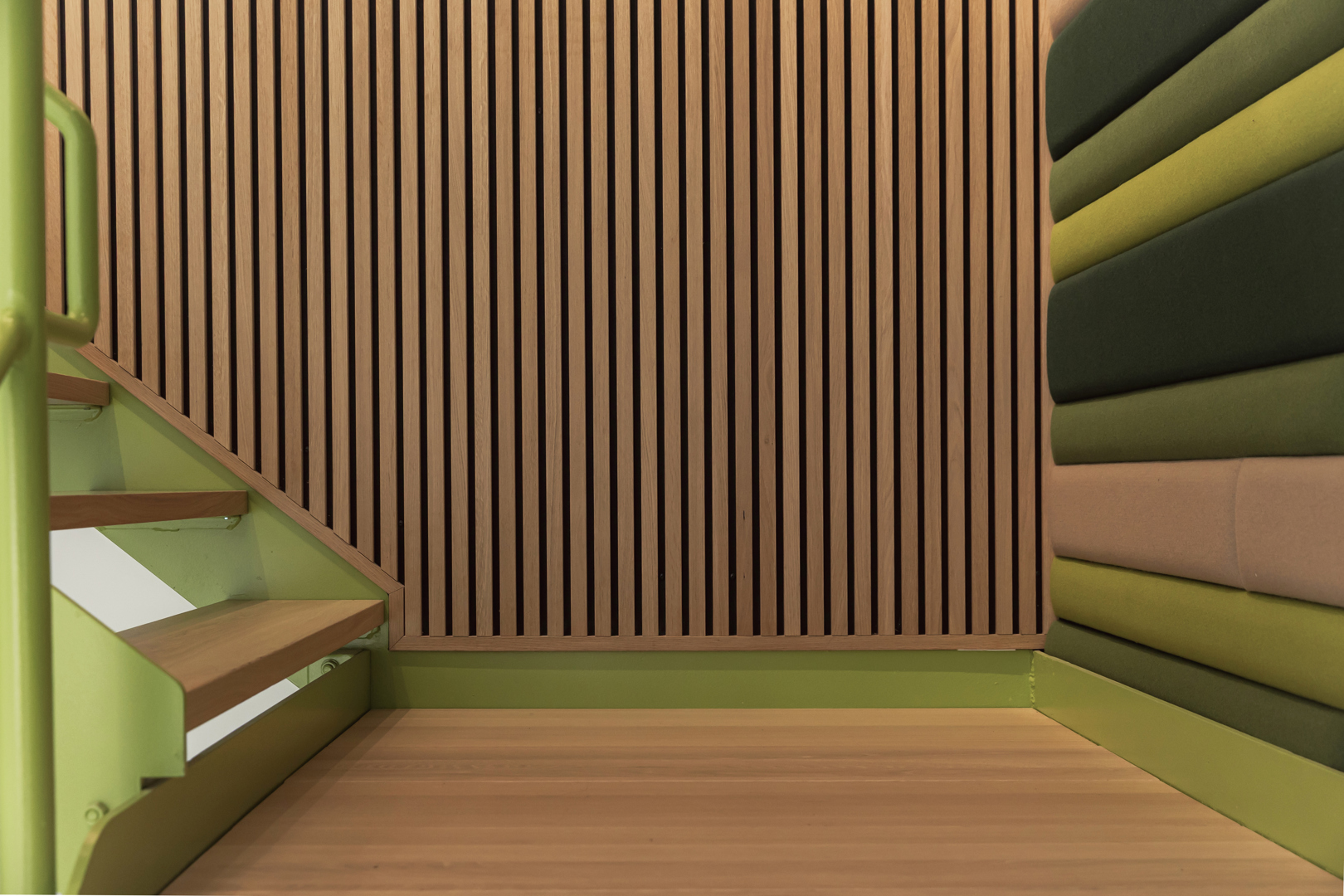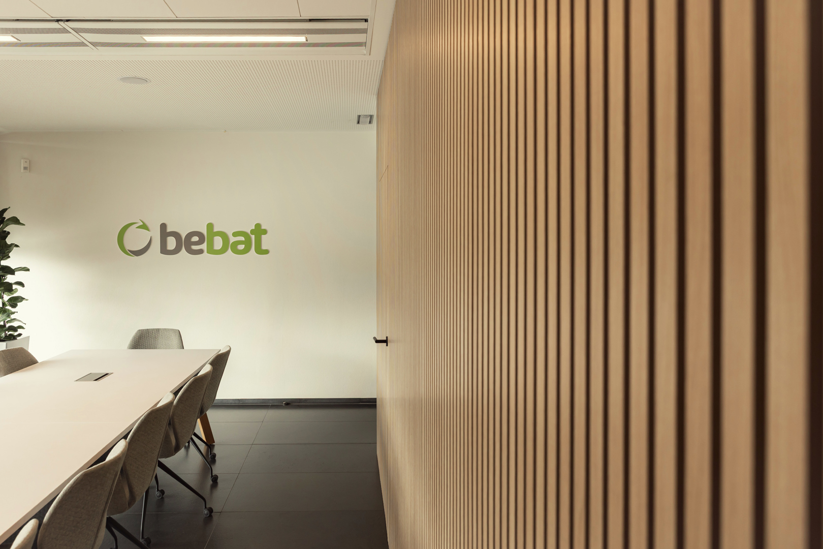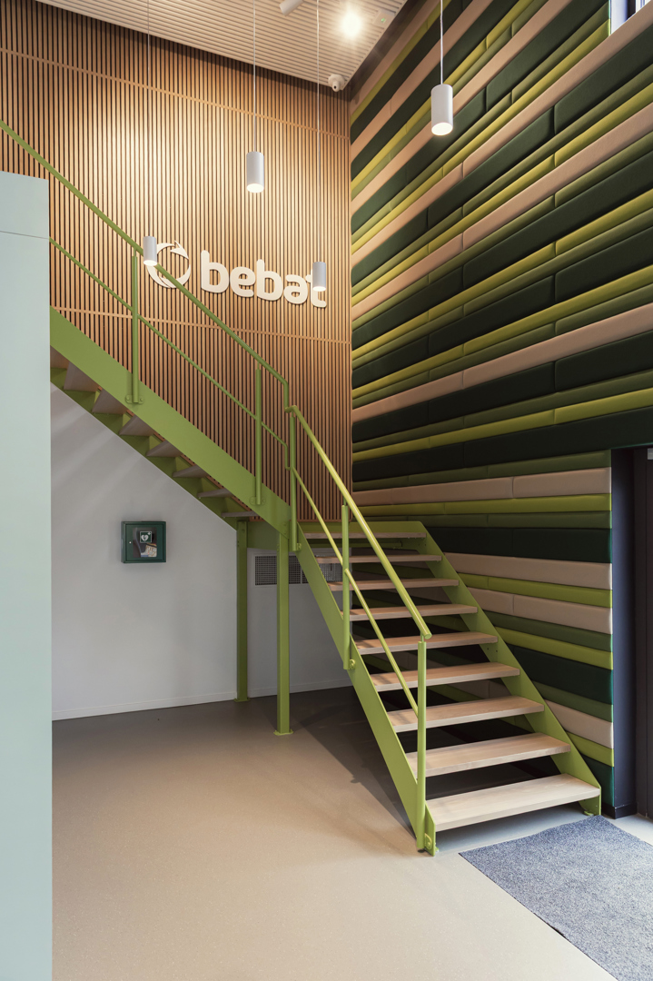 De grootste uitdaging was het combineren van diverse functies – werken, ontmoeten en educatie – binnen twee gebouwen met een verschillend karakter, zonder de samenhang te verliezen. Daarnaast was er de nood aan een warm en duidelijk onthaal, een sterke identiteitsbeleving van BEBAT en voldoende akoestisch comfort in intensief gebruikte ruimtes. Ook het integreren van bestaande elementen en technische randvoorwaarden vroeg om maatwerk. Hierop werd geantwoord met een helder ruimtelijk concept, waarin maatmeubilair, materialisatie en grafische elementen voor herkenbaarheid zorgen. Zachte materialen, vilt, moswanden en akoestische ingrepen verhogen het comfort, terwijl flexibele inrichting en doordachte circulatie zorgen voor gebruiksgemak en toekomstbestendigheid.