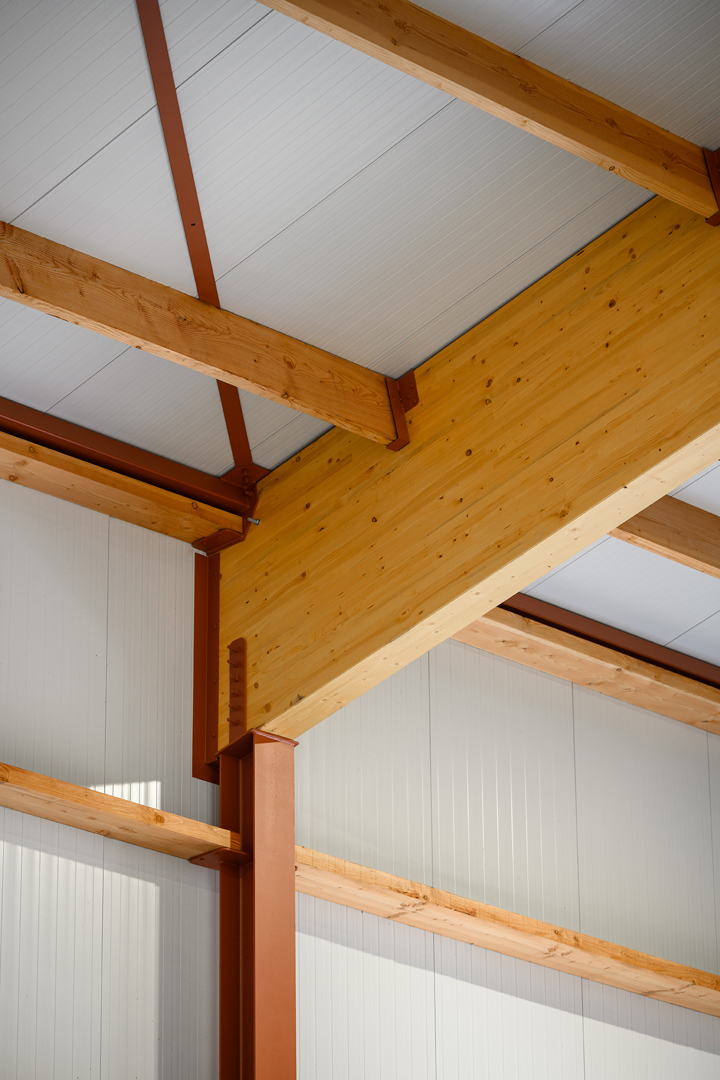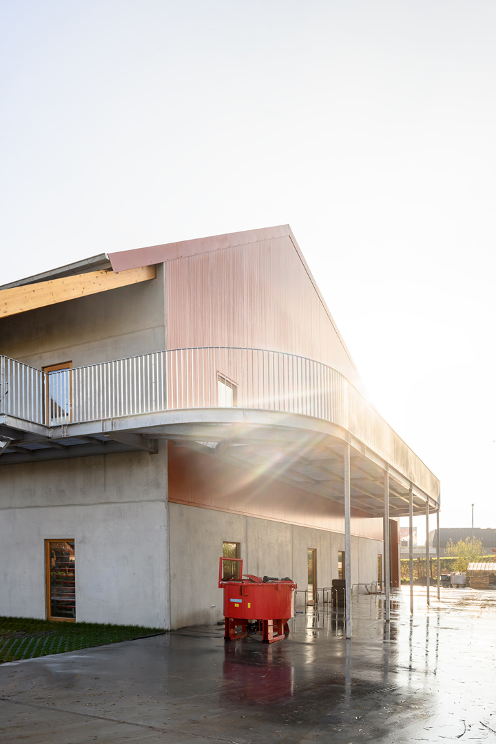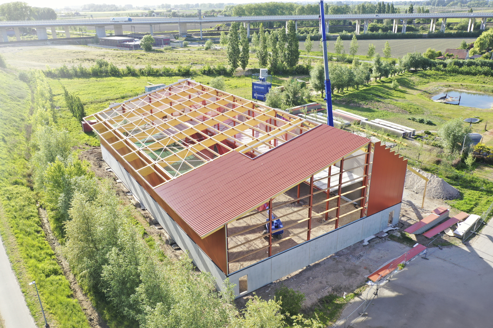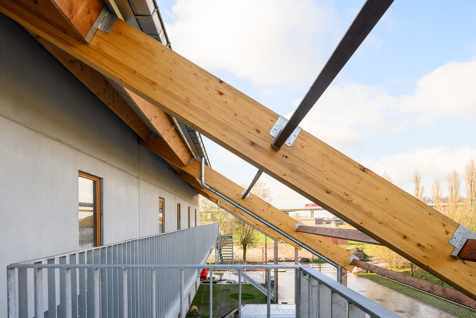 Het gebouw is opgevat als een verschaalde schuur die past op de historische site. Hoewel de site gelegen is in industrieterrein, werden vanuit de stedenbouwkundige dienst van Brugge, het agentschap onroerend erfgoed en monumentenzorg verschillende eisen gesteld naar ontwerp en inplanting van het gebouw. Het nieuw gebouw is het eerste van drie gelijkaardige gebouwen die in een masterplan een passend antwoord geven op de toekomstige ontwikkeling in samenspel met de historische hoeve. De materialiteit van het gebouw is eenvoudig maar toch zo circulair en ecologisch mogelijk, met een houten hoofdstructuur en circulaire sandwichpanelen met rotswol, passend bij de visie die het ecologisch bouwbedrijf wil uitdragen.