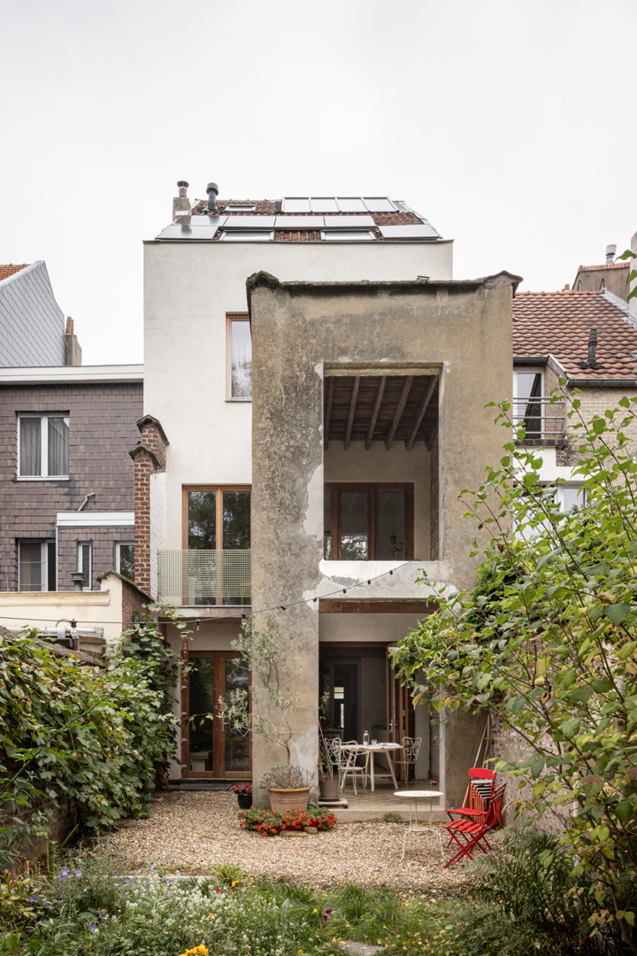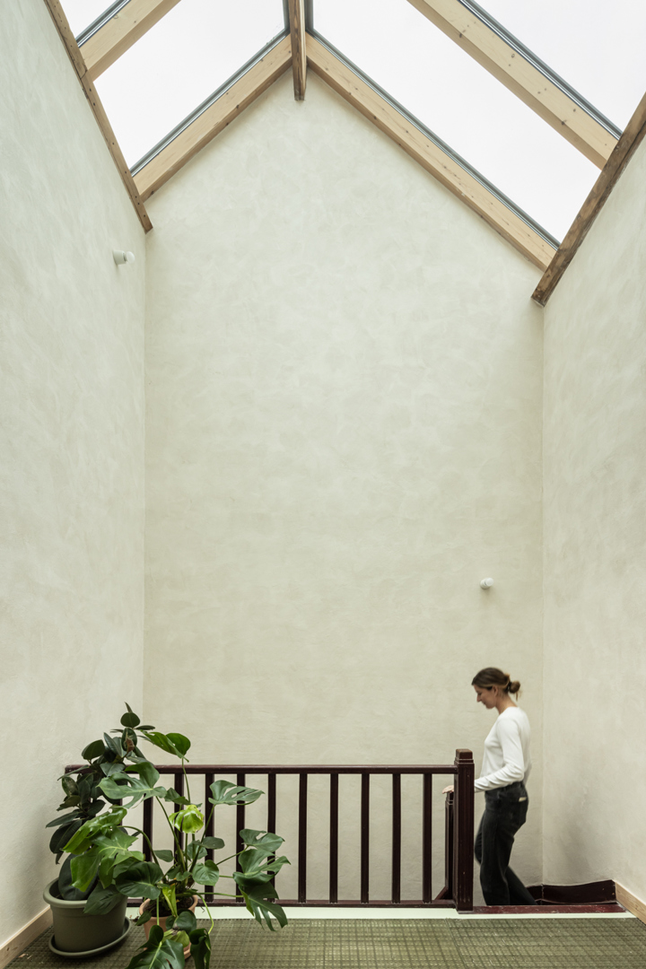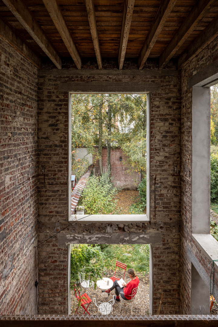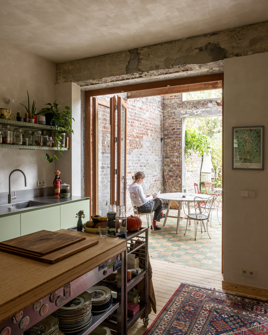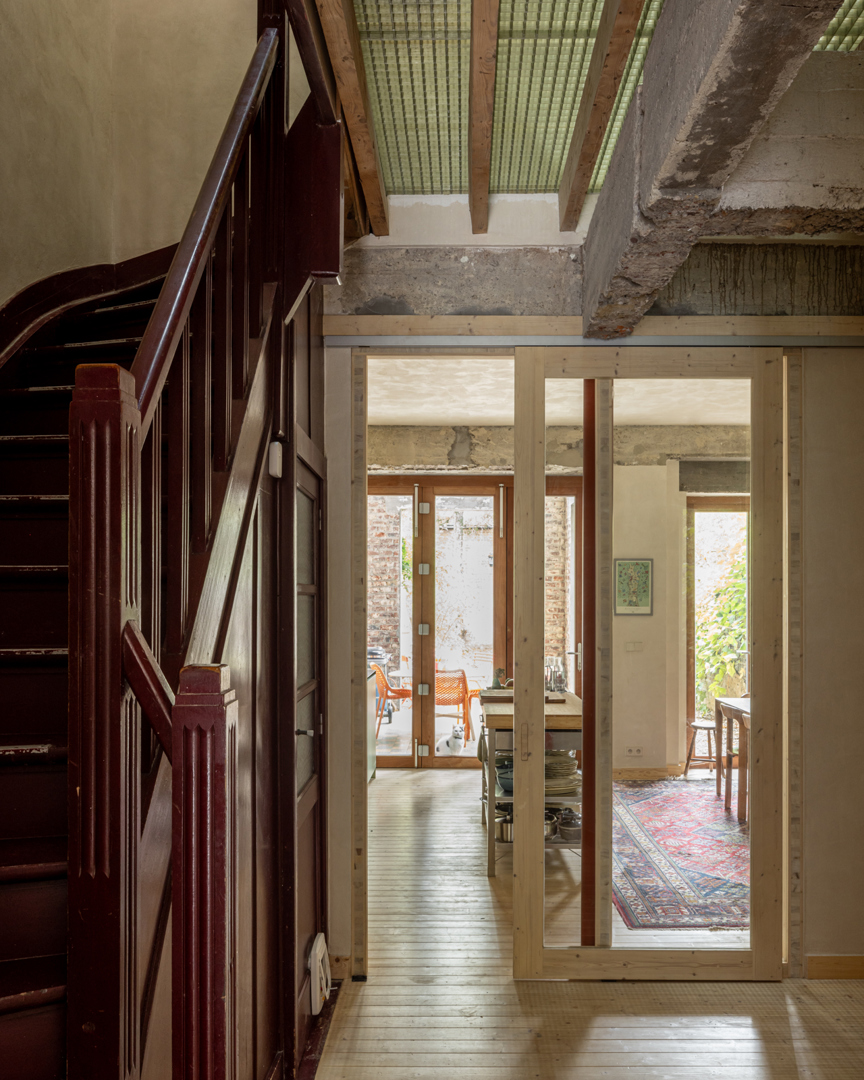 In de bestaande situatie splitst een gesloten circulatiekern de woning op in een voor- en achterkant. Door de bel-etage typologie was er geen connectie met de tuin. De uitdaging lag in de zoektocht naar meer connectie tussen de bestaande ruimtes onderling en de tuin. In de nieuwe situatie wordt de kern opengewerkt en geactiveerd. Via een groot daklicht komt licht binnen centraal in de woning, de kern wordt de spil tussen de verdiepen en de voor- en achterkant. De plankenvloer wordt vervangen door translucente roosters voor maximale lichtinval. De keuken verplaatst zich naar de gelijkvloers voor een grotere connectie met de tuin. Door de re-organisatie binnenin is de aanbouw overbodig, deze wordt een dubbelhoge overdekte buitenruimte, een waardevolle plek tussen binnen en buiten.