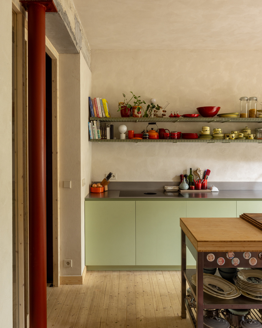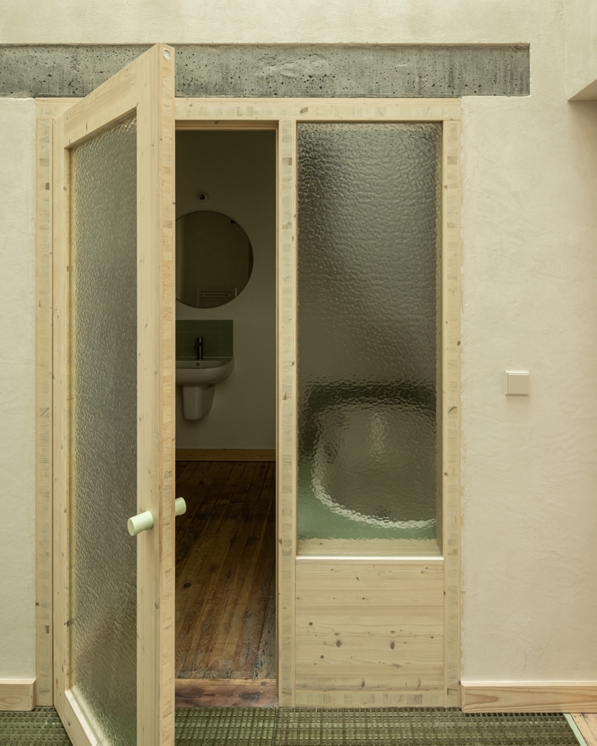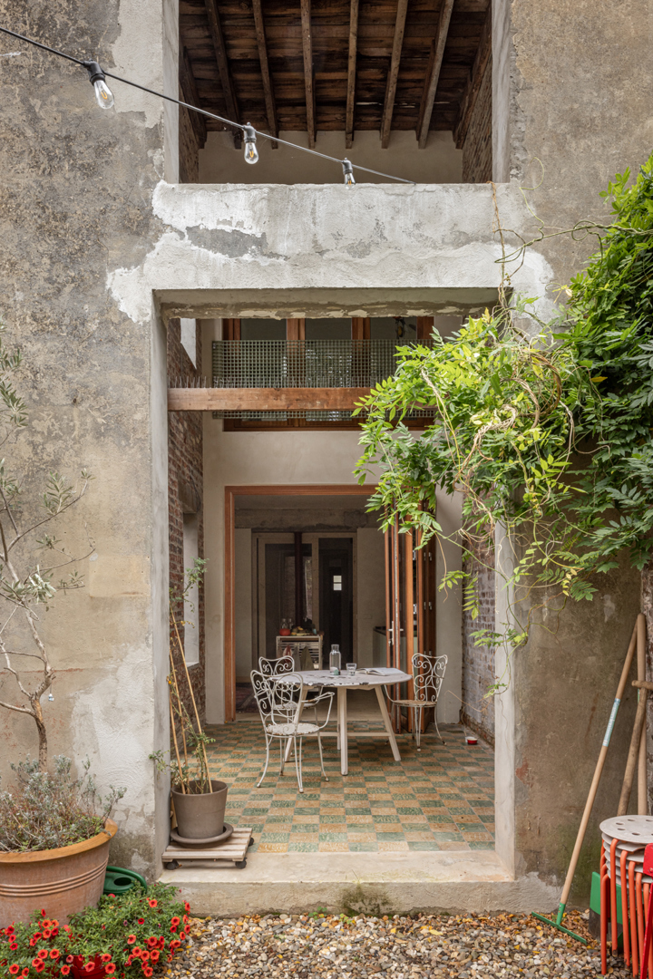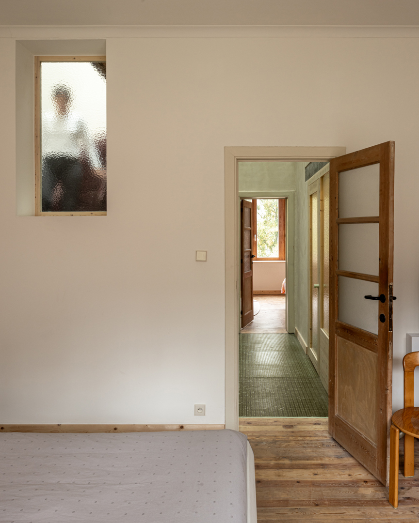 In de bestaande situatie splitst een gesloten circulatiekern de woning op in een voor- en achterkant. Door de bel-etage typologie was er geen connectie met de tuin. De uitdaging lag in de zoektocht naar meer connectie tussen de bestaande ruimtes onderling en de tuin. In de nieuwe situatie wordt de kern opengewerkt en geactiveerd. Via een groot daklicht komt licht binnen centraal in de woning, de kern wordt de spil tussen de verdiepen en de voor- en achterkant. De plankenvloer wordt vervangen door translucente roosters voor maximale lichtinval. De keuken verplaatst zich naar de gelijkvloers voor een grotere connectie met de tuin. Door de re-organisatie binnenin is de aanbouw overbodig, deze wordt een dubbelhoge overdekte buitenruimte, een waardevolle plek tussen binnen en buiten.