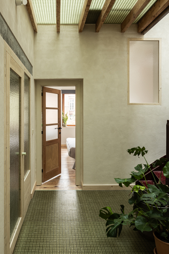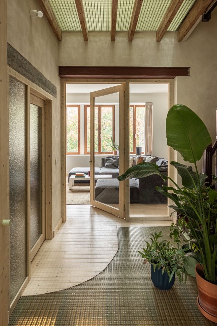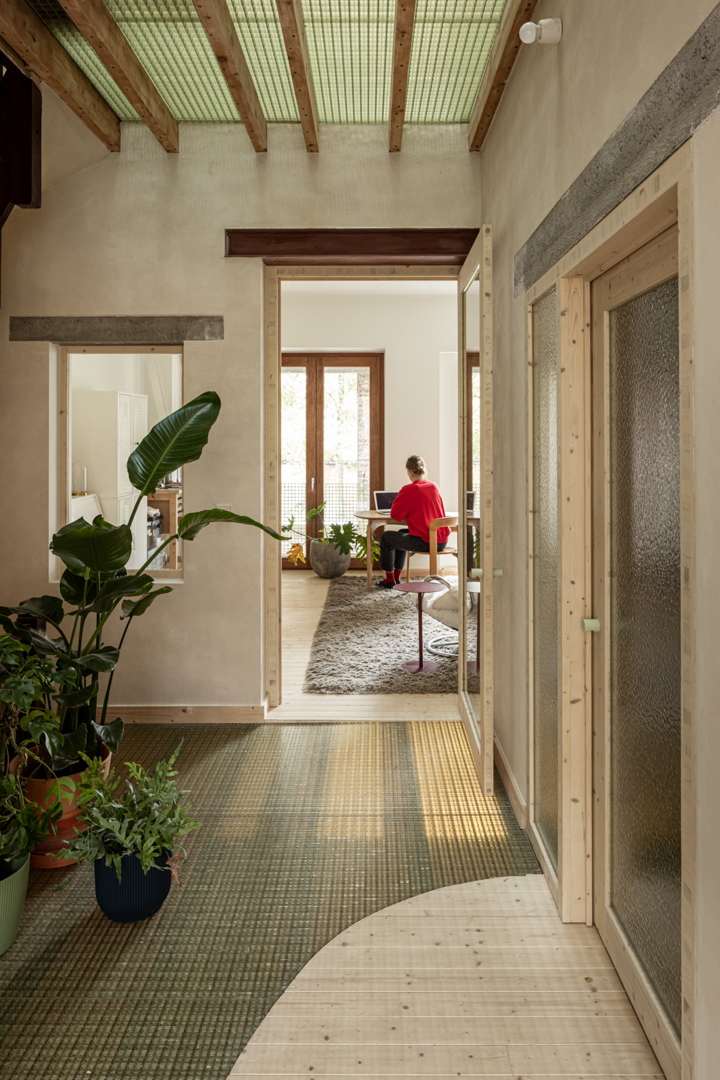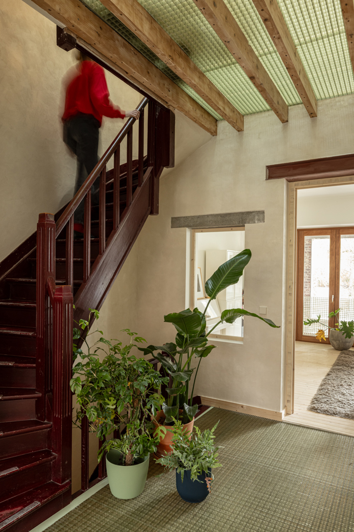 Doordat het project voornamelijk een interne reorganistie omvat, blijven de structurele ingrepen beperkt. Er wordt verder gebouwd op de bestaande structuur van de woning. Afbraak en bouwafval blijven hierdoor beperkt. De woning gaat verder op de bestaande logica. De natte ruimtes komen boven elkaar in de kern, wat efficiënt is in materiaalgebruik. De ruimtes rond de kern kunnen flexibel worden ingezet. Daarnaast wordt de woning ook compacter. Er wordt een overdekte dubbelhoge buitenruimte gecreërd waardoor het verwarmd volume kleiner wordt. In dit project wordt er ook gewerkt met ecologische isolatie- en afwerkingsmaterialen. De toegevoegde glasvezelroosters zijn herbruikbaar en makkelijk demonteerbaar.
