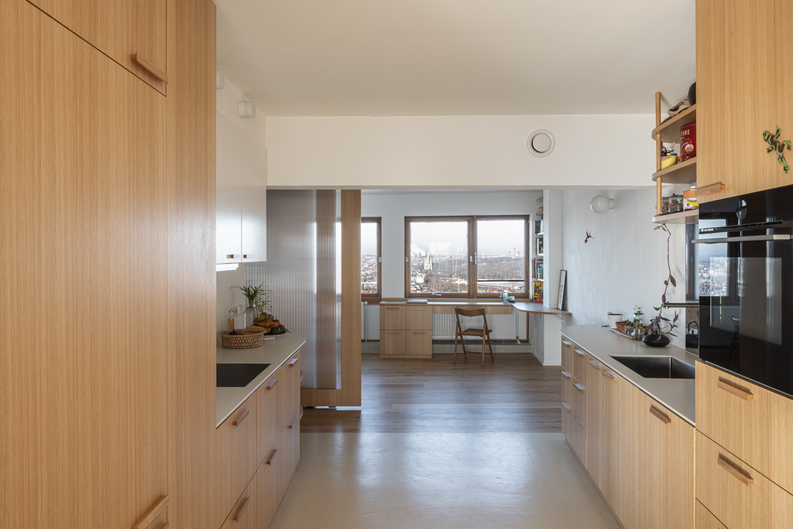 et project omvat de renovatie van een appartement van 120 m² in de toren Brusilia, met daarnaast de benutting van een ongebruikt oppervlak van ongeveer 30 m². Deze ruimte, oorspronkelijk bedoeld voor een nooit gerealiseerde uitbreiding, is toegankelijk via de aangrenzende zaal van de hoekappartementen. De ontwerpopdracht richt zich op het herdenken van de indeling, het optimaliseren van daglicht en het creëren van een functionele en comfortabele woning, waarbij de extra oppervlakte wordt geïntegreerd. Het project verandert zo een tot dan toe verloren zone in een volledig bruikbare woonruimte, met respect voor de bestaande structuur en de architecturale identiteit van de toren.
