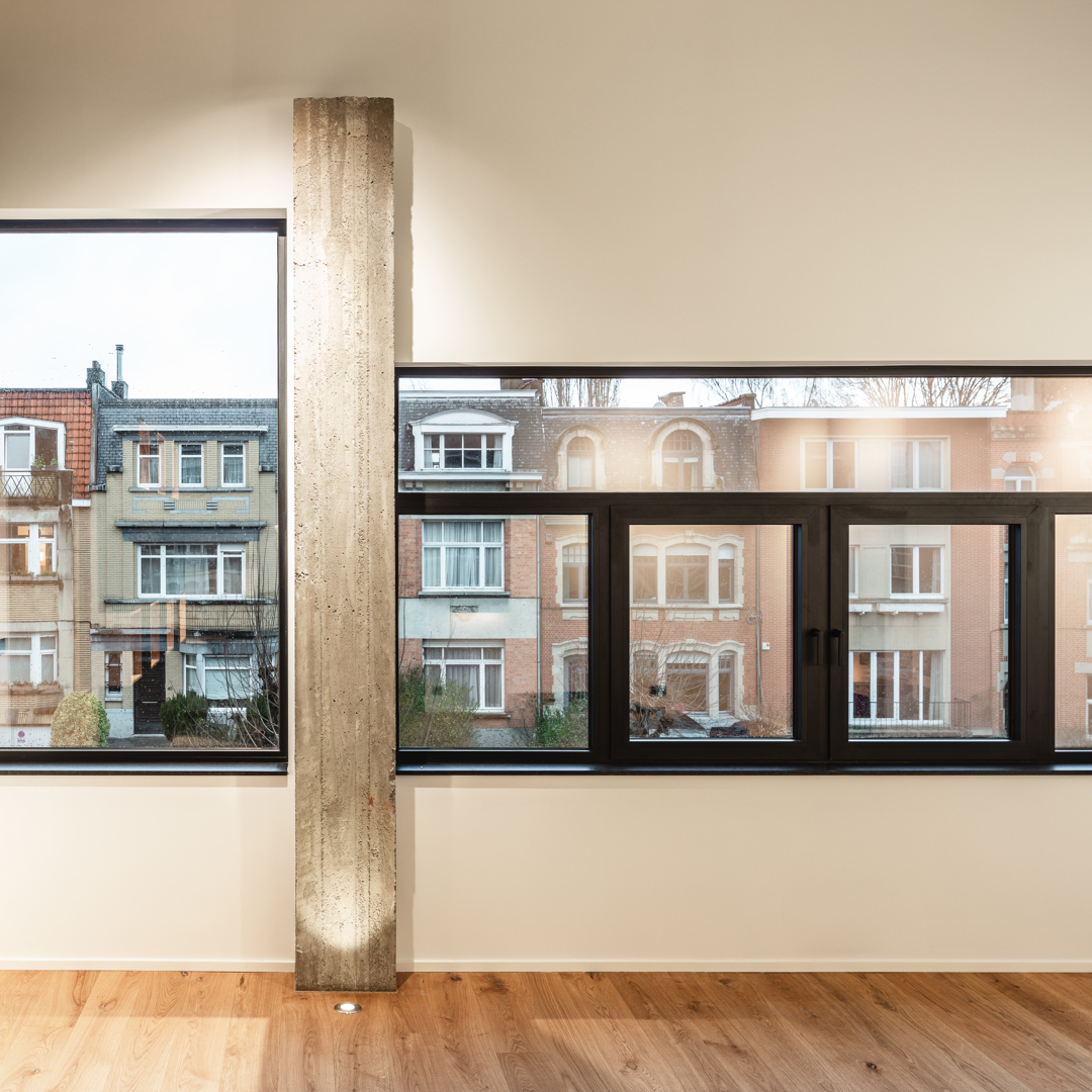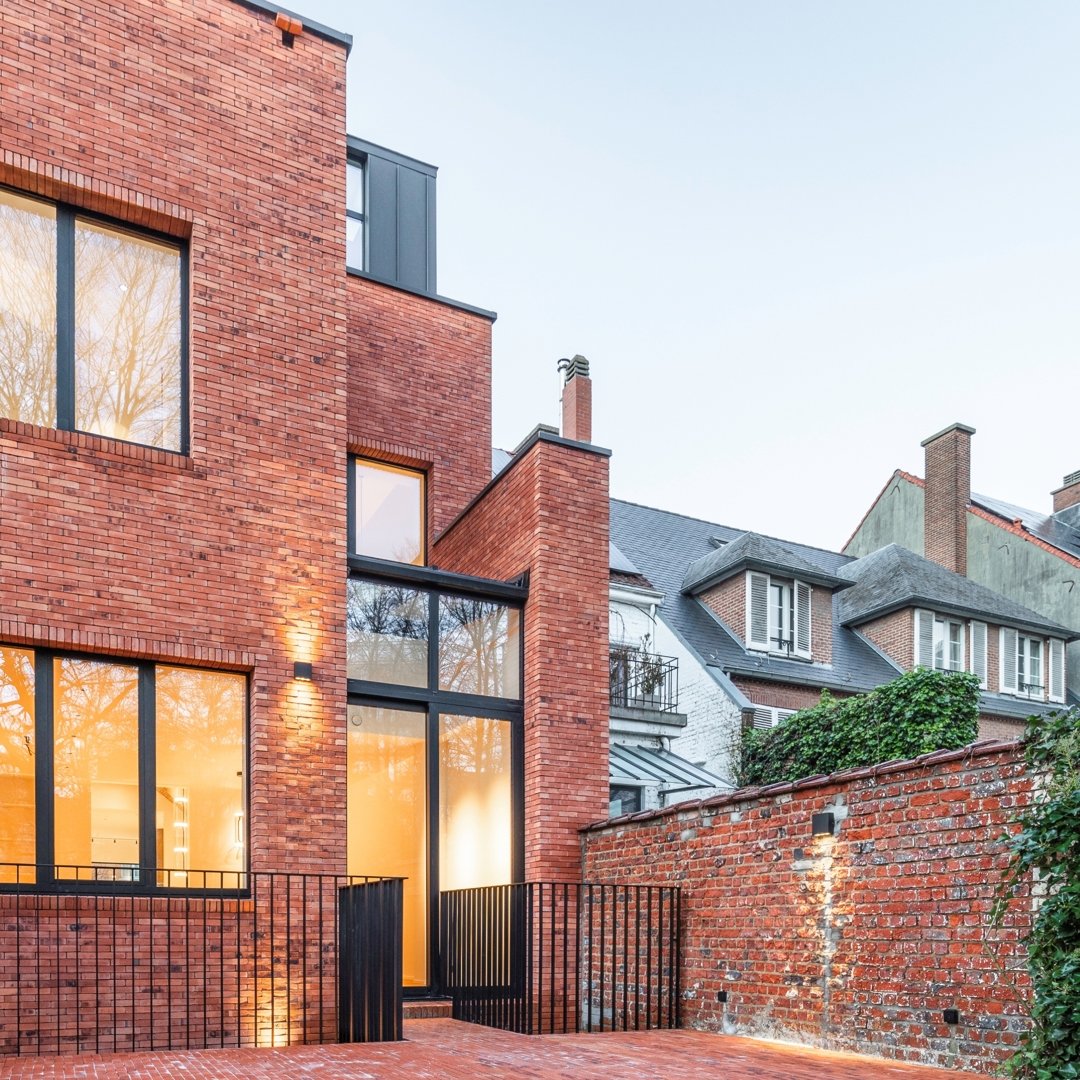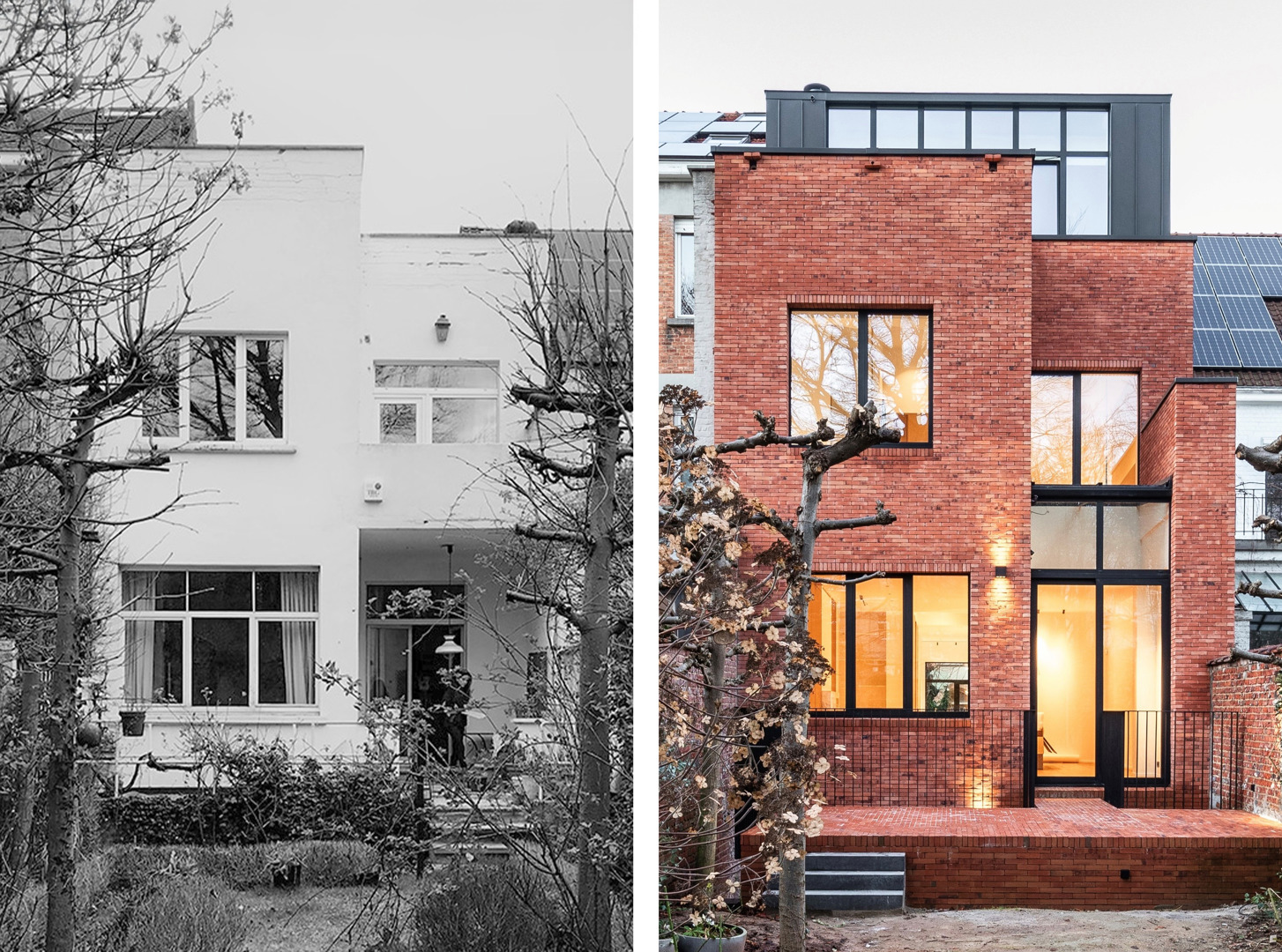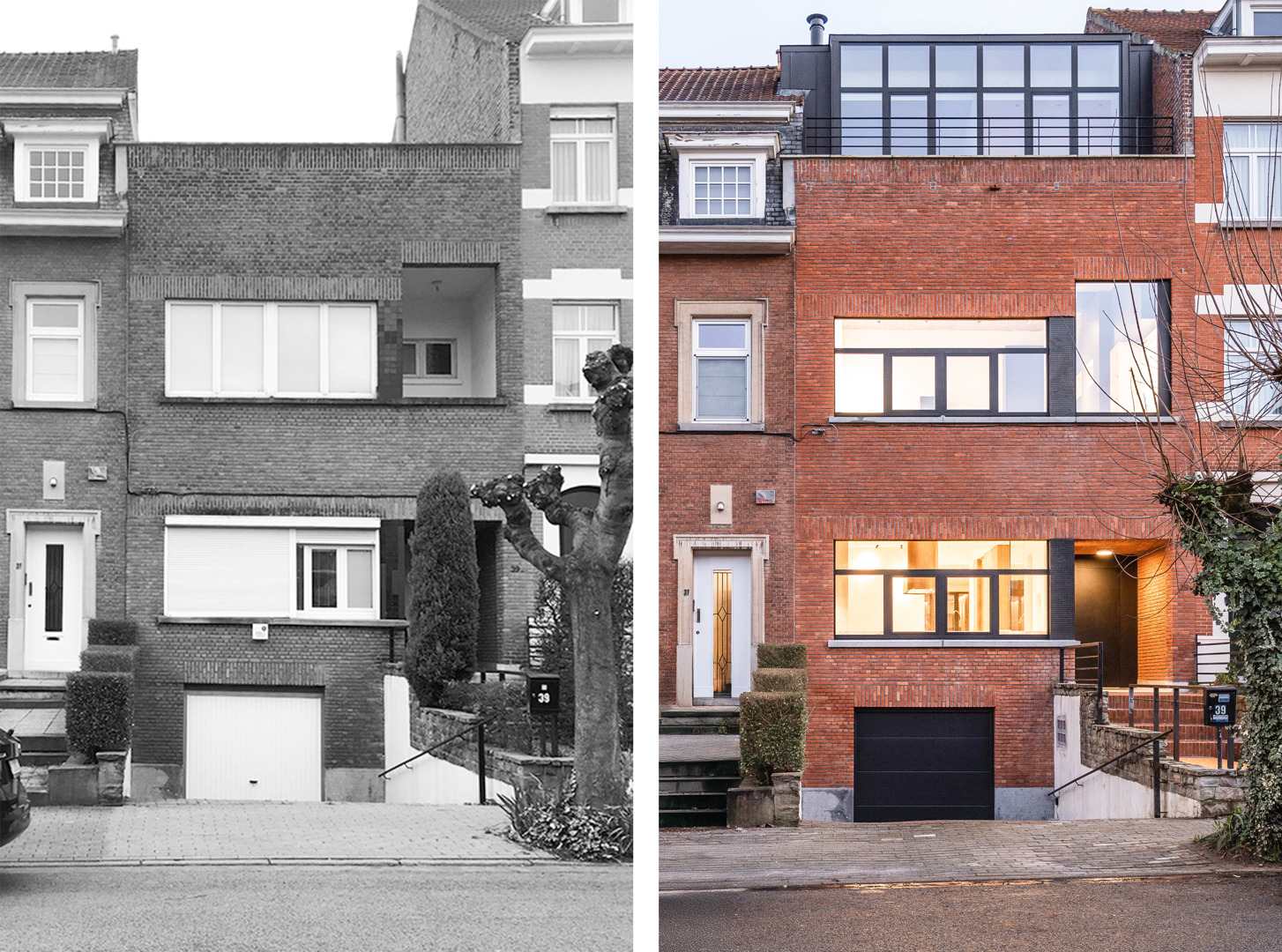 Transformeren zonder uit te wissen. Het project is gebaseerd op een woning ontworpen door architect Lambin in 1933, georganiseerd in drie traveeën en gestructureerd door een centrale trap die de ruimtes verdeelt. De opdracht is om dit compacte huis aan te passen aan een groot gezin terwijl de latente kwaliteiten van het gebouw worden onthuld. De ingreep articuleert drie uitdagingen: verdichten door verhoging, herorganiseren van de circulatiestromen, intensiveren van het natuurlijke licht. Het project past in een logica van minimale en precieze transformatie, waarbij de gevelcompositie, de zuivere volumes en de bestaande materialiteiten de basis worden van een hedendaagse uitstraling. De nieuwe ingreep verlengt het bestaande, verduidelijkt het plan en geeft het hart van het huis een ruimtelijke en lichte rol terug.