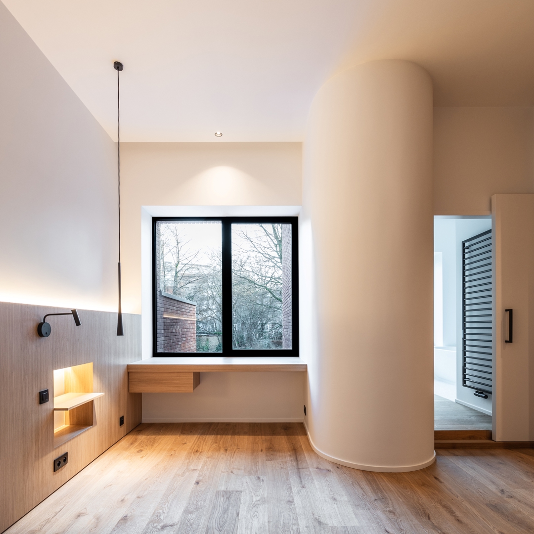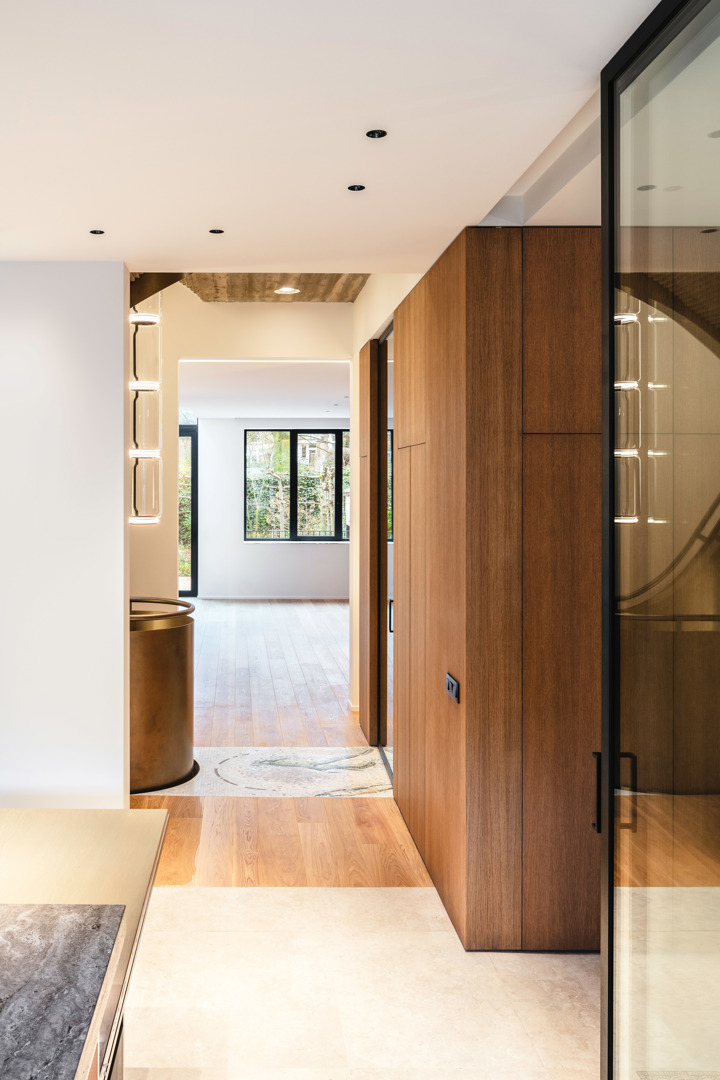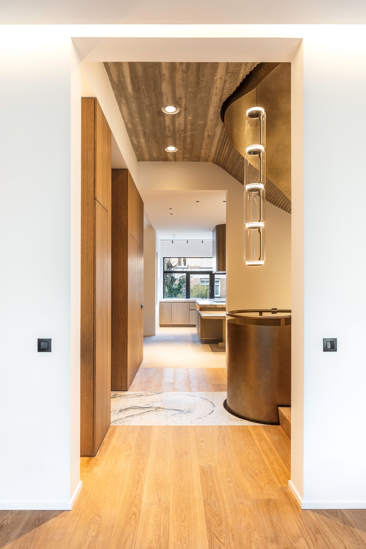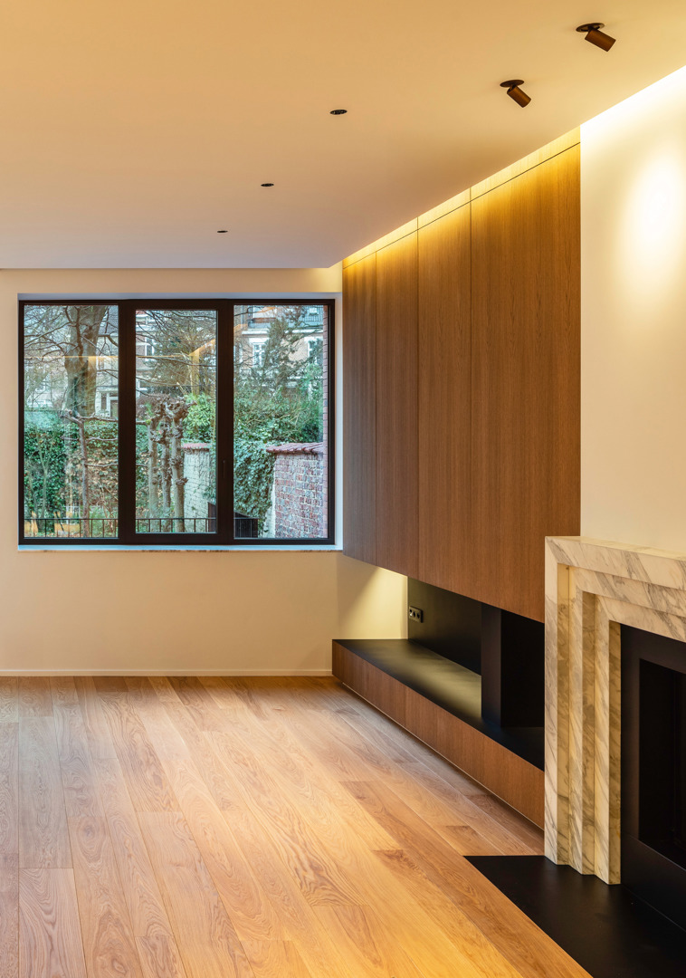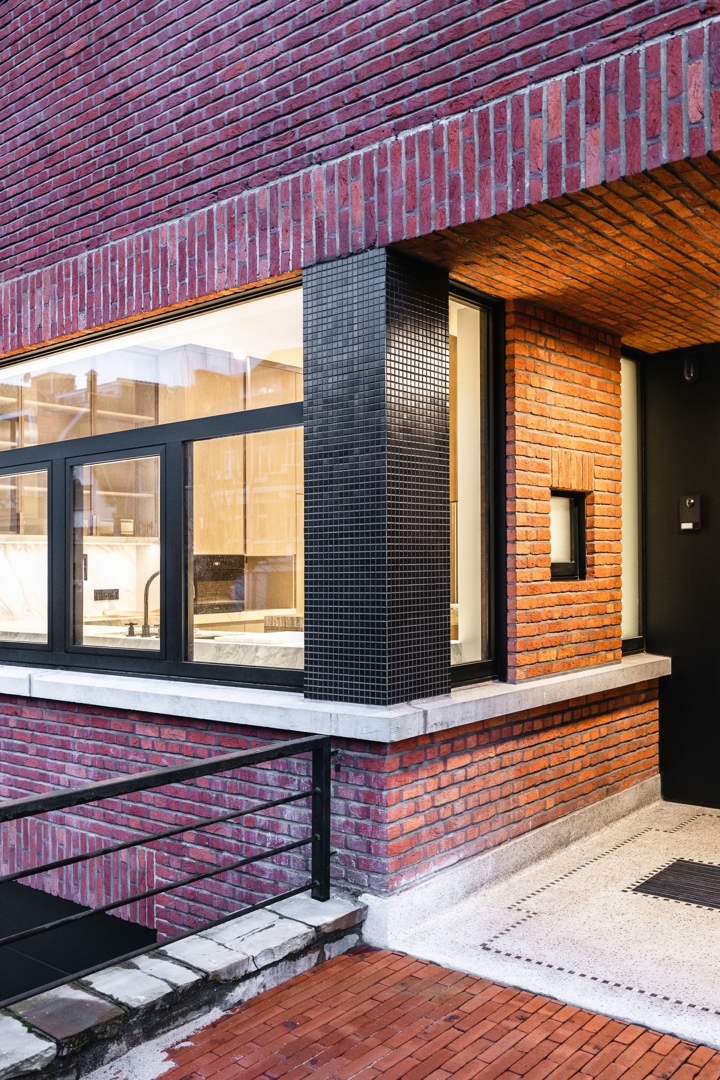 Een smal huis aanpassen aan een groot gezin, terwijl de identiteit behouden blijft, is de belangrijkste uitdaging. Het antwoord is een compacte verhoging, teruggetrokken aan de straatzijde, die verdicht zonder de bestaande compositie aan te tasten. De bepalende ingreep is de verplaatsing van de trap. Door de centrale travee vrij te maken, verbindt het de ruimtes opnieuw, herstelt het de doorsteek en creëert het een verticaal lichtgevend vide. De trap wordt een constante lichtput die helderheid en diepte naar de kelders brengt. De achtergevel is opnieuw geconfigureerd om deze strategie te versterken: glazen serre op de woonkamer, diep ingegraven binnenplaats. Het geheel transformeert een beperkte structuur in een vloeiende, doorkruisende en lichte ruimtelijke sequentie.