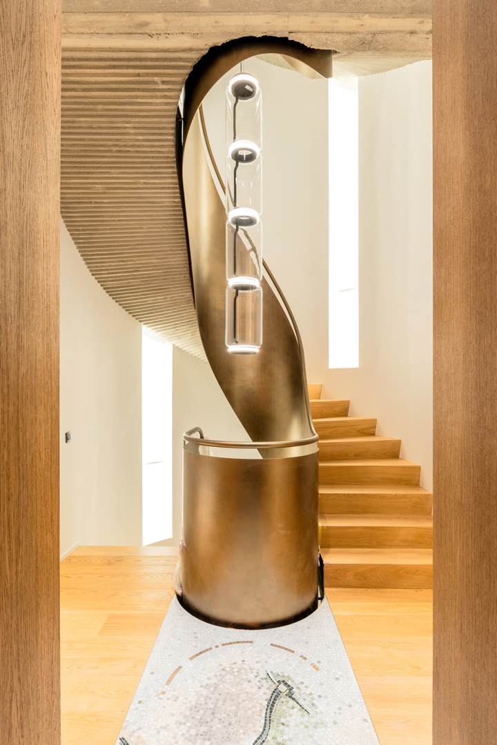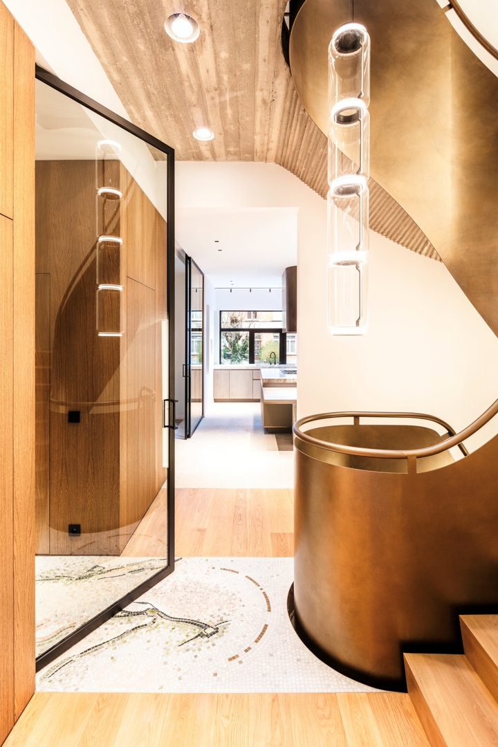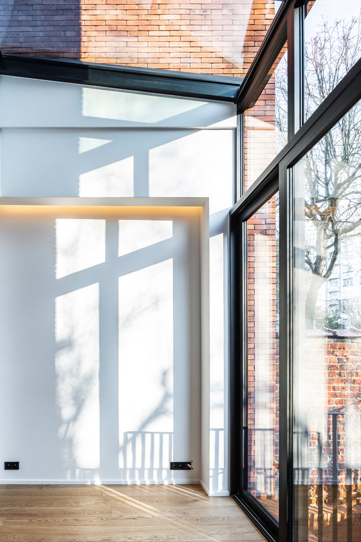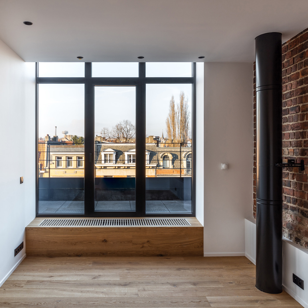 Een smal huis aanpassen aan een groot gezin, terwijl de identiteit behouden blijft, is de belangrijkste uitdaging. Het antwoord is een compacte verhoging, teruggetrokken aan de straatzijde, die verdicht zonder de bestaande compositie aan te tasten. De bepalende ingreep is de verplaatsing van de trap. Door de centrale travee vrij te maken, verbindt het de ruimtes opnieuw, herstelt het de doorsteek en creëert het een verticaal lichtgevend vide. De trap wordt een constante lichtput die helderheid en diepte naar de kelders brengt. De achtergevel is opnieuw geconfigureerd om deze strategie te versterken: glazen serre op de woonkamer, diep ingegraven binnenplaats. Het geheel transformeert een beperkte structuur in een vloeiende, doorkruisende en lichte ruimtelijke sequentie.