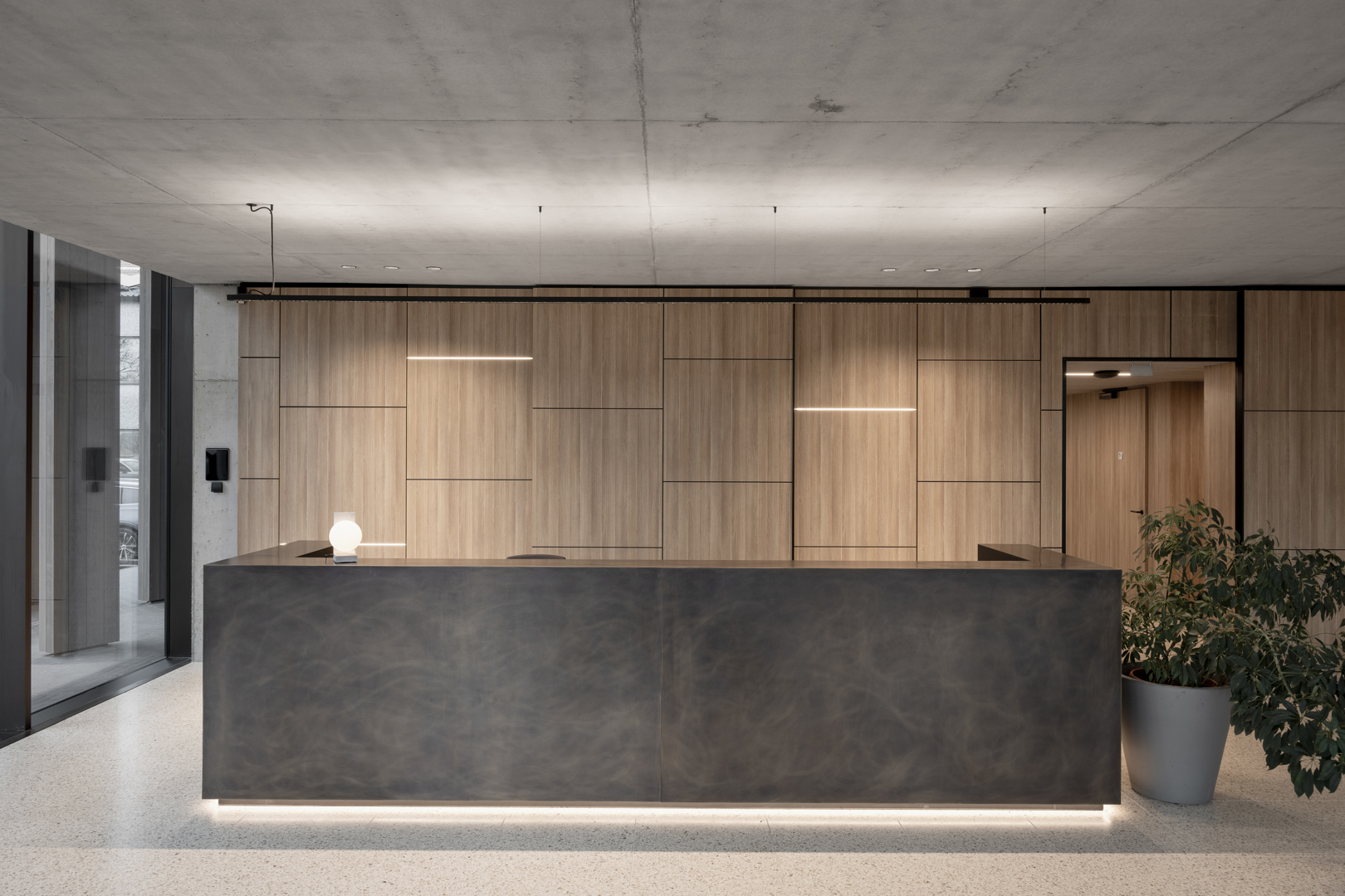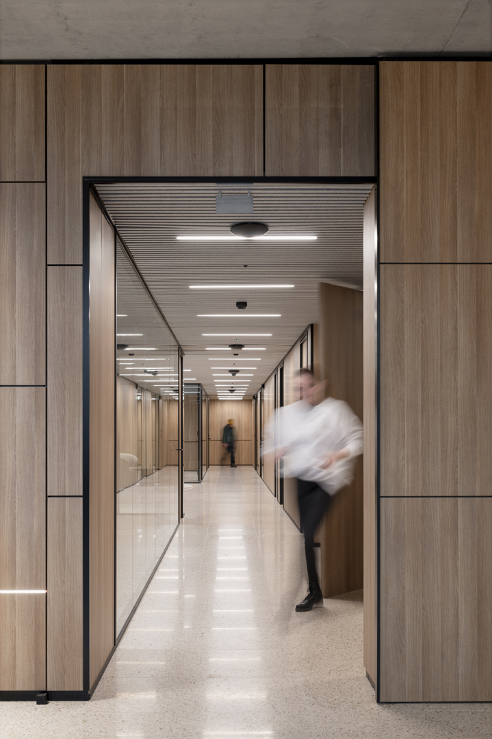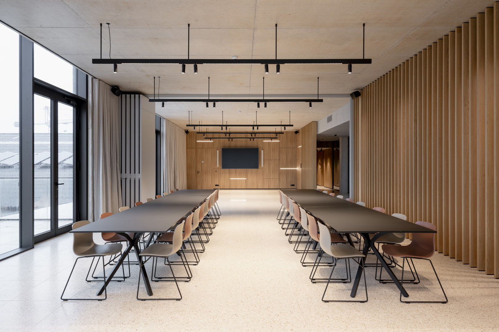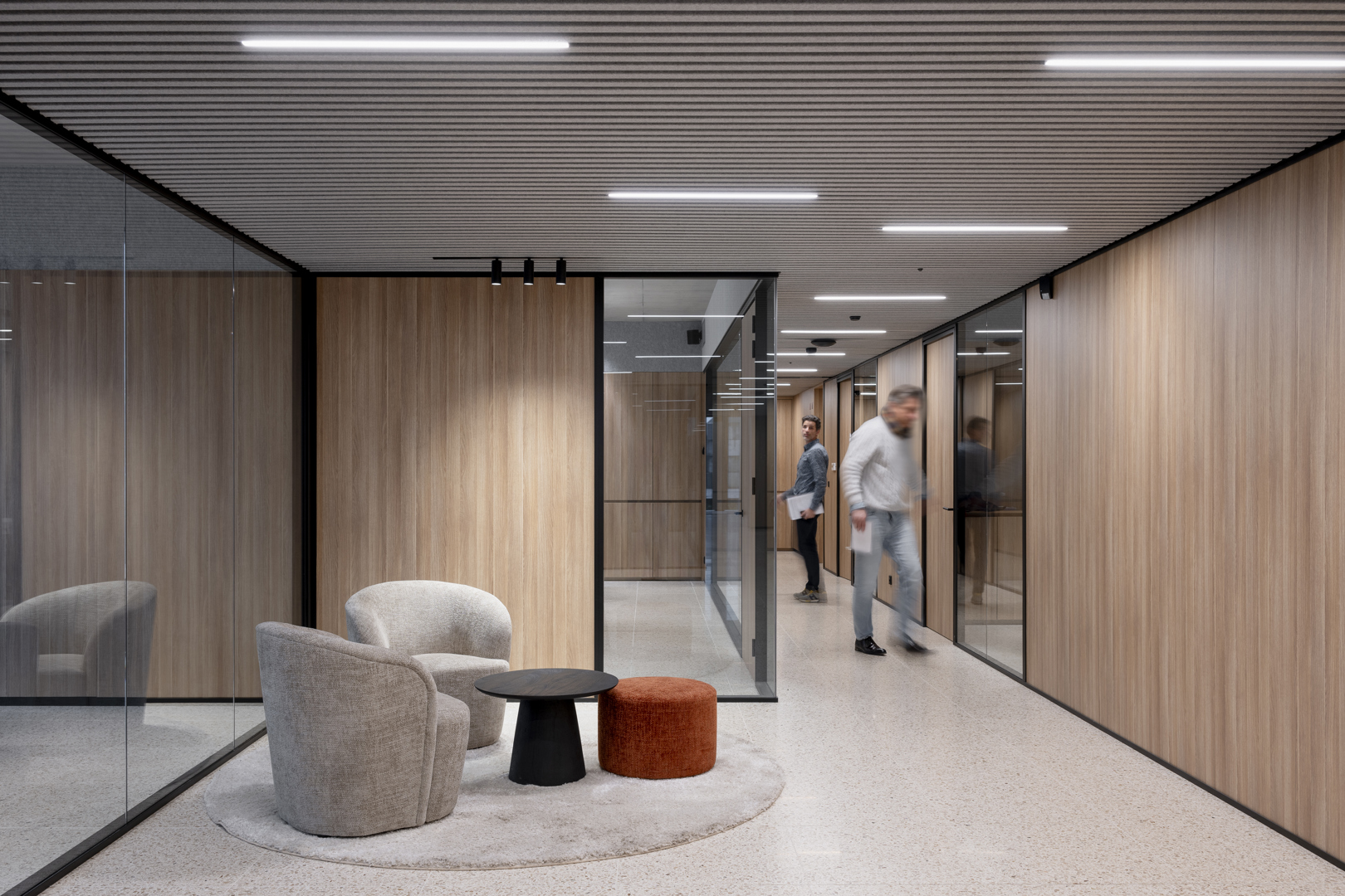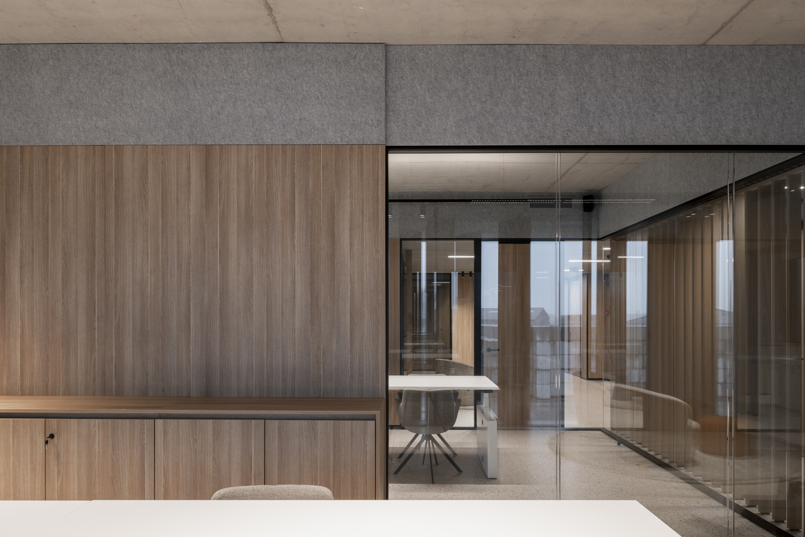 De grootste uitdaging lag in het beheersen van de akoestiek binnen een gebouw met overwegend harde materialen en hoge transparantie. In samenwerking met studiebureau Defonseca en Triplaco werd gezocht naar oplossingen die comfort garanderen zonder in te boeten op het concept. Door de vereiste tegelvloer, zichtbare betonplafonds voor betonkernactivering en glazen wanden bleef weinig ruimte voor klassieke ingrepen. Daarom werden gerichte akoestische toepassingen geïntegreerd, zoals nanogeperforeerde wand- en kastpanelen en viltafwerkingen op strategische plaatsen. Zo werd een evenwicht bereikt tussen openheid, esthetiek en akoestisch comfort.
