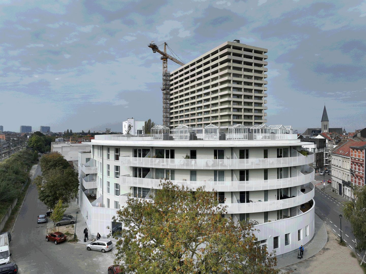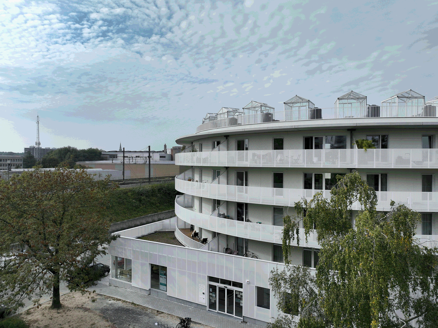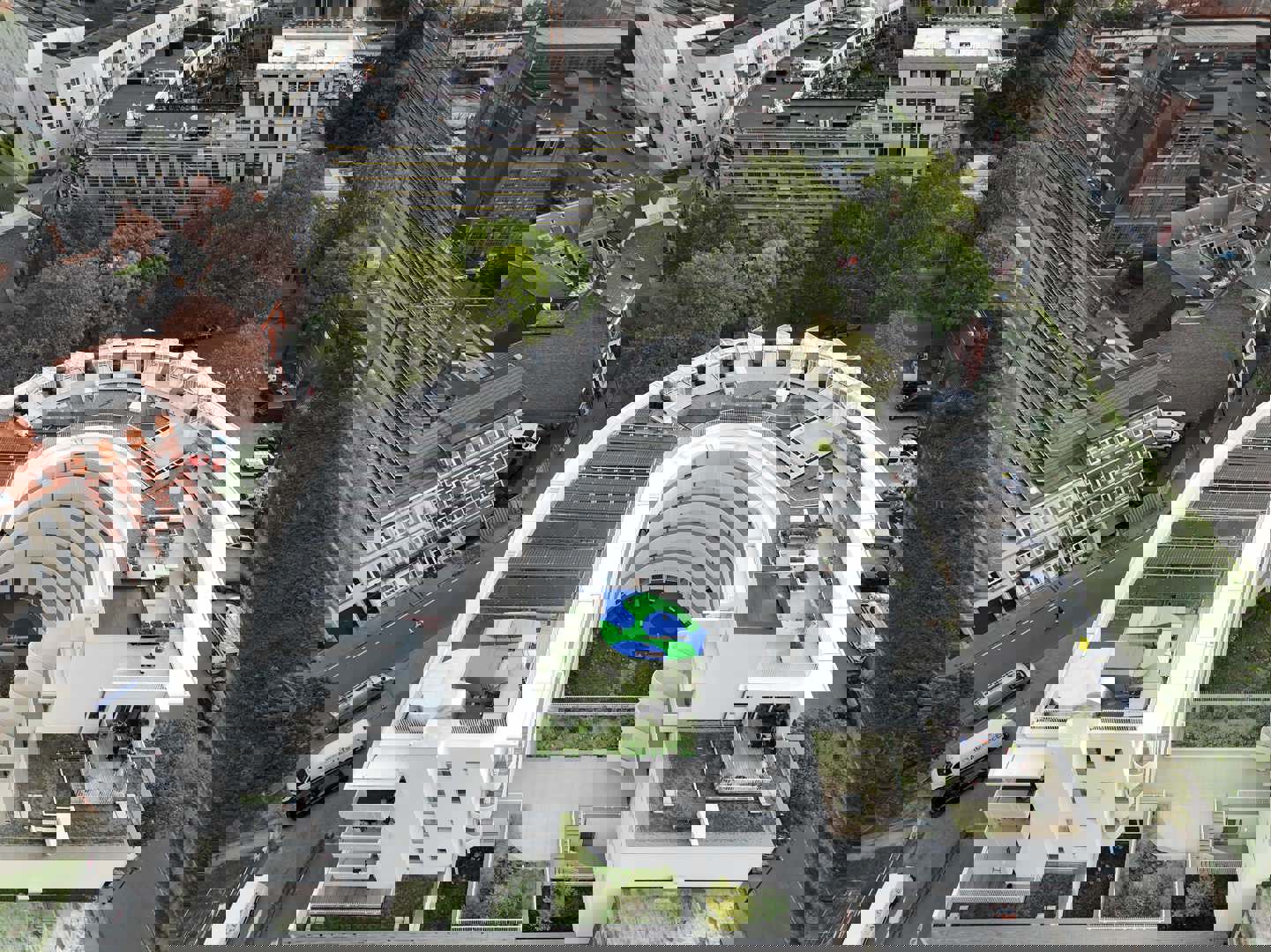 De grootste uitdaging was om een gebouw te ontwerpen dat een nieuw stadsdeel vorm zou geven en tegelijkertijd zeer uiteenlopende functies zou integreren. Het project heeft de vorm van een hoefijzer, waardoor een beschermd binnenplein ontstaat en een dialoog met het nieuwe openbare plein tot stand komt. Dankzij deze eenvoudige maar uitgesproken geometrie wordt het gebouw een herkenbaar stadsoriëntatiepunt in de wijk. Het gezondheidscentrum is gevestigd op de begane grond om de zichtbaarheid en toegankelijkheid te waarborgen. De kolom-balkconstructie en de lichte scheidingswanden bieden een grote flexibiliteit en maken toekomstige aanpassingen van de ruimtes mogelijk.