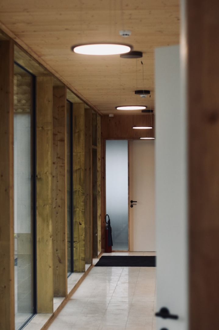 Om nul energie te bereiken, stond bioklimatische ontwerp centraal: een gangbroeikas fungeert als bufferzone, zorgt voor warmte in de winter en beperkt oververhitting in de zomer dankzij de zonwering. De performante schil garandeert niveaus die gelijkwaardig zijn aan een nieuw gebouw. De vermindering van de CO2-voetafdruk is gebaseerd op een CLT-structuur, bio-gebaseerde isolatie (cellulose en houtvezels) en scheidingswanden van graswol. Circulariteit vertaalt zich in een nauwkeurige inventaris en het hergebruik van symbolische elementen: radiatoren omgebouwd tot leuningen, opnieuw geplaatste granieten treden, bewaarde sanitaire voorzieningen, hergebruik van tegels en platen. Het geheel vormt een warme, lichte en coherente architectuur.