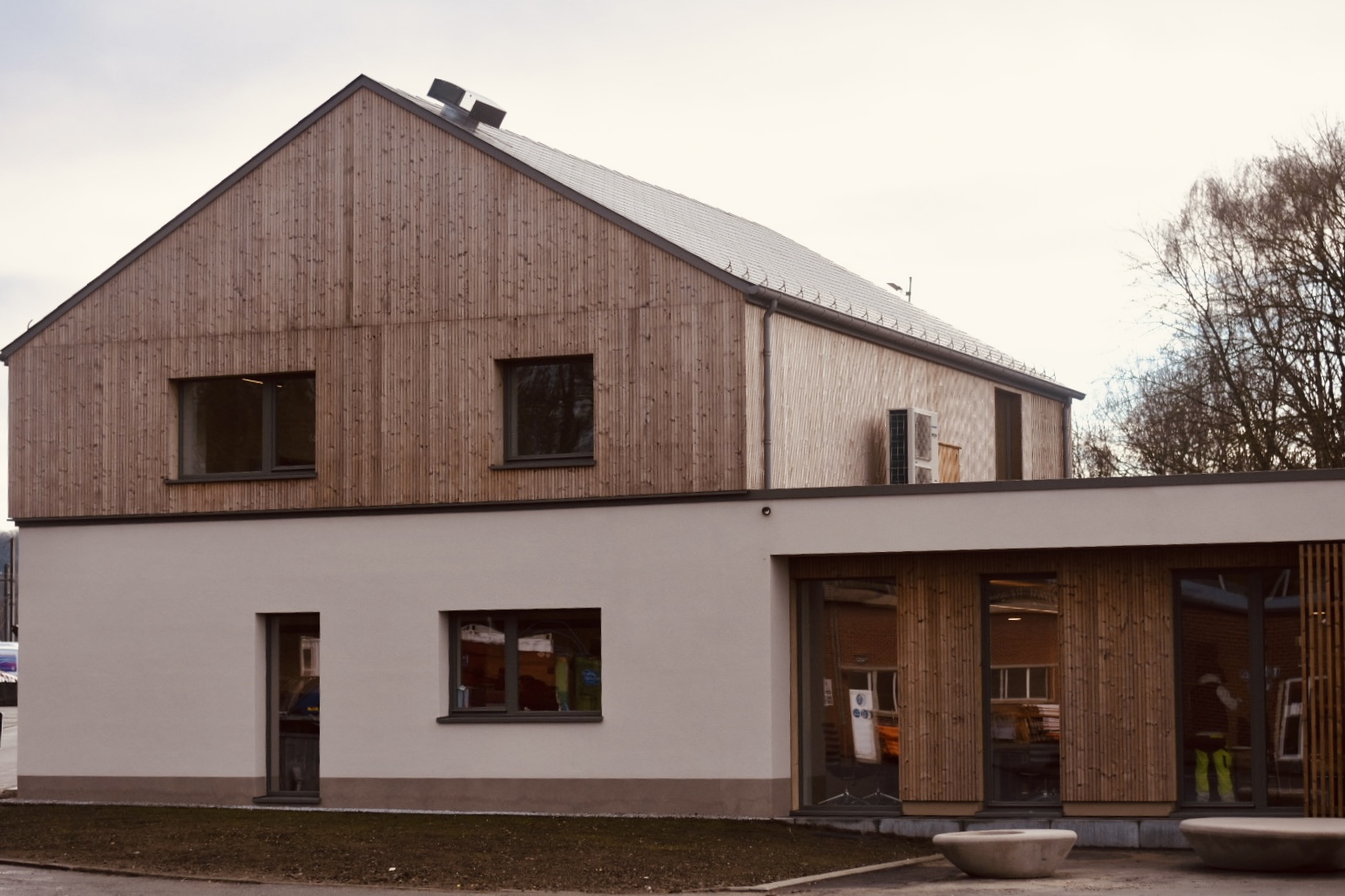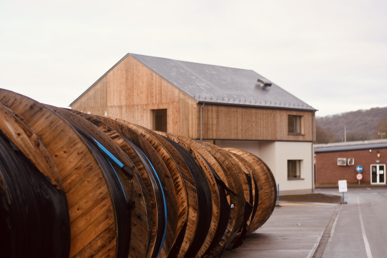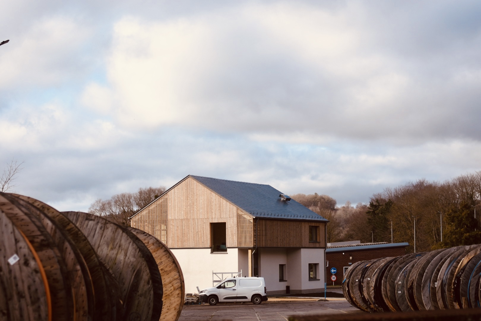 Proximus Real Estate wilde zijn logistieke site in Flawinne volledig herdenken door de verwarmde ruimtes te groeperen in de oude conciërgewoning. De ambitie was om er een voorbeeldig project van te maken rond drie doelstellingen: nul energie bereiken, circulariteit maximaliseren en fossiele brandstoffen elimineren. Als architecten mochten we vrij de meest relevante strategie voorstellen: sloop, wederopbouw of transformatie. De keuze viel op een transformatie met uitbreiding, geleid door de methode van de 3R's: verminderen, recyclen, hergebruiken om het bestaande te behouden en de CO2-impact te beperken.