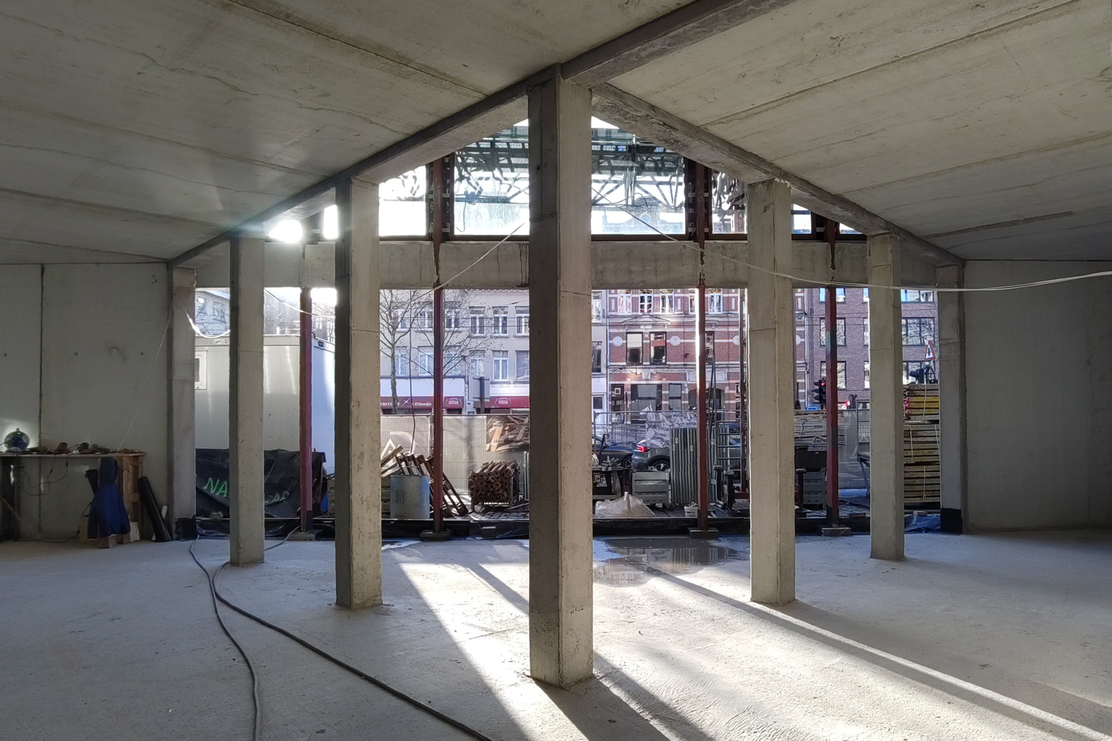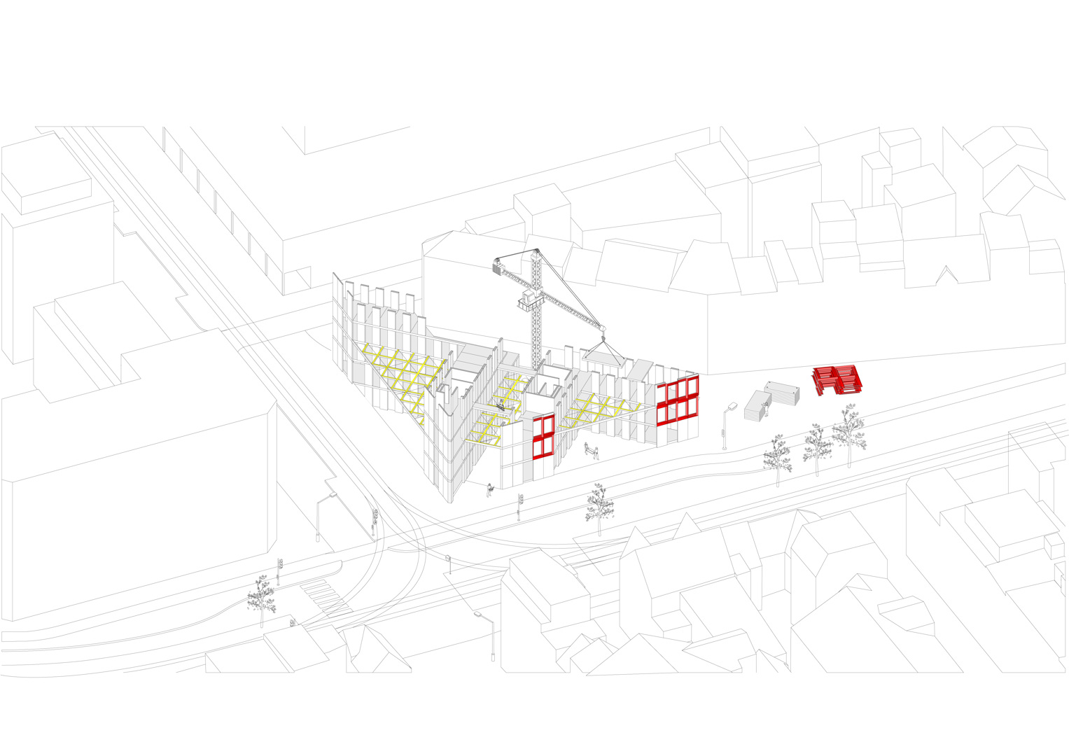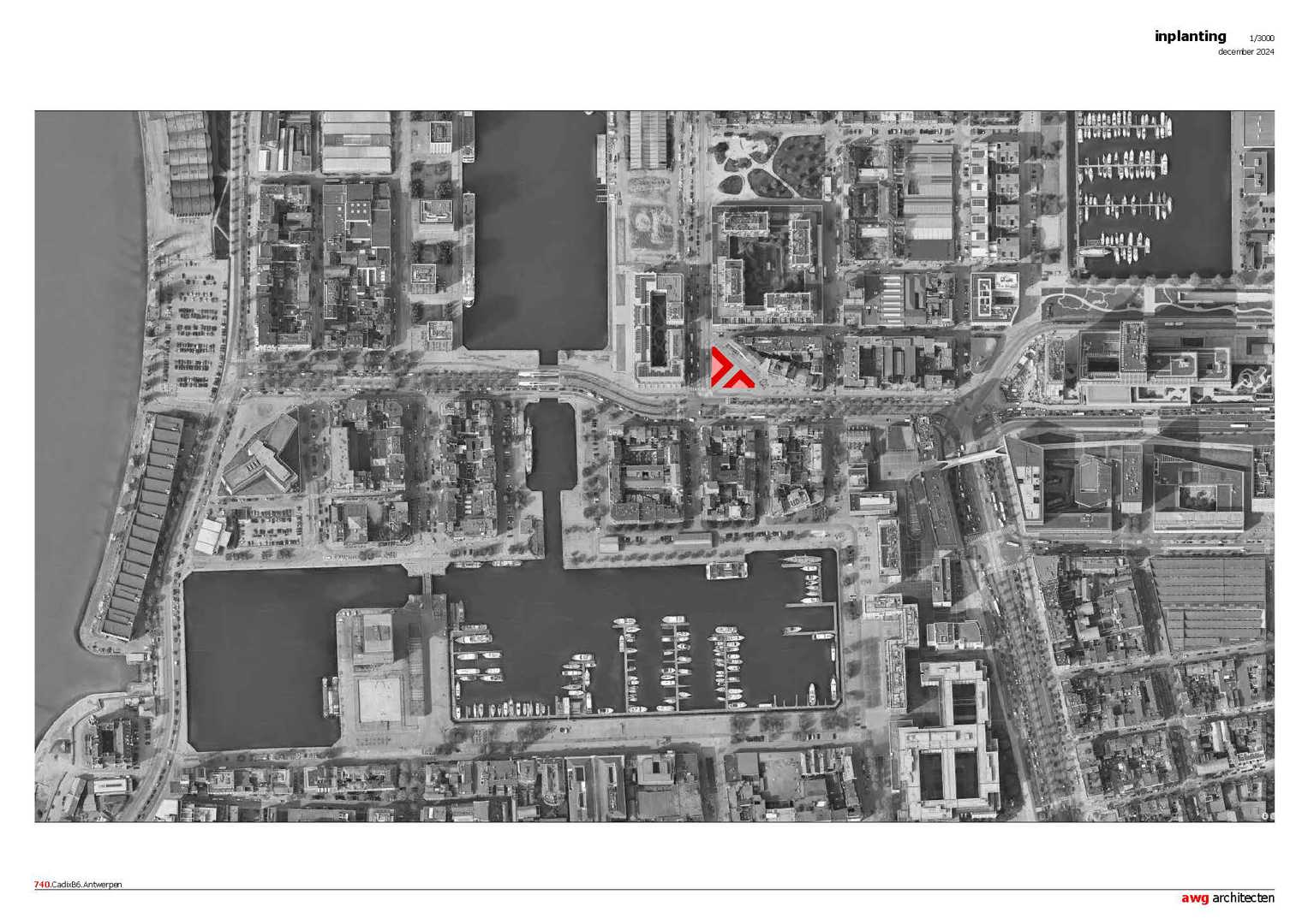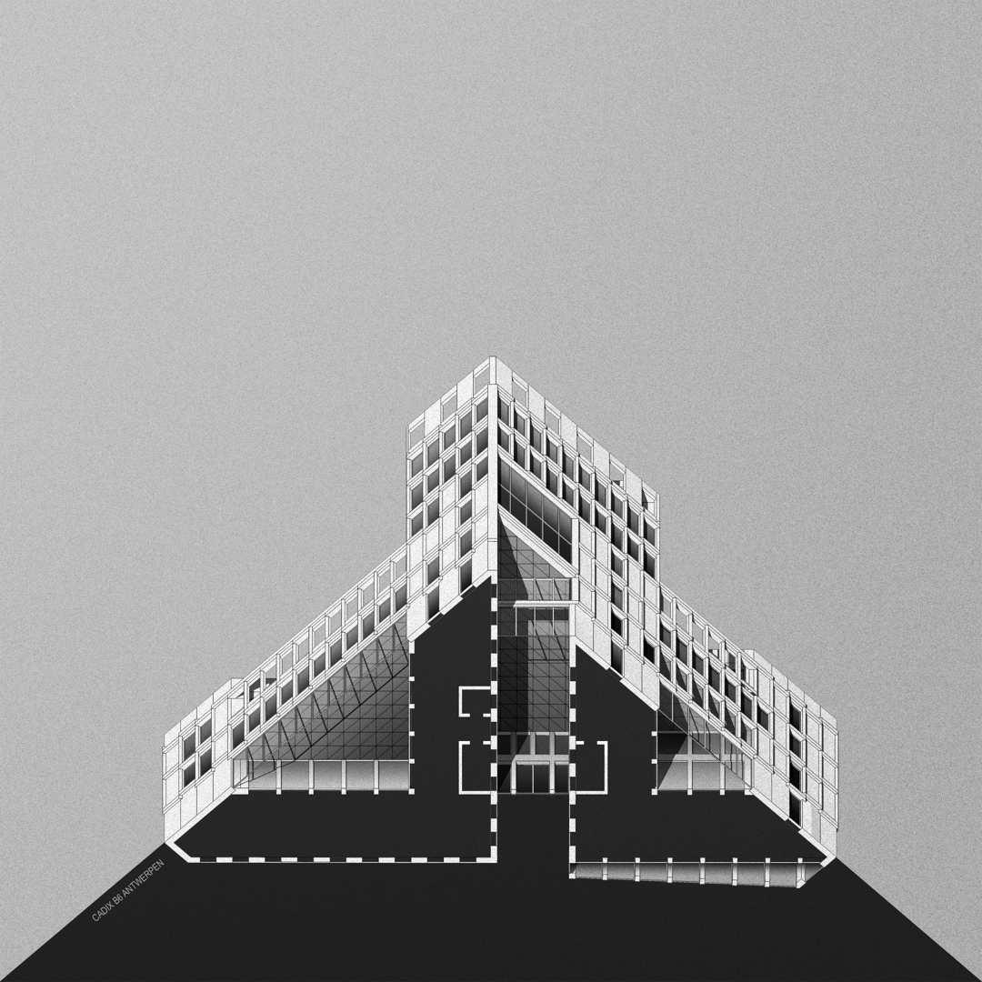 Winnend wedstrijdontwerp (voor AG Vespa/Stad Antwerpen en Van Wellen RED) voor een kantoorgebouw van 3.500m² met een gemengd stedelijk programma in de plint. Het gebouw bevindt zich op een scharnierpunt van het Eilandje in Antwerpen en verbindt de Cadix wijk met de Oude Dokken. De robuuste pakhuisarchitectuur van het Eilandje, met z’n overdekte straten (cfr. Felix pakhuis) als helder ordenend principe, zijn hierbij bijzonder inspirerend. De geometrie van de plek is mede bepaald door de driehoekige vorm van het perceel. Het project houdt het midden tussen een bouwblok afmaken en een solitair gebouw realiseren. Verder ambieert het ontwerp een programmatorisch totaalconcept, waarbij het inzet op synergiën tussen functies over verdiepingen heen. Hierdoor creëert het project een levendige hub