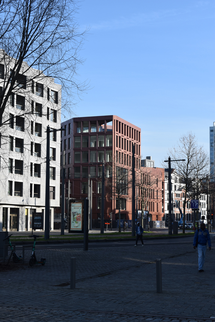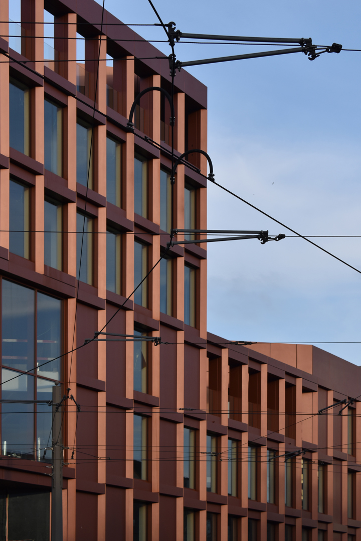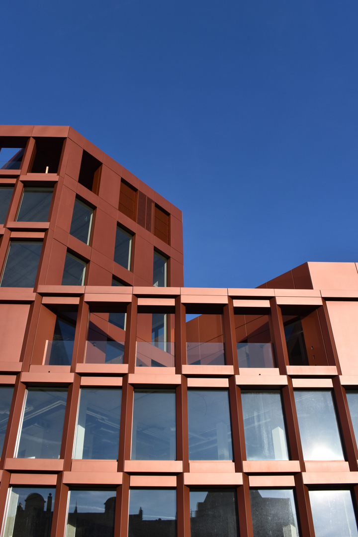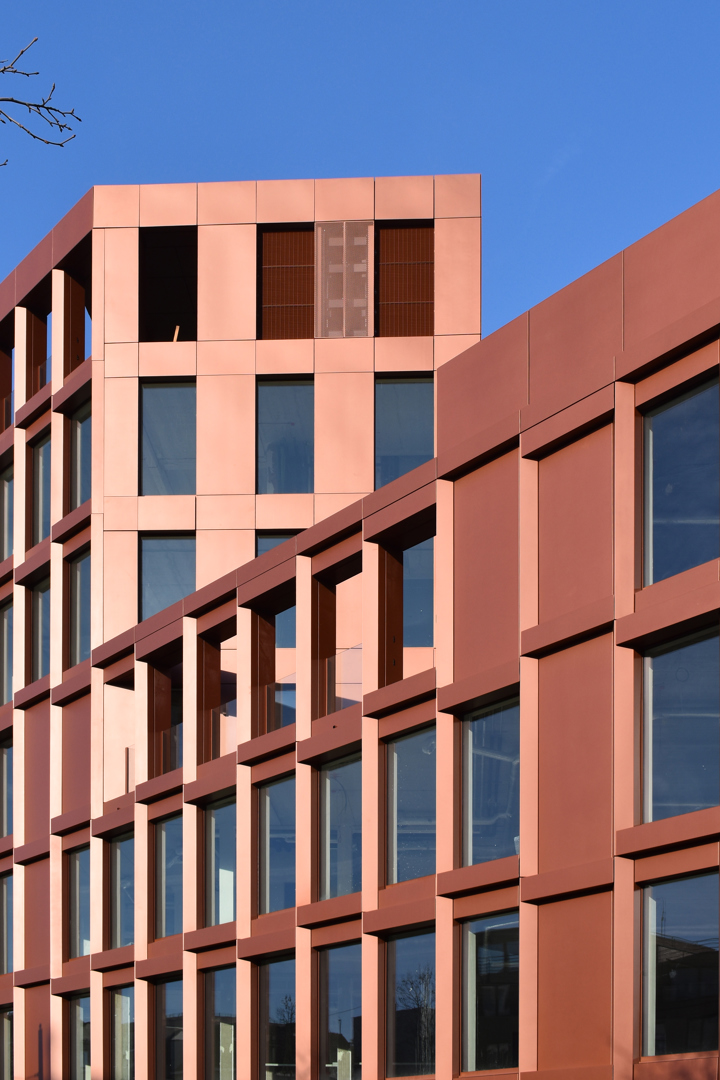De belangrijkste uitdaging was het verzoenen van de complexe, driehoekige site met uiteenlopende schaalniveaus en stedelijke contexten. Het getrapt volume met een hoekaccent maakt het mogelijk om de beide schaalgroottes met elkaar te verbinden inclusief genereuze dakterrassen. Het thema van de driehoek werd zowel in plan, casco/structuur als detaillering tot een voordeel omgebogen; het plan omvat twee L-vormige volumes rond een centrale, publieke tussenruimte welke zorgen voor structuur, doorzichten en levendigheid en de monochrome rood koperen gevelbekleding speelt in op de grafiek van de driehoek. Ook flexibiliteit was cruciaal. Dankzij een modulaire gevel en rationele draagstructuur kan het gebouw inspelen op toekomstige functiewijzigingen, wat de duurzaamheid en levensduur versterkt.