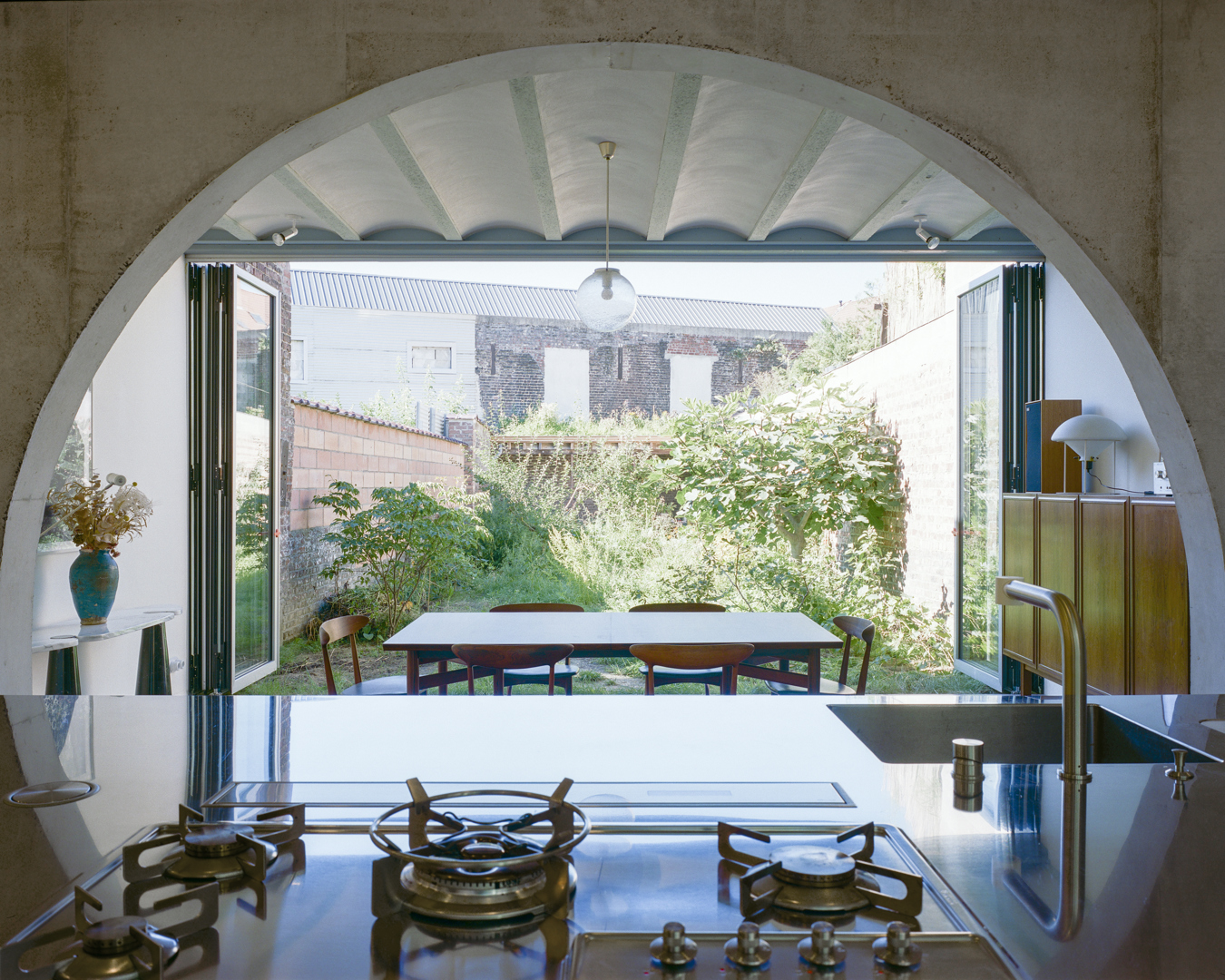 Een moeilijk bereikbare site, omringd door gemene muren, vroeg om radicale helderheid in organisatie en constructie. We introduceerden patio’s als ruimtelijke motoren die daglicht en ventilatie tot in het hart van de woning brengen. Logistieke beperkingen stimuleerden een doorgedreven circulaire aanpak: materialen uit de sloop en tweedehandsstromen werden integraal onderdeel van structuur en afwerking. Wat een beperking leek, werd een ontwerpinstrument dat leidde tot precisie, eenvoud en samenhang.