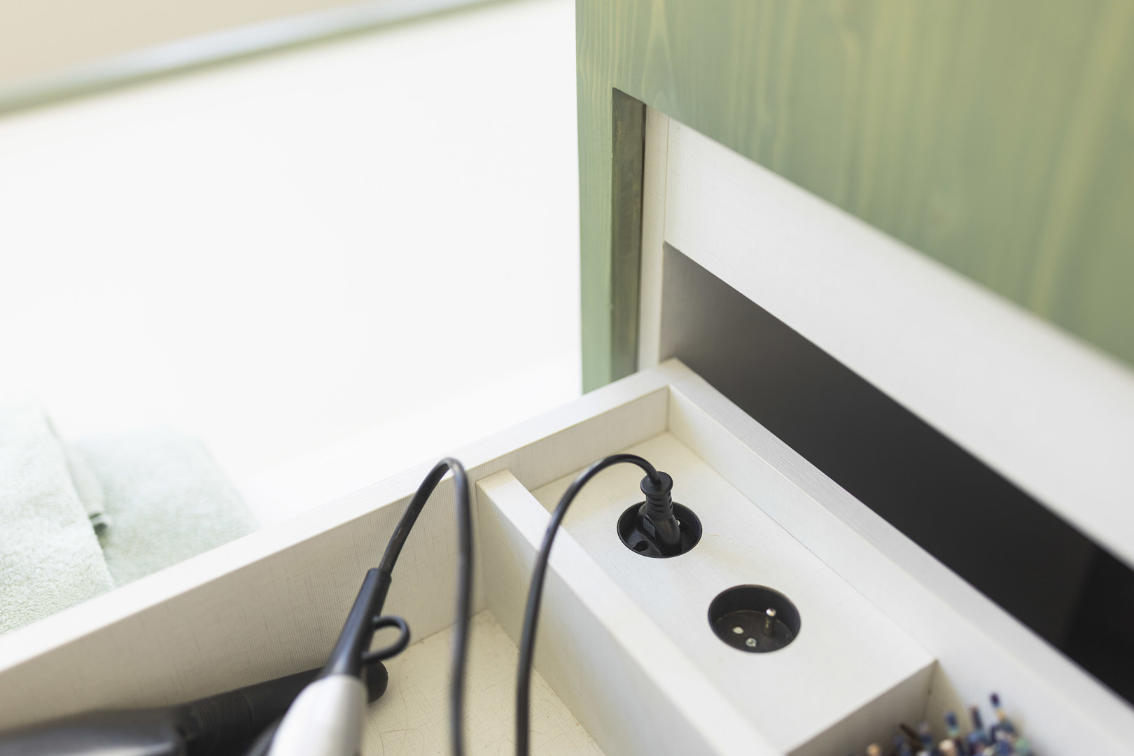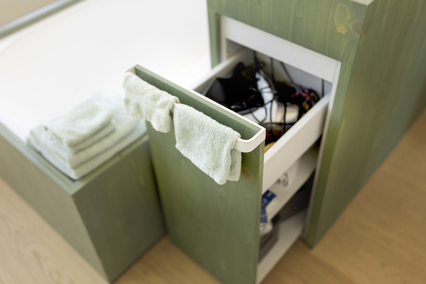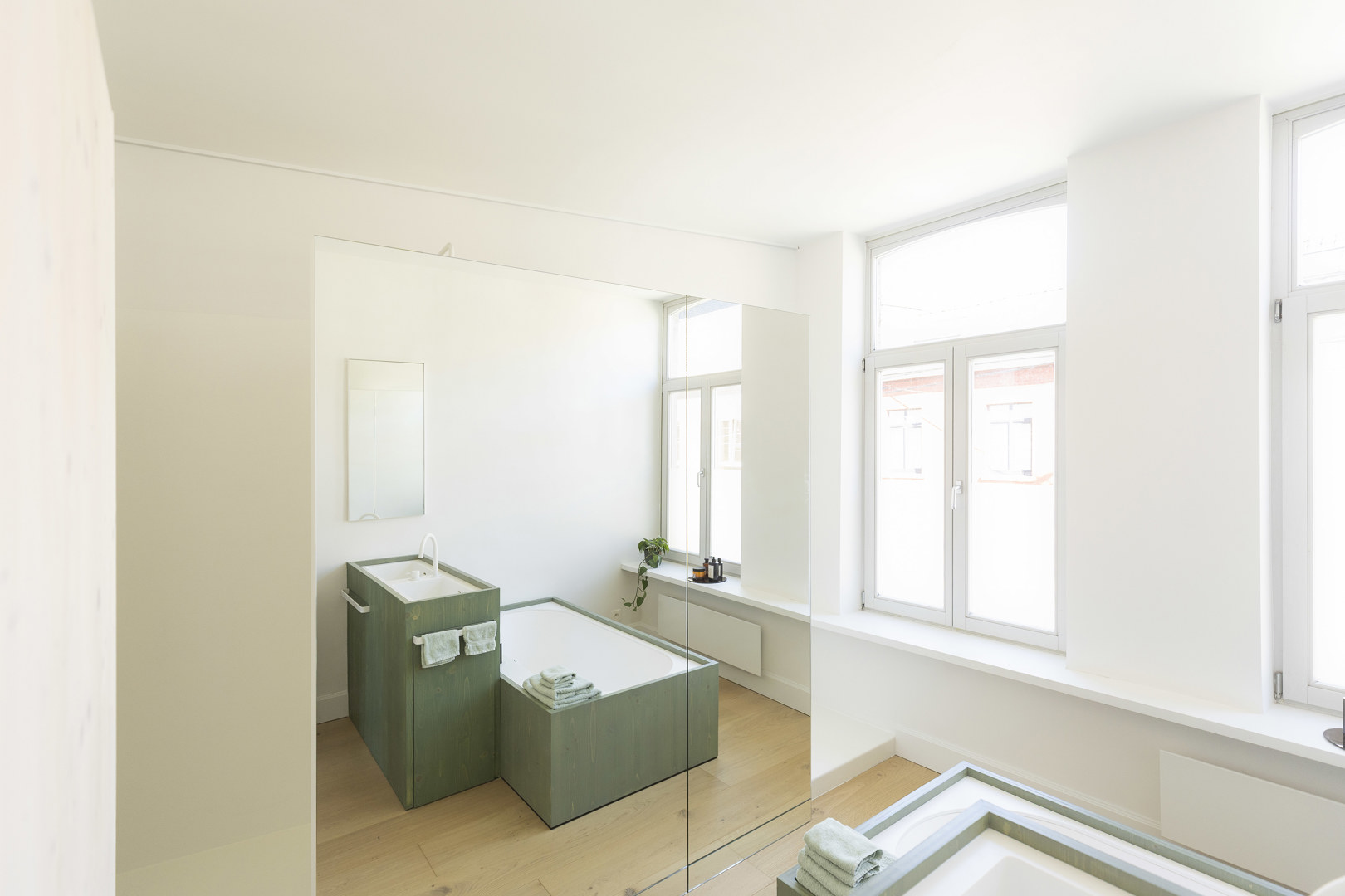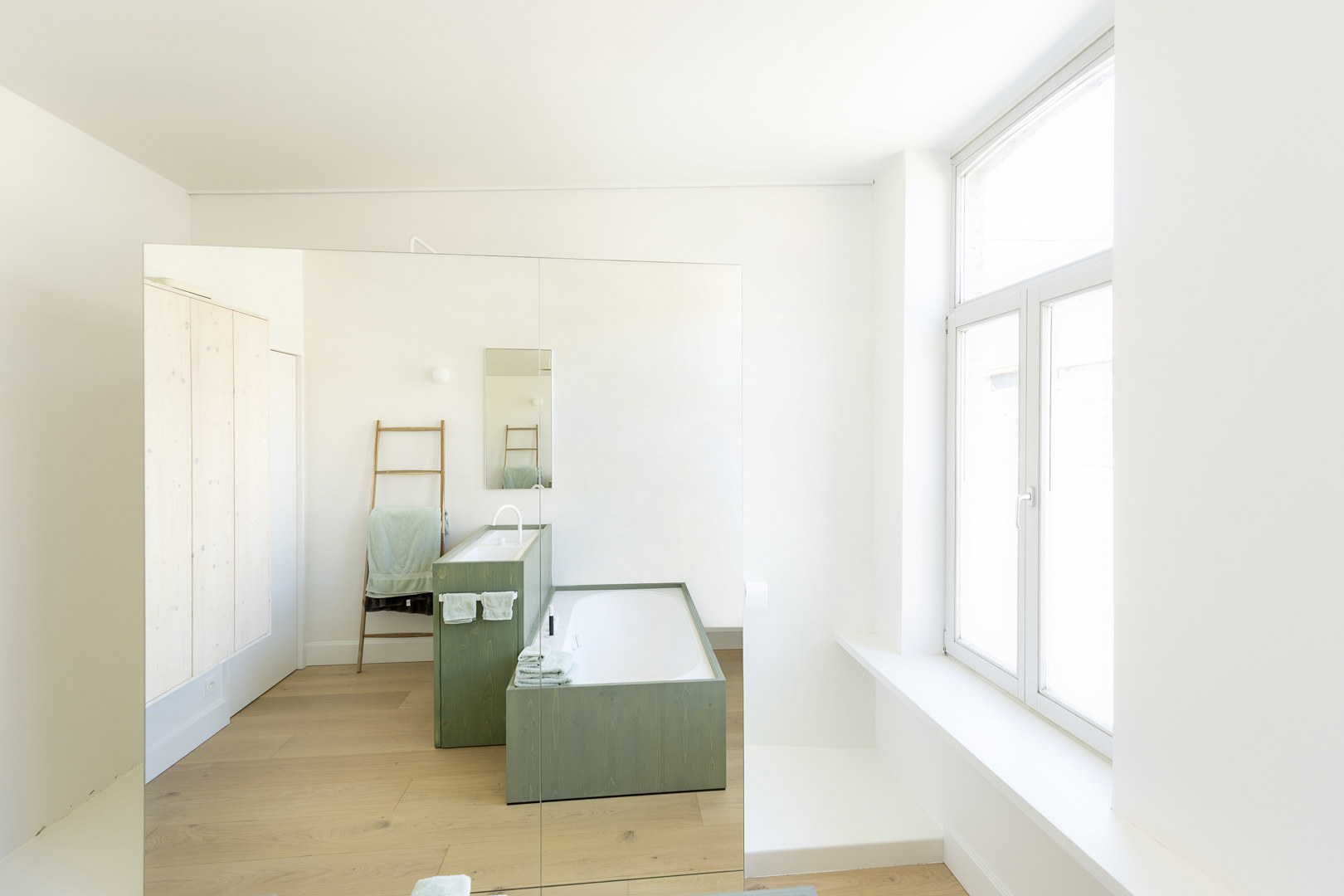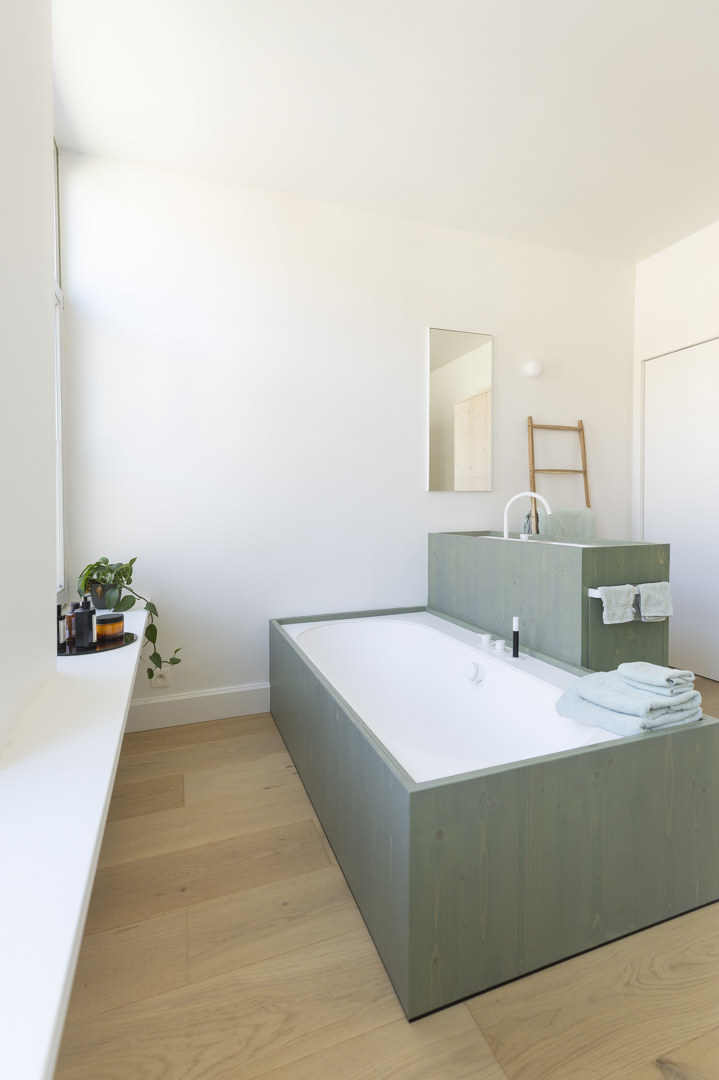 De woning bevond zich lange tijd in een onafgewerkte fase. Met de nieuwe afwerking keert rust en samenhang terug, en komen de aanwezige architecturale kwaliteiten opnieuw tot leven: moulures, plankenvloeren en originele deuren krijgen hun verdiende plaats in de spotlight. De badkamer combineert comfort en rust met praktische efficiëntie: een plek om te ontspannen, maar net zo goed bestand tegen de ochtenddrukte van een gezin. Slim geïntegreerde bergruimte, afgestemd op de bestaande structuur, maakt het dagelijks gebruik eenvoudig, logisch en moeiteloos.