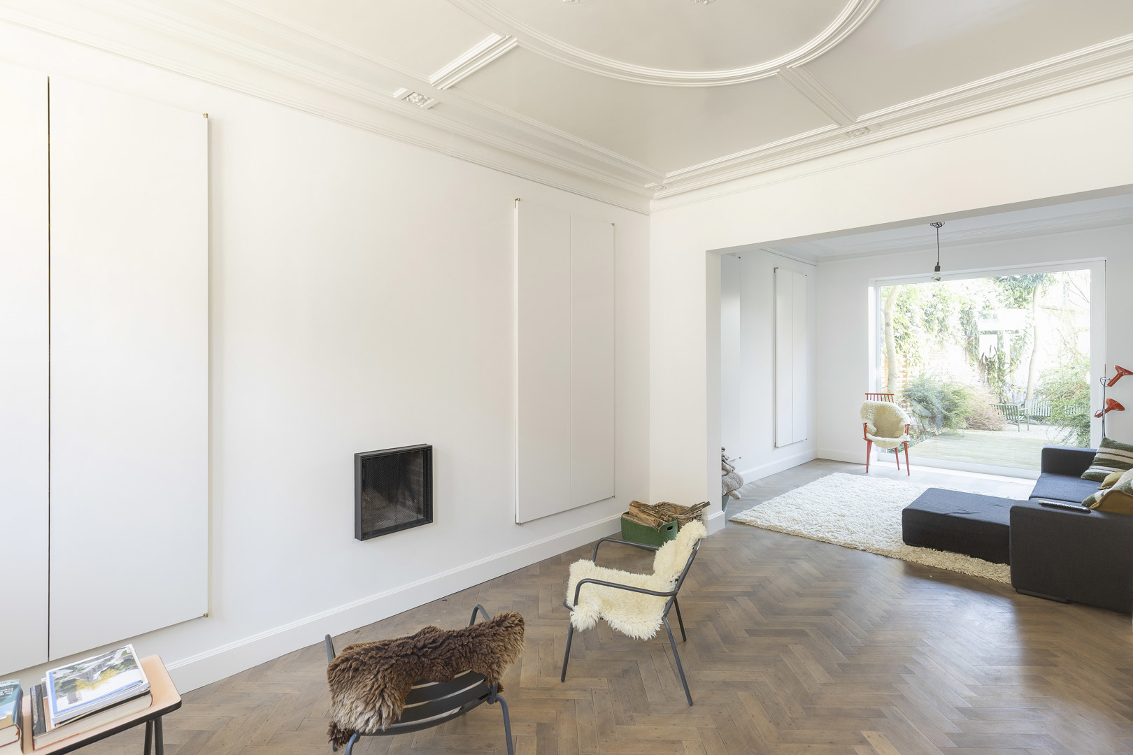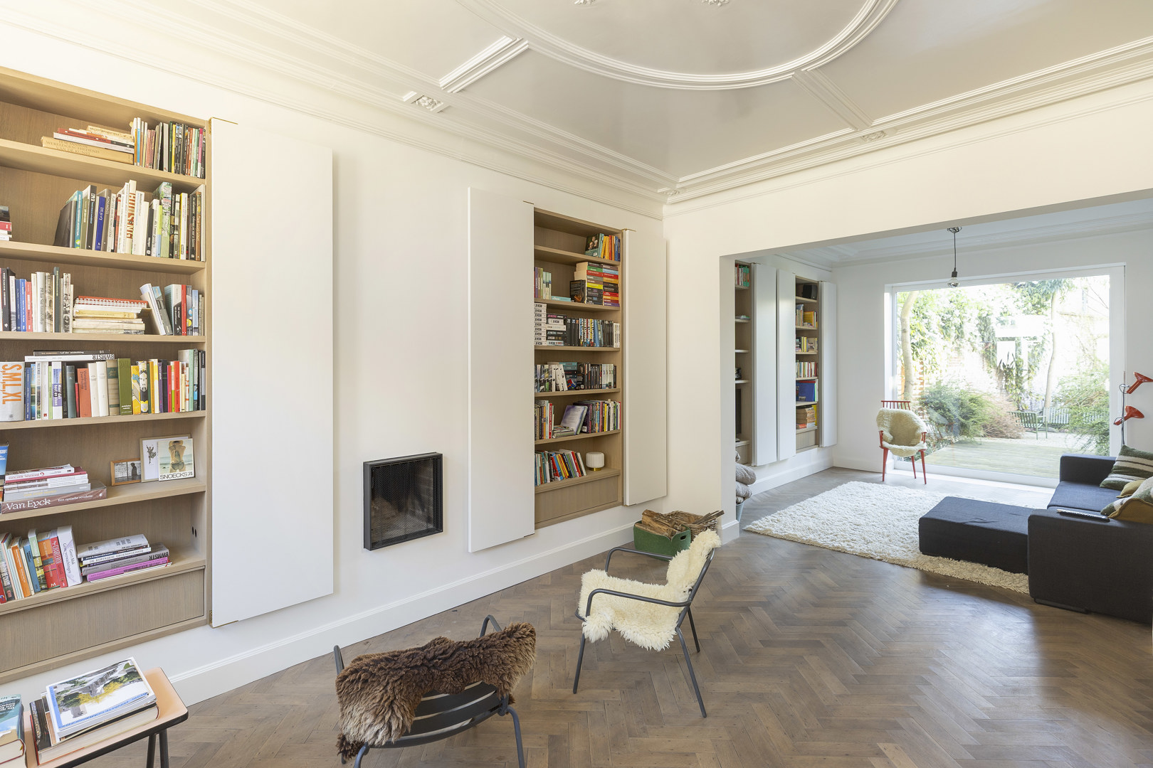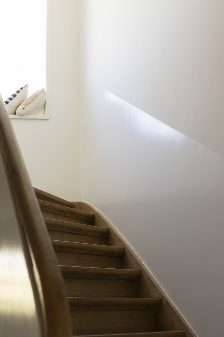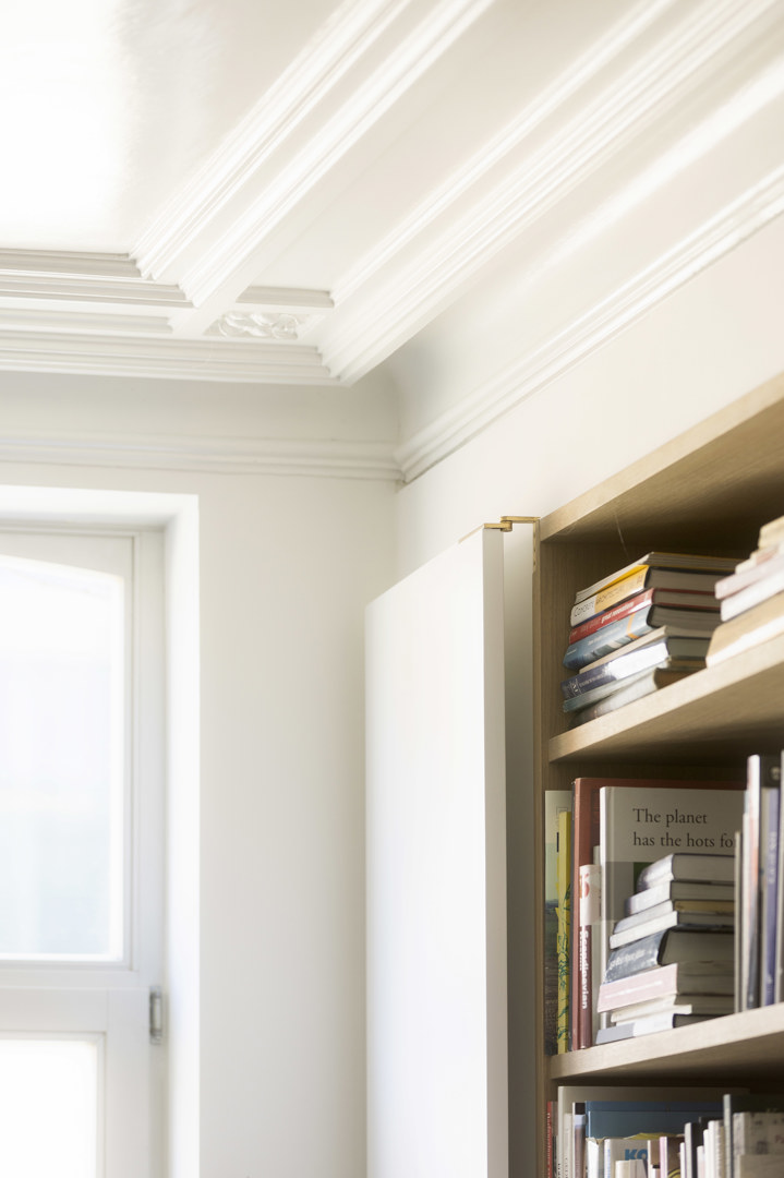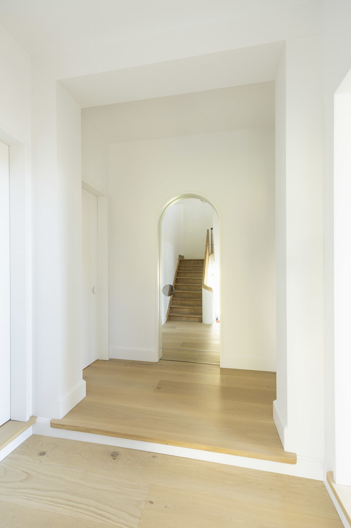 Het bestaande wordt versterkt en opgewaardeerd, met respect voor het verleden en een heldere sprong naar vandaag. Op +1 bleek de draagkracht historisch te licht, terwijl het plafond met zijn verfijnde moulures absoluut behouden moest blijven. De oplossing: een slimme ingreep waarbij de vloerstructuur met bijkomende balken wordt omgevormd tot een stijve plaat. De aansluiting op de bestaande trap vormde een extra uitdaging, beantwoord met een even eenvoudige als sterke zet: een royaal bordes dat naadloos aantakt, terwijl de aangrenzende ruimtes één trede hoger aansluiten. Het subtiele niveauverschil wordt klassiek verzacht met entreportes. Het resultaat voelt vanzelfsprekend — alsof het altijd zo geweest is..