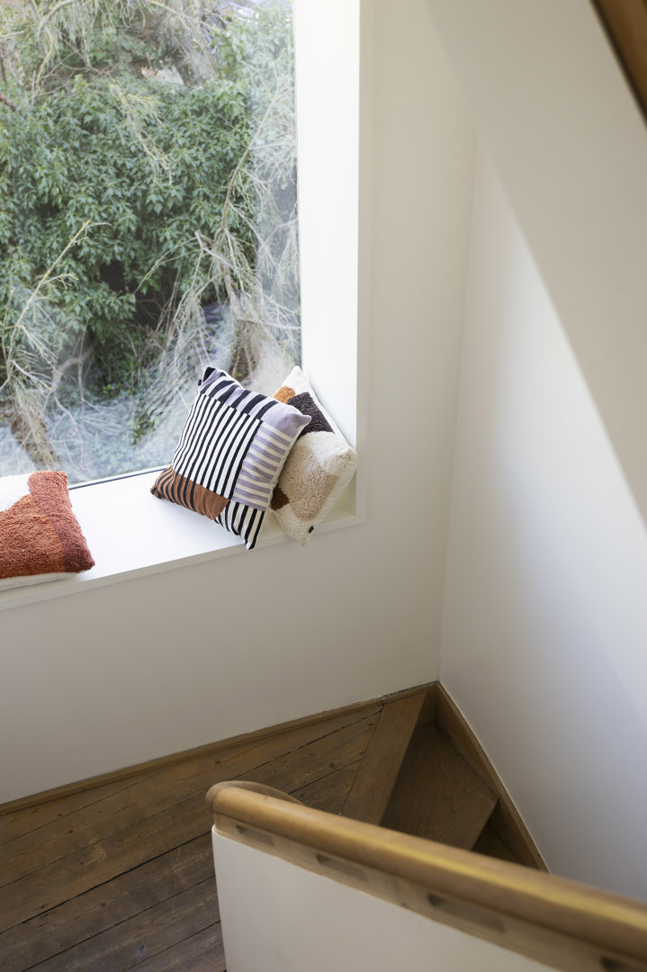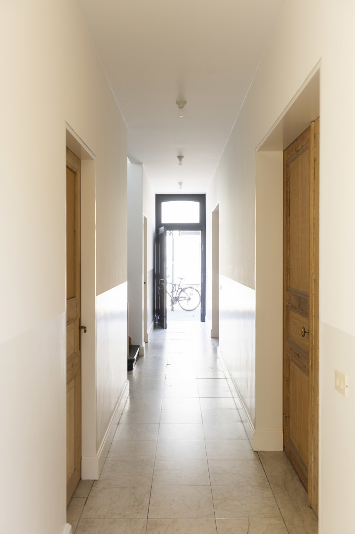 Deze karaktervolle driegevel-burgerwoning kreeg een krachtige interieurupdate, met respect voor haar historische ziel. Op de verdieping werd een stabiliteitsprobleem omgezet in een doordachte en duurzame herwerking van de vloeren. De woning werd scherp afgestemd op een gezin van vijf: een heldere badkamer, een rustige ouderslaapkamer met dressing en een flexibele ruimte die schakelt tussen wasplaats, bureau en polyvalent gebruik. De bestaande trap blijft het kloppend hart. Hedendaagse technieken voor verwarming, warmwater en ventilatie zijn slim en discreet geïntegreerd — waar erfgoed en comfort elkaar versterken.