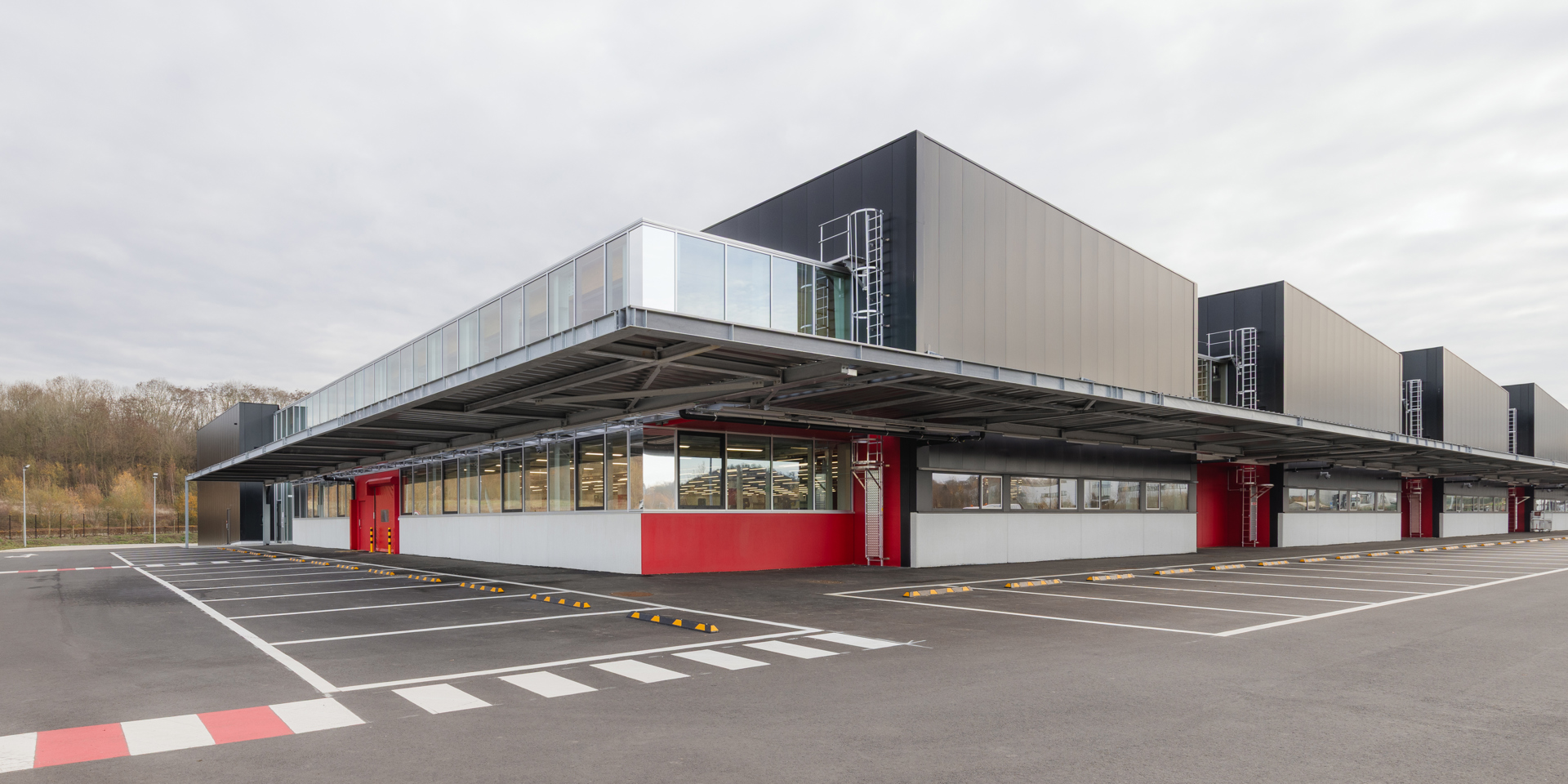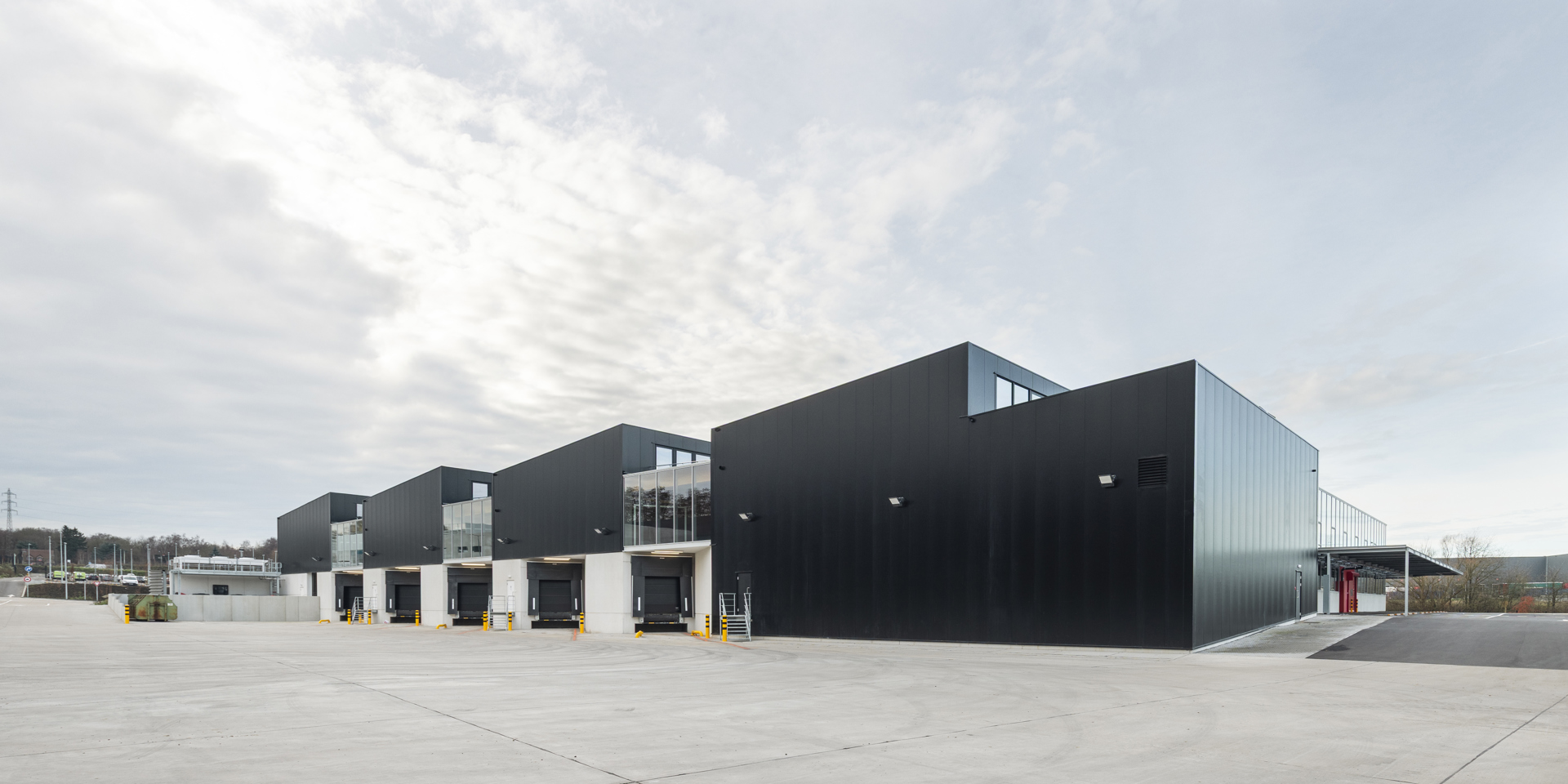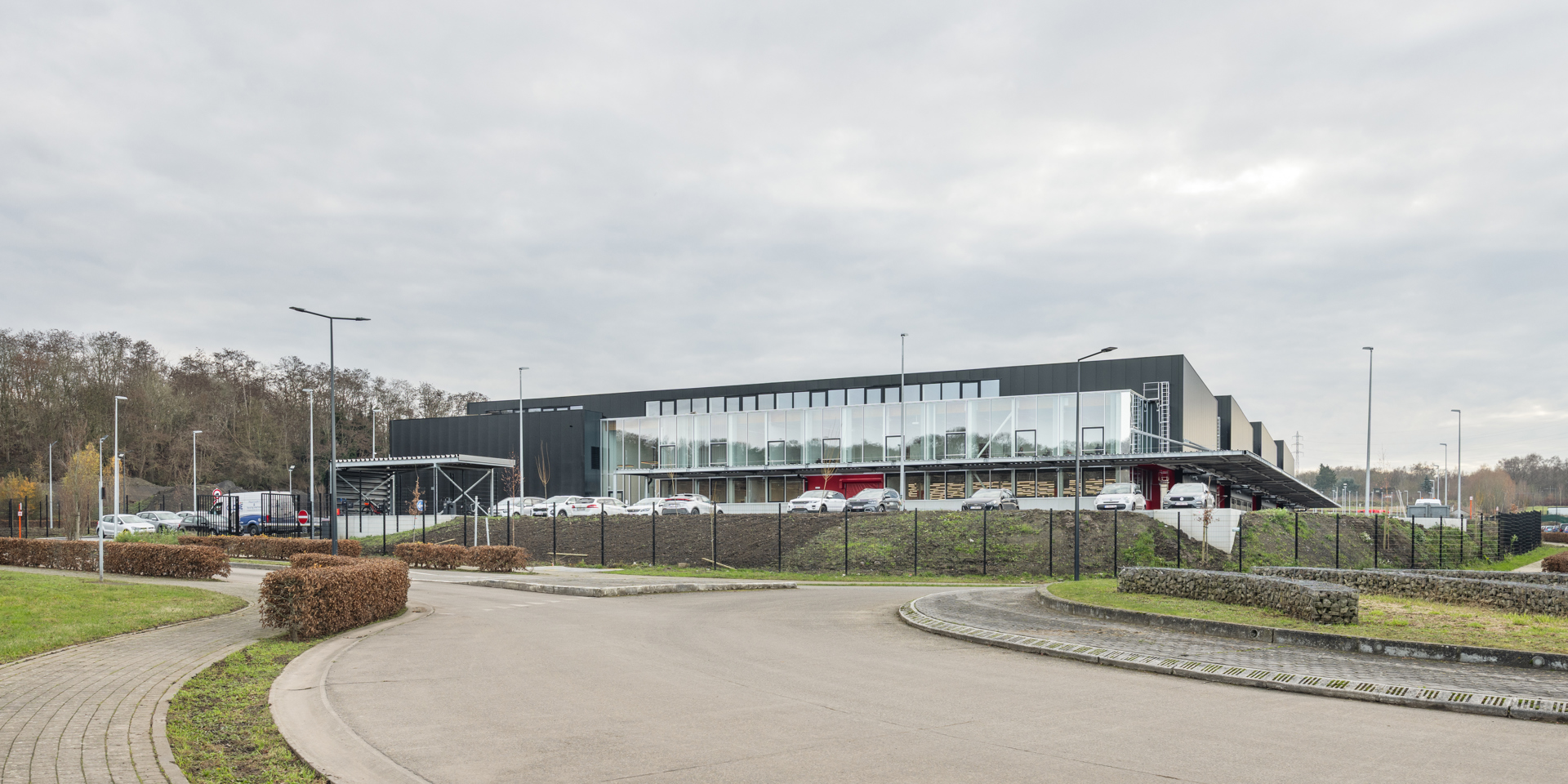 Dit project onderscheidt zich van standaard distributiecentra door twee grote uitdagingen: een verzorgde architectuur en het verzoenen van de topografie met complexe logistieke stromen. De eerste uitdaging speelt in op de strenge planologische eisen. De enorme omvang van de hal is opgedeeld in een compositie van glazen en opake volumes, overdekt met een groendak en sheddaken. Dit zorgt voor een betere landschappelijke integratie en biedt natuurlijk verlichtte binnenruimtes aan de gebruikers. Tegelijk werd het terrein van 400 meter lang en 14 meter hoogteverschil benaderd vanuit een strategie van minimaal grondverzet. Door het evenwicht tussen uitgraving en ophoging en een subtiel hellend parkeerterrein kon een quasi vlak logistiek plateau worden gerealiseerd met beperkte impact op de site.