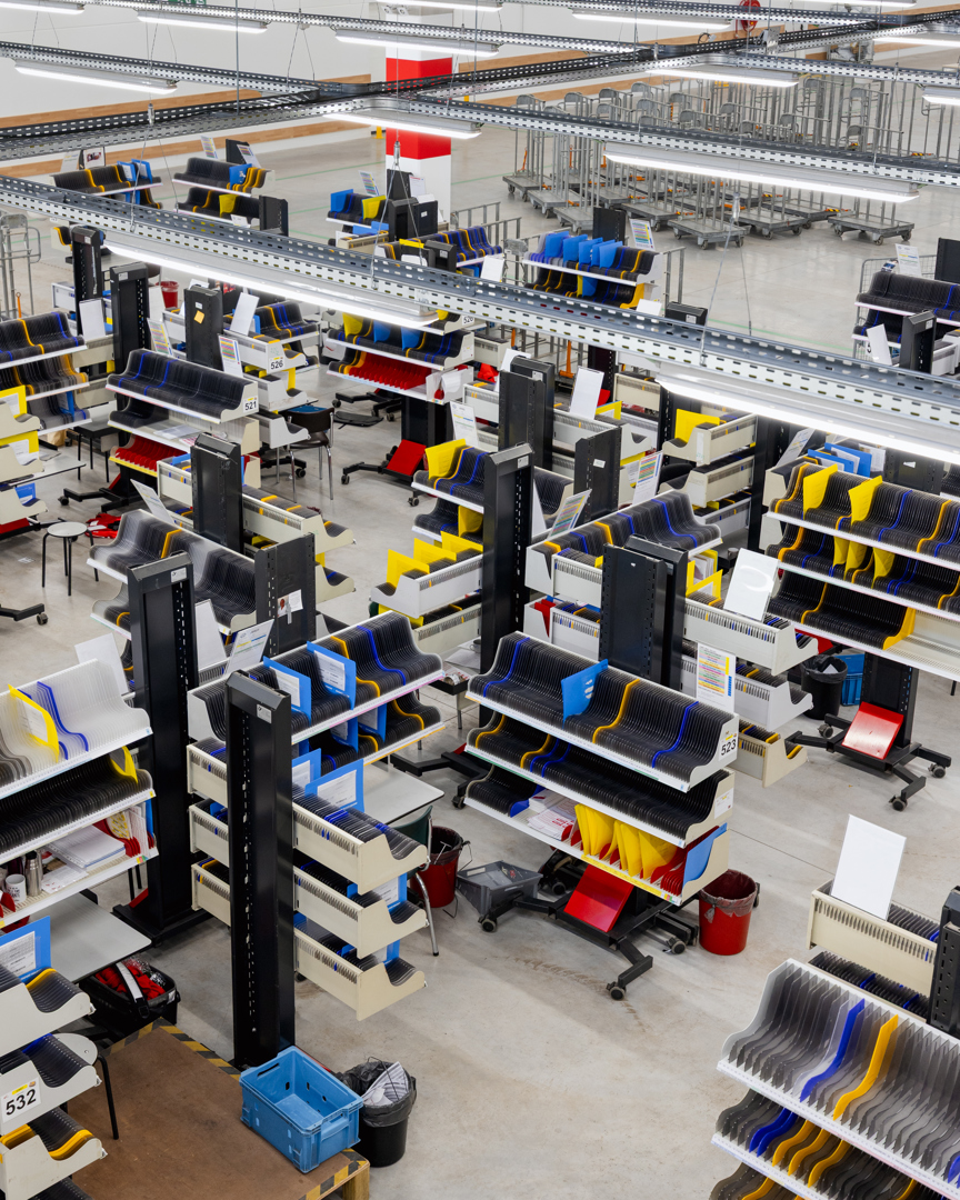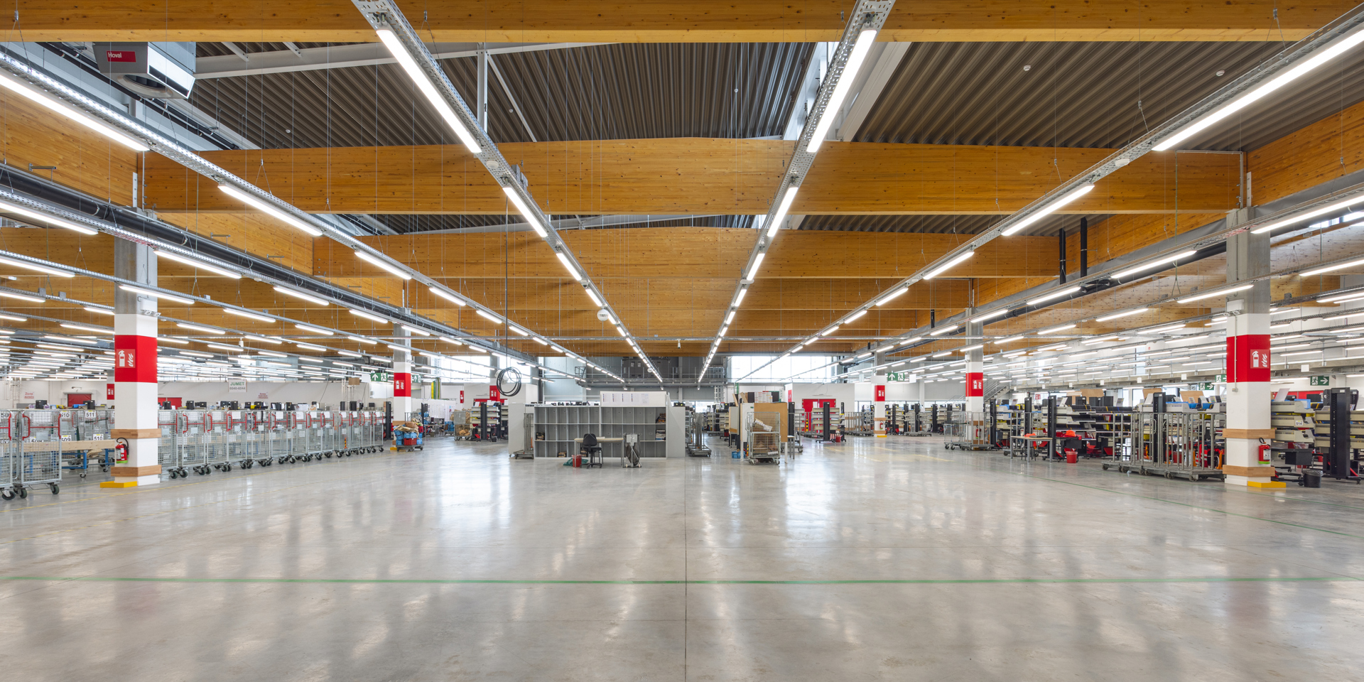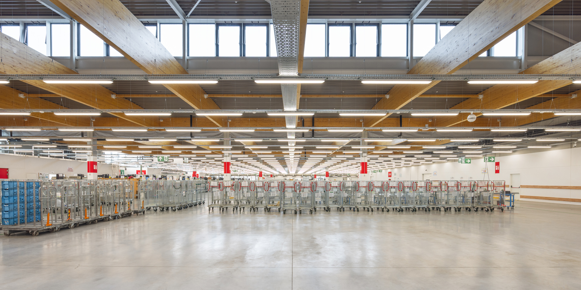 Dit project onderscheidt zich van standaard distributiecentra door twee grote uitdagingen: een verzorgde architectuur en het verzoenen van de topografie met complexe logistieke stromen. De eerste uitdaging speelt in op de strenge planologische eisen. De enorme omvang van de hal is opgedeeld in een compositie van glazen en opake volumes, overdekt met een groendak en sheddaken. Dit zorgt voor een betere landschappelijke integratie en biedt natuurlijk verlichtte binnenruimtes aan de gebruikers. Tegelijk werd het terrein van 400 meter lang en 14 meter hoogteverschil benaderd vanuit een strategie van minimaal grondverzet. Door het evenwicht tussen uitgraving en ophoging en een subtiel hellend parkeerterrein kon een quasi vlak logistiek plateau worden gerealiseerd met beperkte impact op de site.