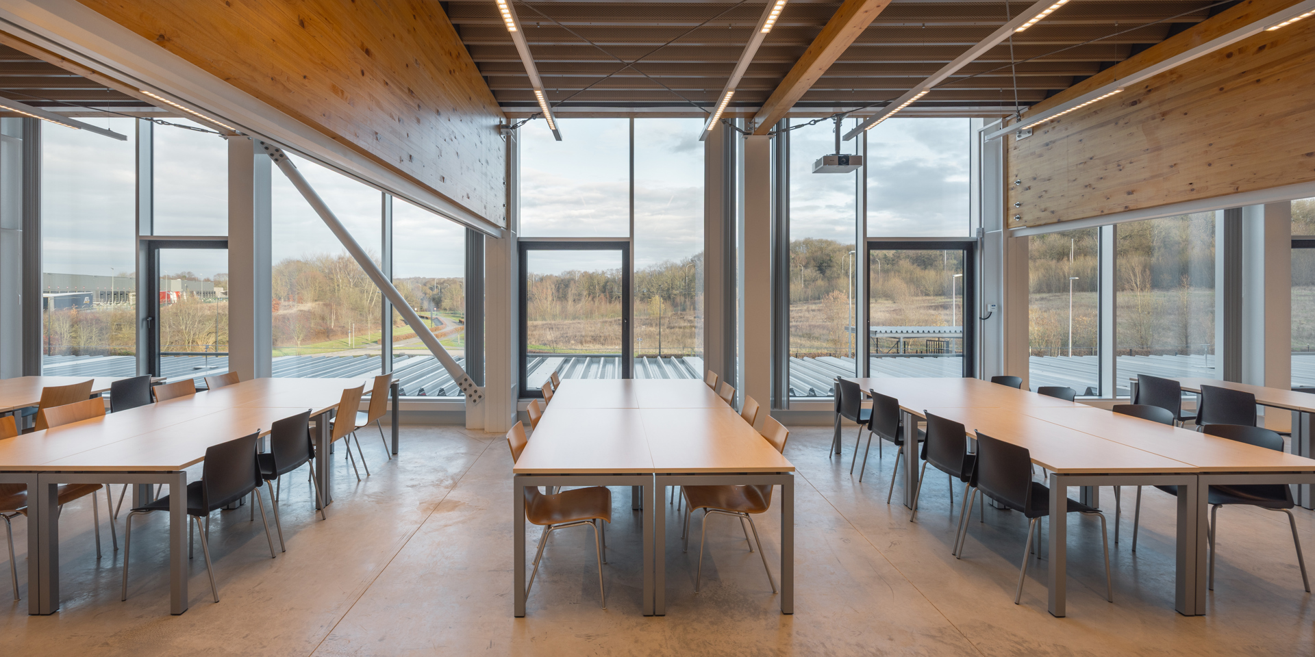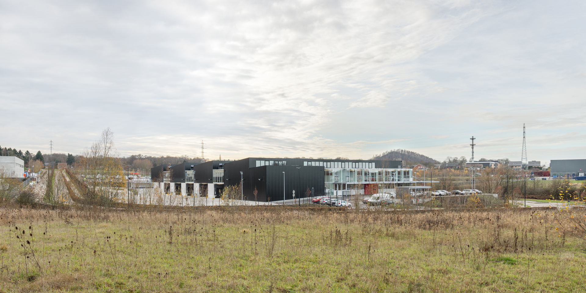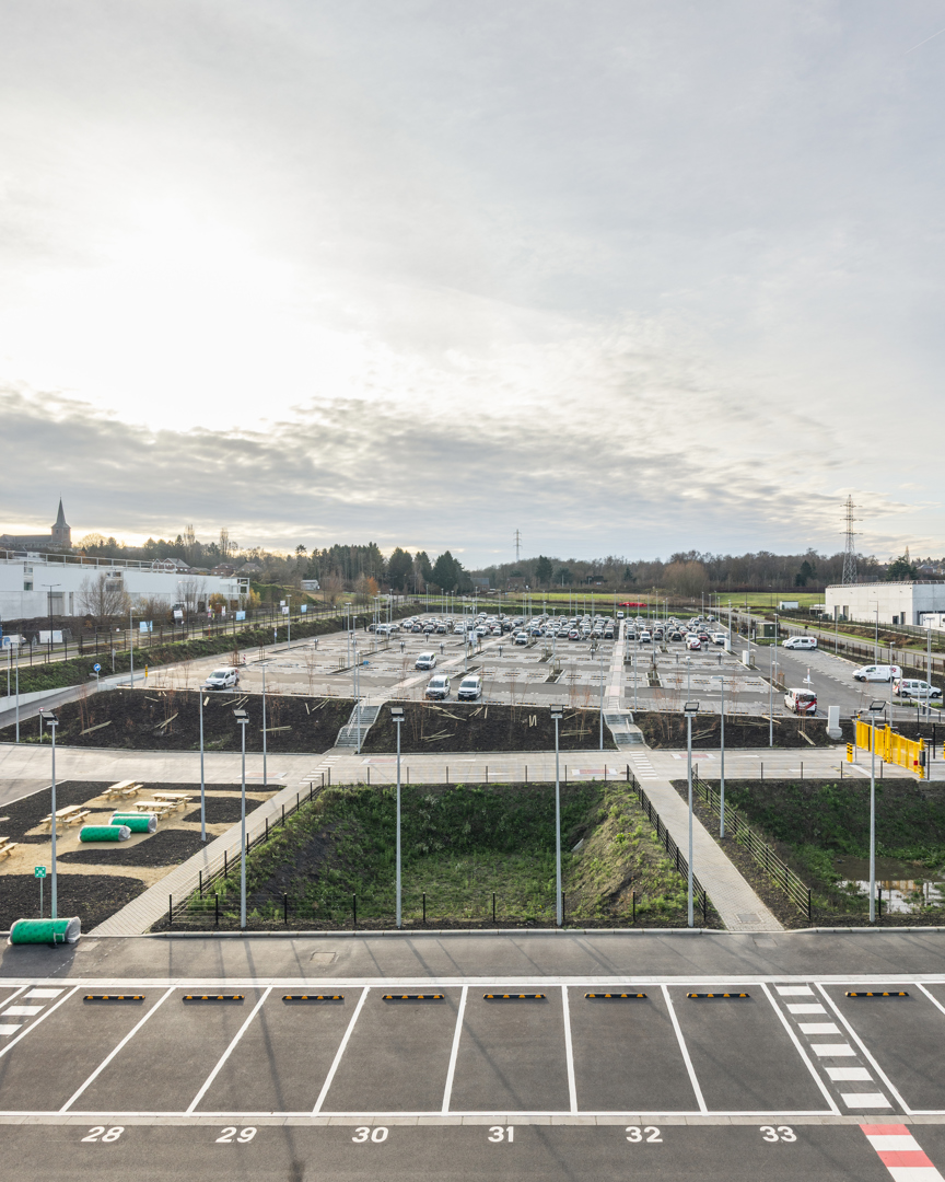 Het project voor BPost toont zijn duurzaamheid op drie niveaus. De landschappelijke ingreep staat centraal: groendaken, 350 hoogstambomen, meer dan 1 km hagen en de volledige infiltratie van regenwater via doorlatende verhardingen en twee wadi’s. De inrichting is gericht op het behalen van het label “Réseau Nature Entreprises”, in samenwerking met Natagora en PlantC, lokale spelers op het vlak van milieu. Het groene kader is opgevat als een doordachte scenografie die bijdraagt aan het welzijn van de gebruikers. Daarnaast is het gebouw flexibel: een architecturaal en technisch scenario maakt een latere opsplitsing in drie autonome units mogelijk, zonder ingrijpende aanpassingen. Tot slot wordt energie ter plaatse opgewekt via 2.400 m² fotovoltaïsche panelen en een warmtepomp.