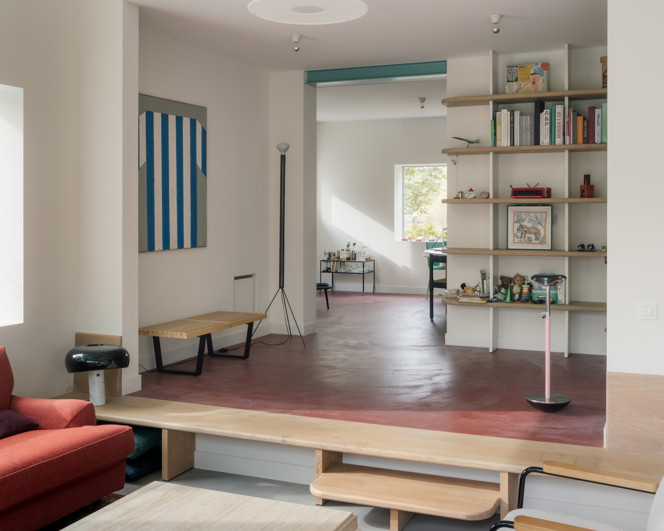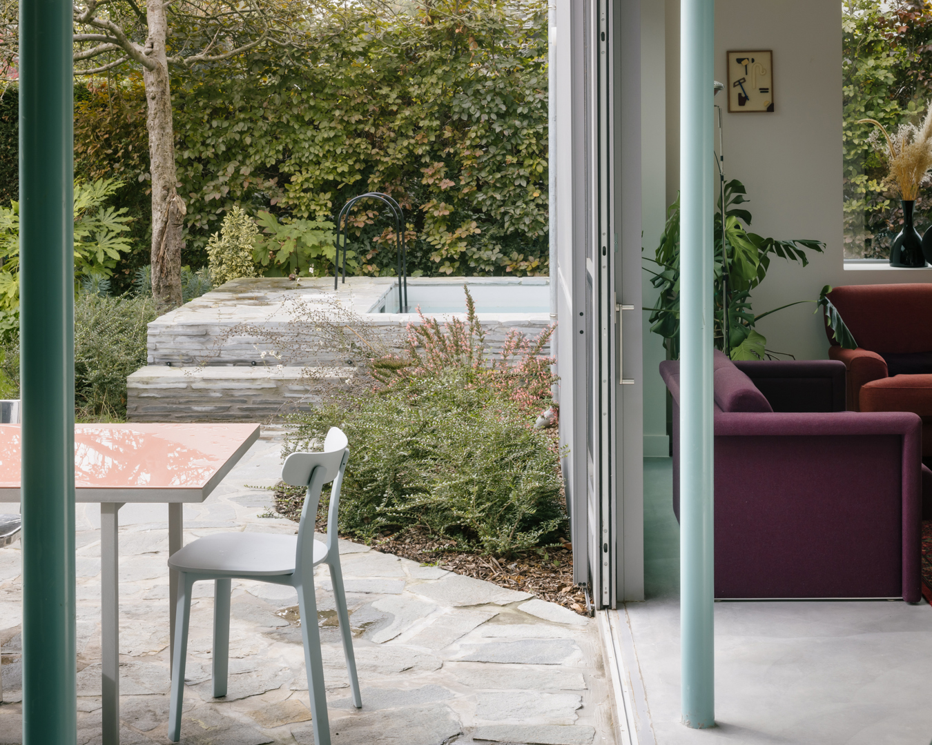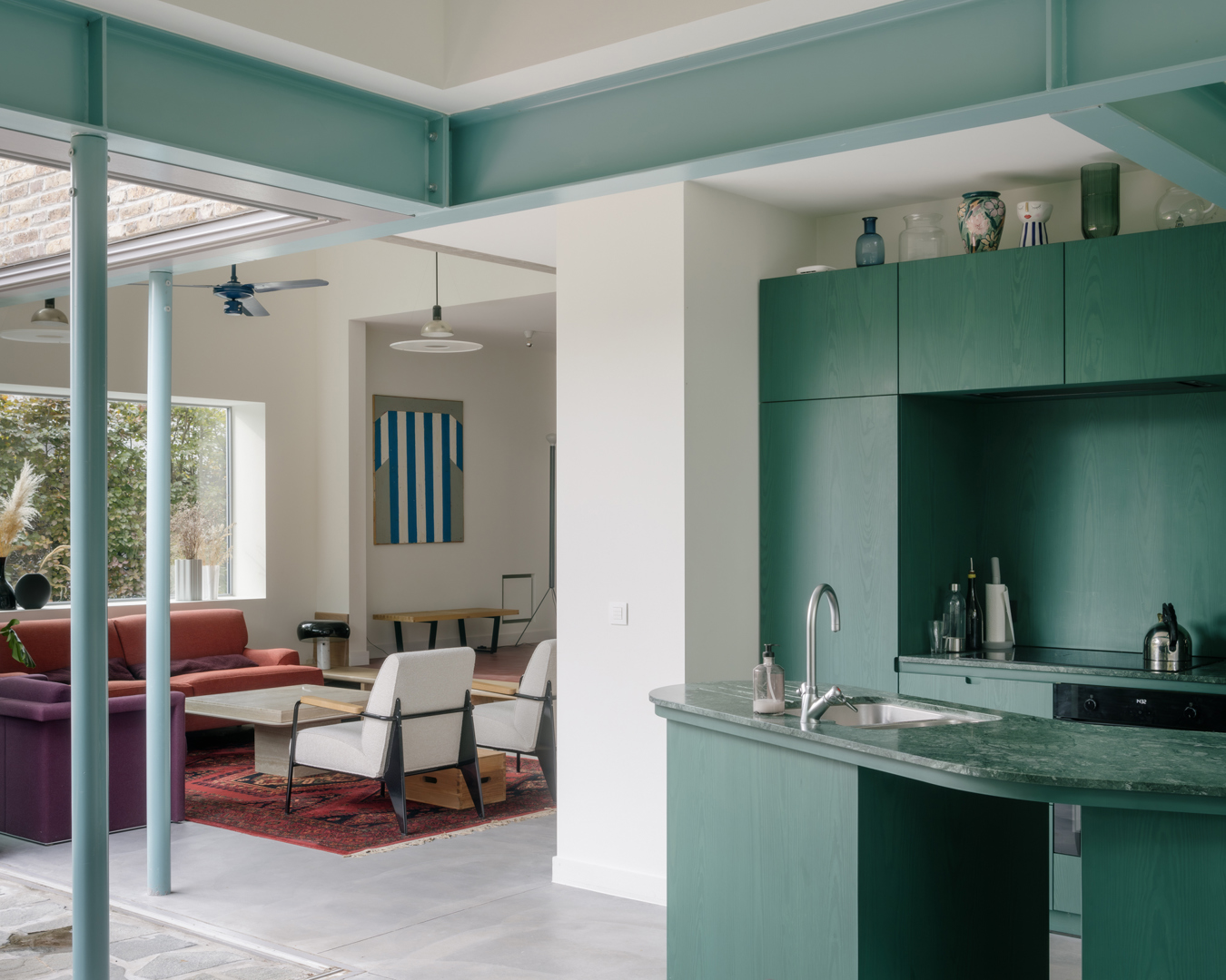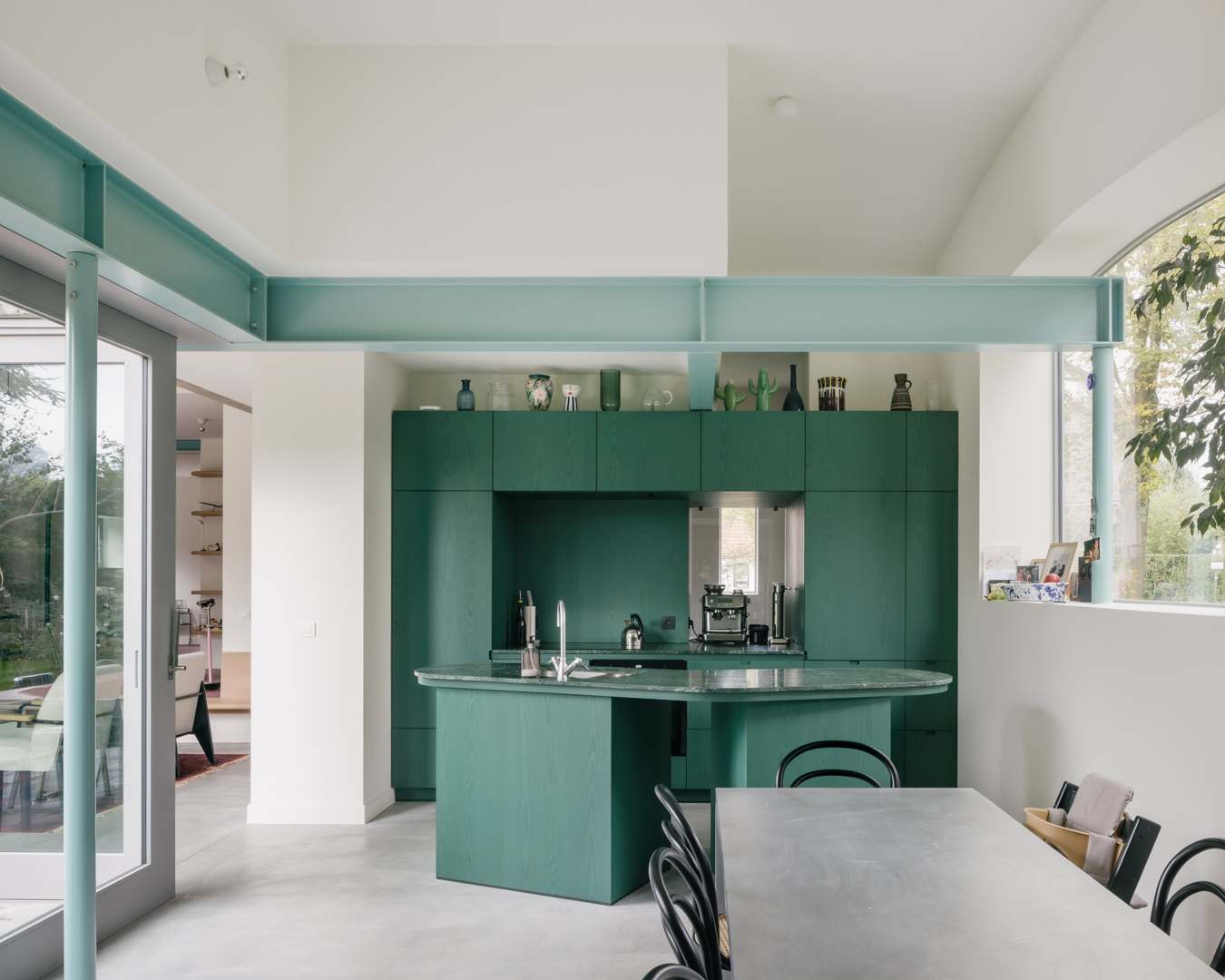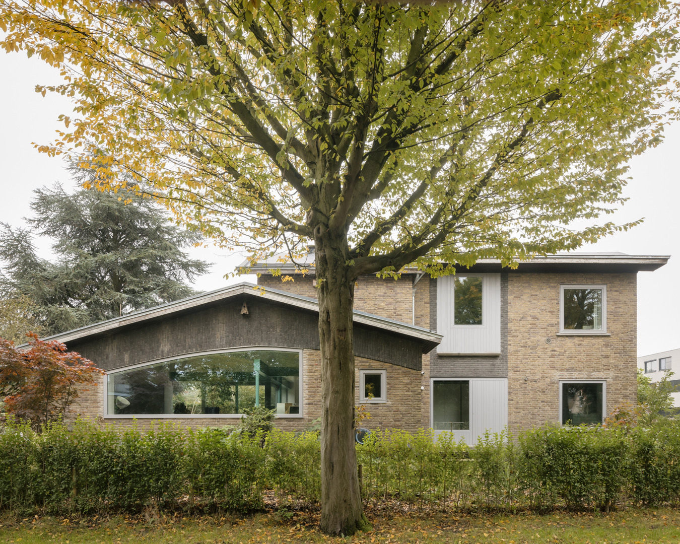 Een jong gezin besluit tijdens de coronapandemie hun appartement in de stad te verruilen voor een vrijstaande woning met tuin aan de rand van de stad, op een steenworp afstand van het centrum. Het betreft een gedateerde woning uit 1958 met een aantal 'moderne' elementen. De opdracht was om van deze woning een frisse, eigentijdse gezinswoning te maken met een relatie tot de tuin en verwijzingen naar de casestudywoningen, auto's en interieurontwerp. De woning bevindt zich in een zeer specifieke context van de stad. Enerzijds ligt het in een buitenwijk, in een oude woonwijk in de 20e-eeuwse Gentse gordel, vlakbij de pittoreske Leie. Dit betekent dat de woning iets hoger in het groen ligt, tussen oude bomen. Anderzijds ligt de woning ook zeer dicht bij het centrum, op circa 2,5 km van station