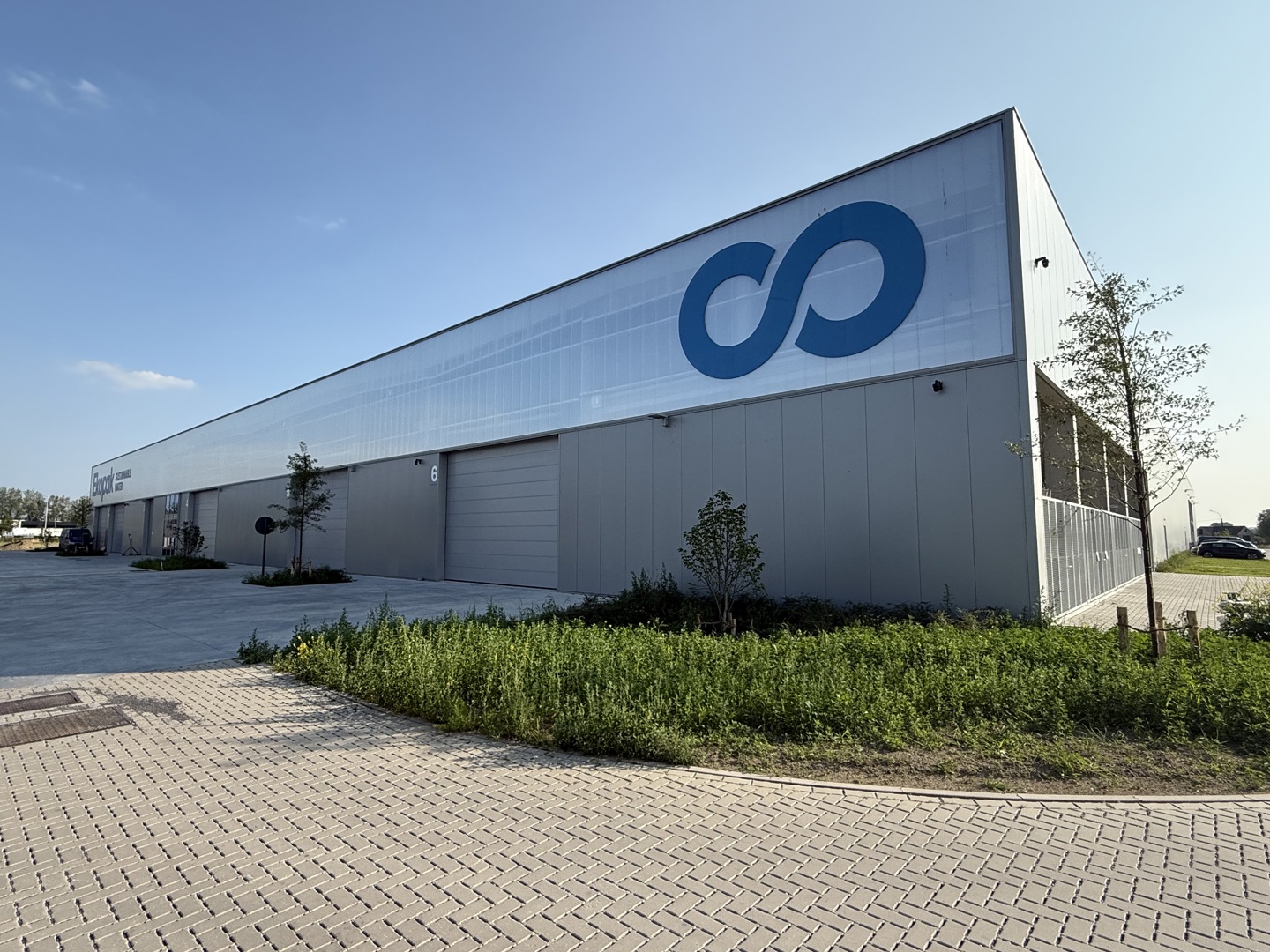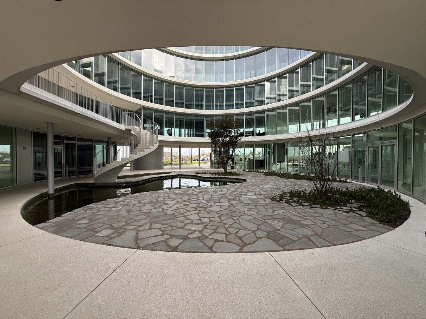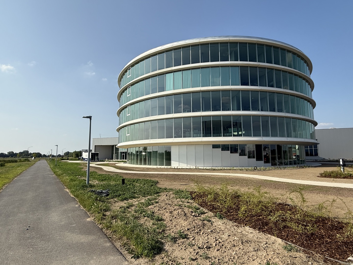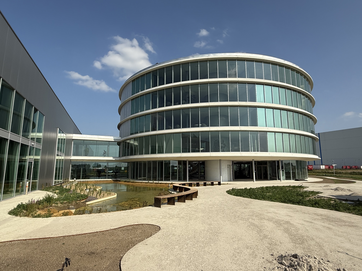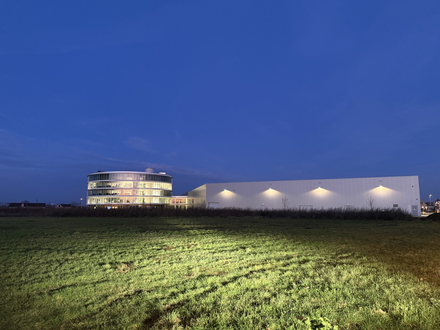 Er wordt in dit concept bewust niet gekozen voor de traditionele opstelling van het kantoorgebouw aan de straatzijde met een achterliggende productiehal. In een scherp afgelijnde inplanting wordt van de maximaal bebouwbare oppervlakte op het perceel een grote driehoek op de zuidzijde achteraan afgesneden. Dit resulteert in een trapeziumvormige footprint voor de productieruimte en het sociaal gedeelte. Hierdoor ontstaat voldoende ruimte op het perceel om een grote kwaliteitsvolle groenzone te kunnen aanleggen, grenzend aan het fietspad en het bufferbekken. In deze groenzone wordt een cirkelvormig kantoorgebouw ingeplant dat zich richt naar alle zijden. Het verzelfstandigen van de beide gebouwdelen – kantoor en productiehal - versterkt de beide identiteiten tot een samenhangend geheel.