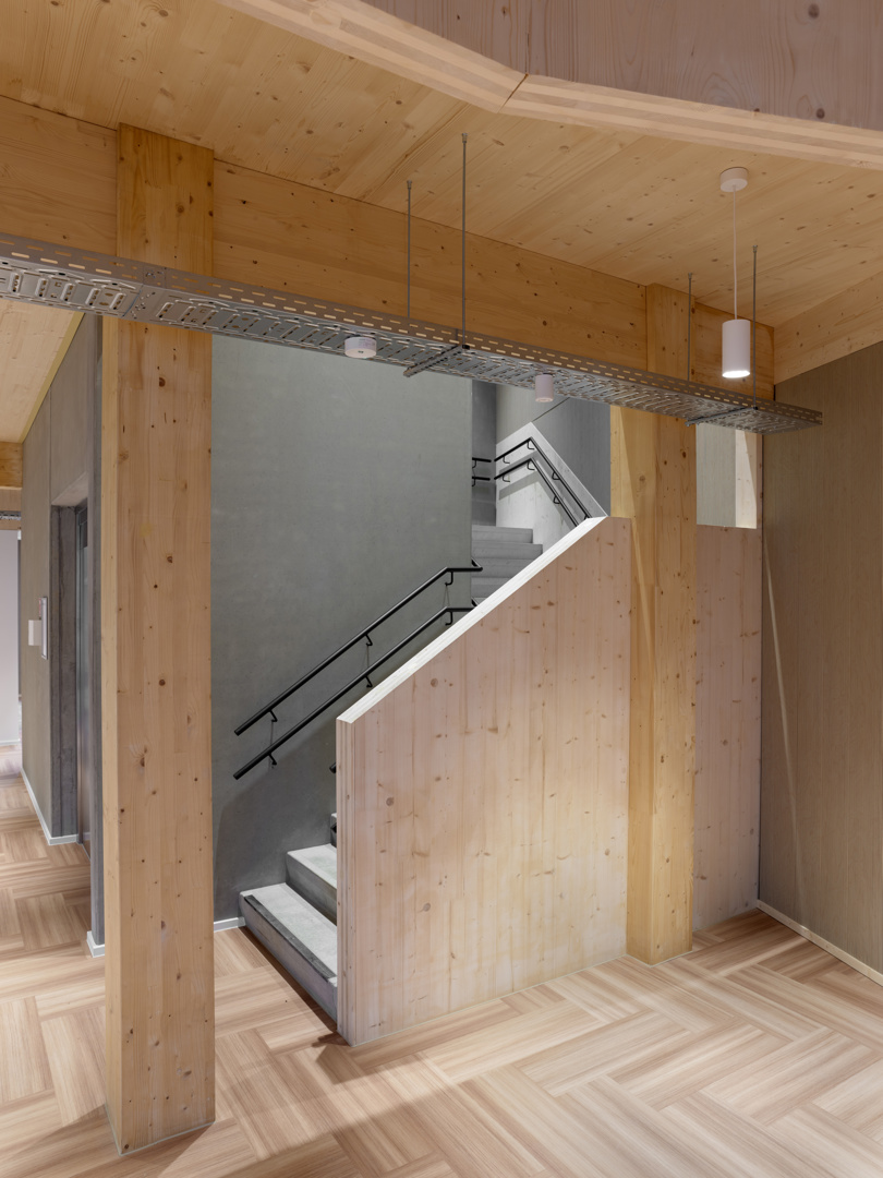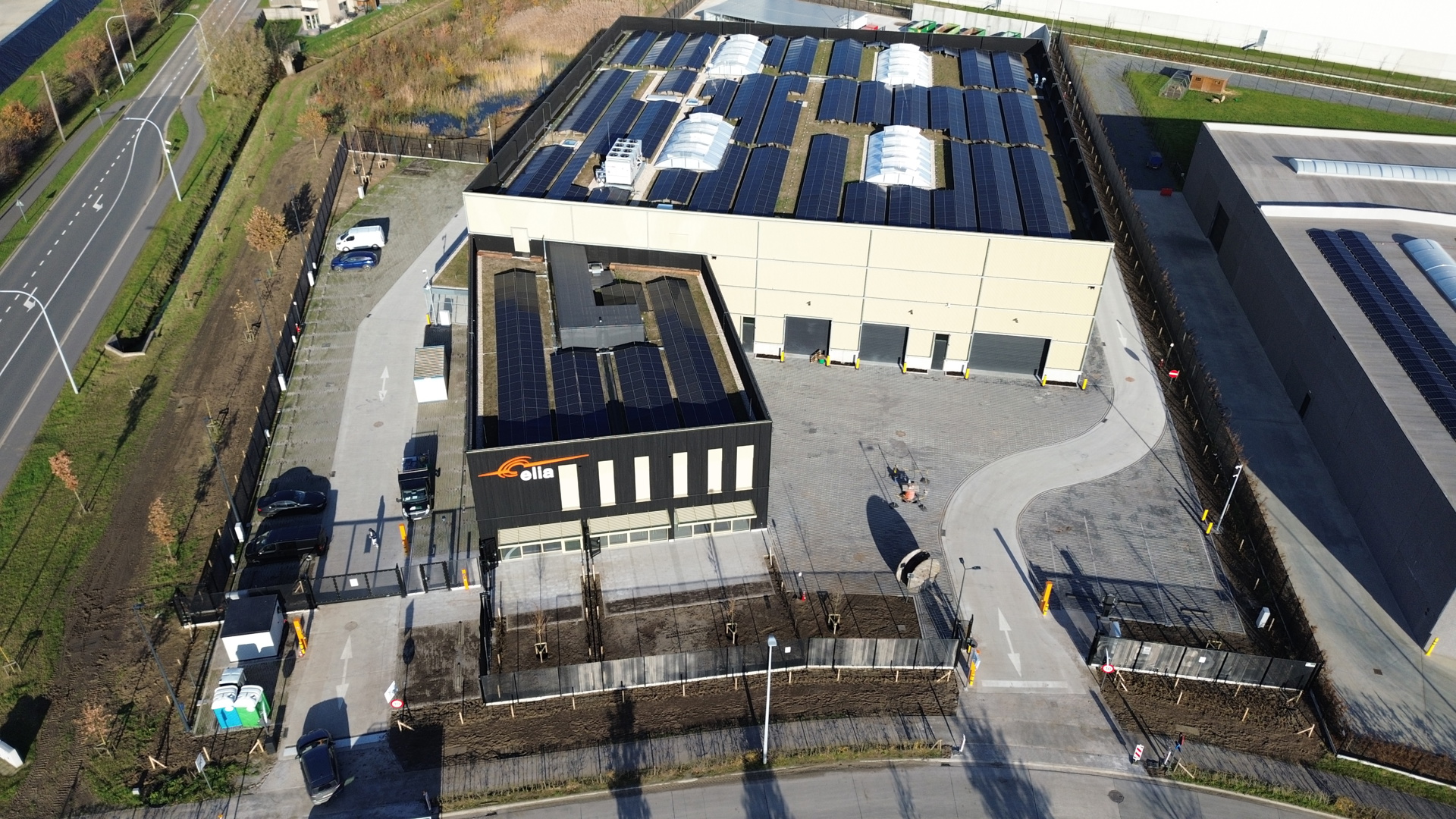 Het project brengt een uitgebreid programma samen op een relatief compacte site. De uitdaging bestond erin de functionele voetafdruk te minimaliseren om maximaal ruimte te laten voor infiltratie, biodiversiteit en leefkwaliteit. We kozen ervoor twee rechthoekige volumes onder een lichte hoek op elkaar aan te sluiten, en zo daglicht te maximaliseren. Waar zware belasting vereist is, is doelbewust verhard; overal elders werden waterdoorlatende verhardingen voorzien. De randen van het perceel blijven groen en onverhard, voorzien van hagen en bloemenweide. Ook was de doorlooptijd voor studie en werf (220 werkdagen) zéér kort. Er werd maximaal ingezet op prefabricatie en modulaire houtbouw, parallelle engineering, en een doordachte bouwlogistiek om faaltijd te vermijden.