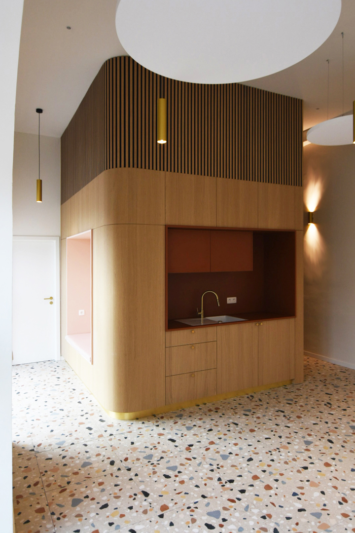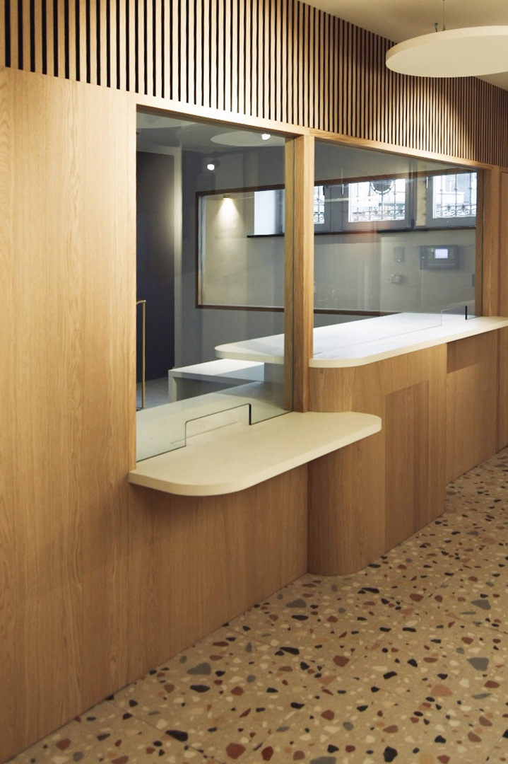 De gebruikers kunnen in alle rust wachten en profiteren van een menselijke ontvangst, ver weg van onpersoonlijke en geautomatiseerde interfaces. De ruimtes zijn ontworpen om te kalmeren: een palet van zachte kleuren, meubels volledig bekleed met eikenhout... een warme en geruststellende sfeer bij het betreden. Het TEC-personeel wordt in deze omgeving gekoesterd, het loket is ontworpen in samenwerking met de TEC-werknemers om maximale ergonomie te garanderen: bijvoorbeeld, er is een verhoging geïntegreerd zodat de zittende medewerkers de TEC-klanten recht in de ogen kunnen kijken. Wat de chauffeurs betreft, zij genieten van een lichte ontspanningsruimte met uitzicht op de esplanade. Een stiltebubbel waar ze discreet hun bus in de gaten kunnen houden terwijl ze genieten van een welverdiende pauze.