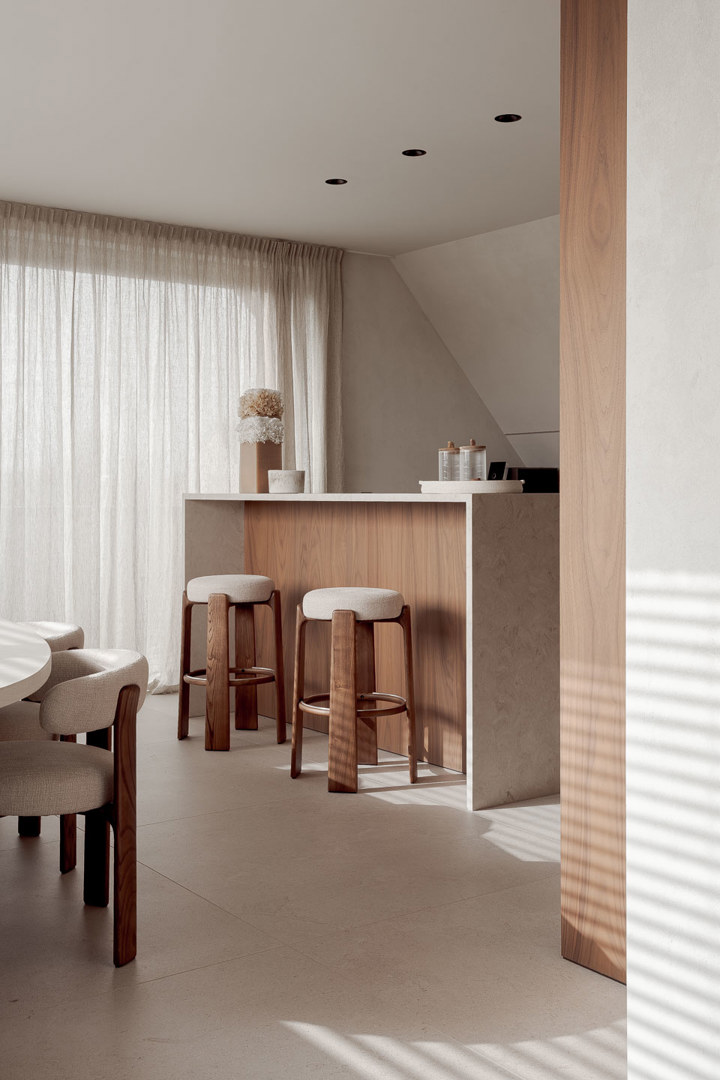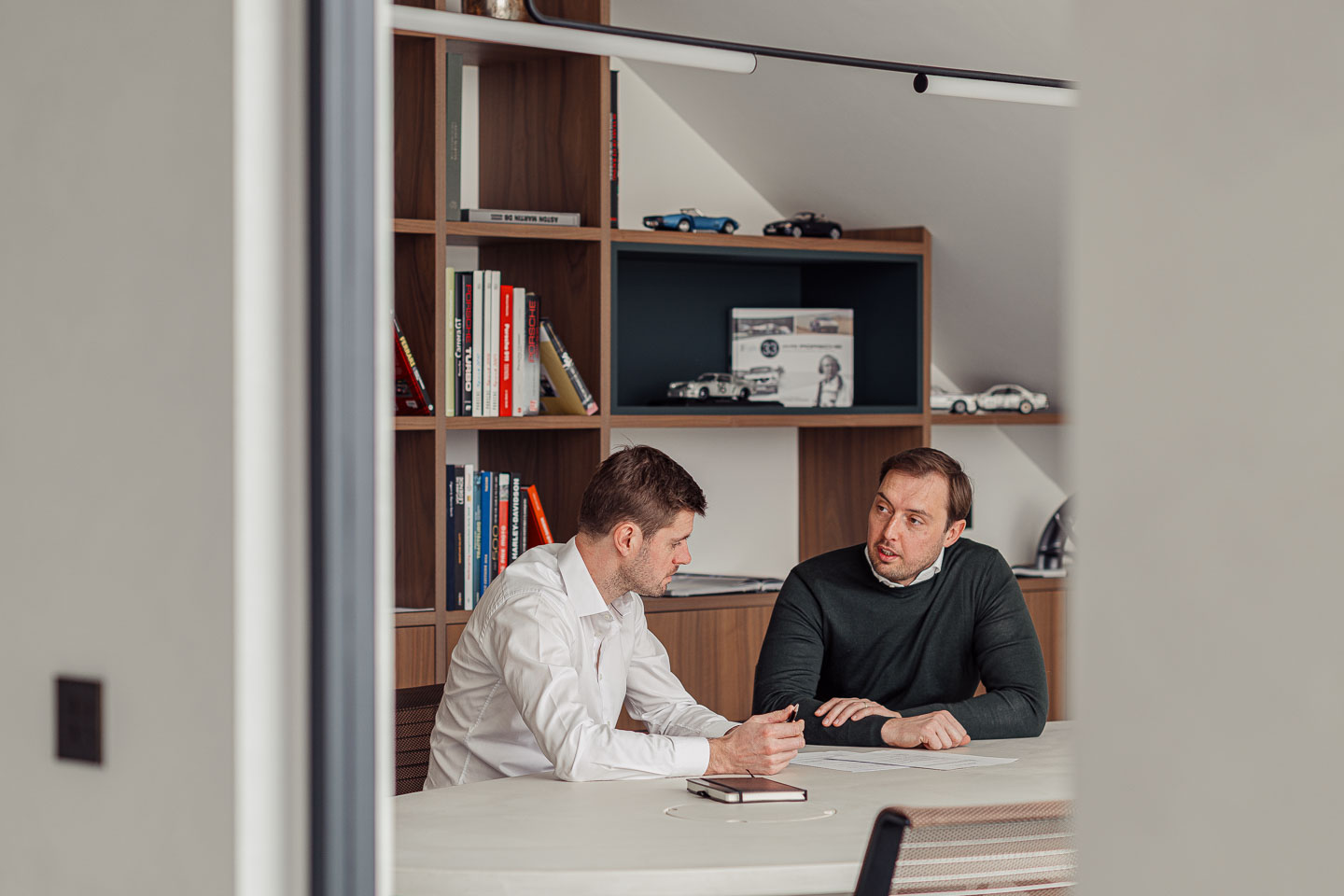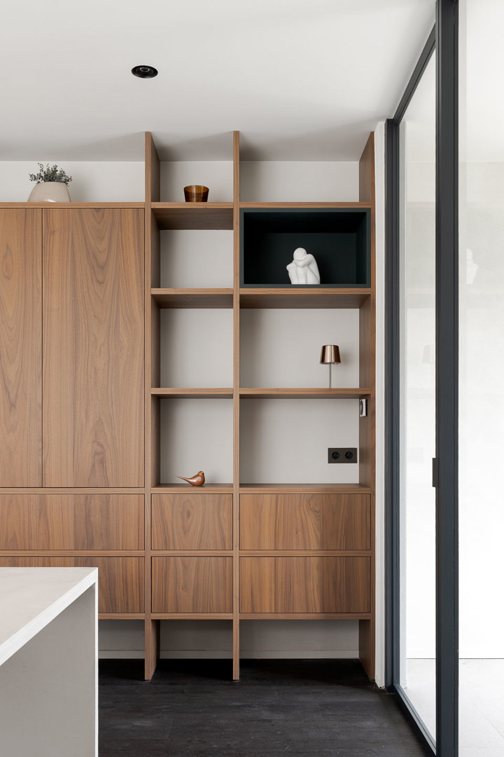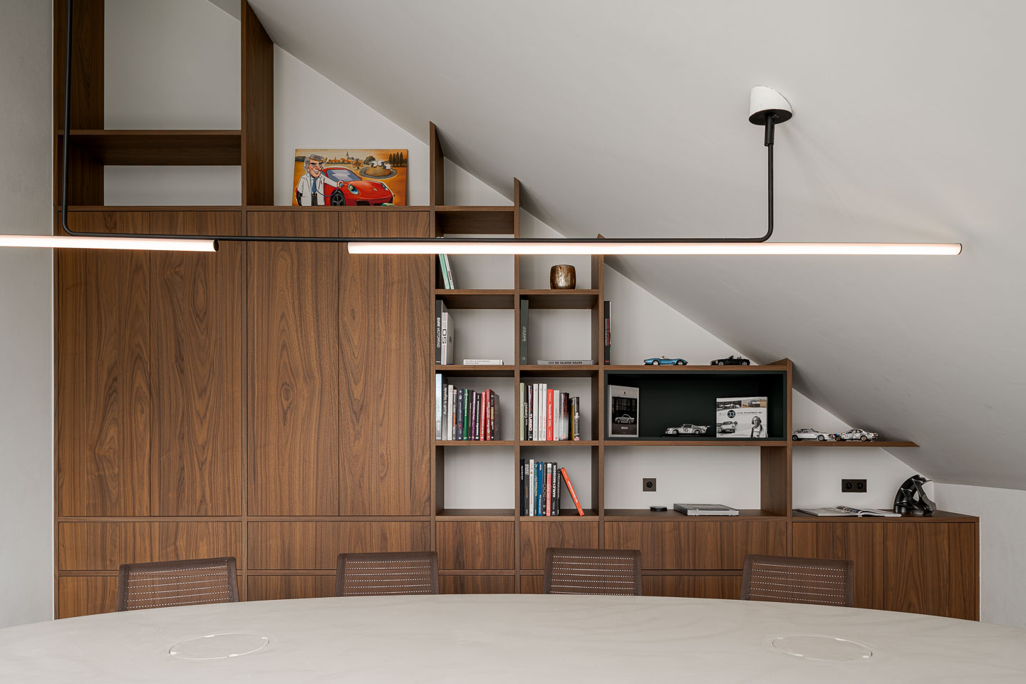 De grootste uitdaging was de functionele synergie tussen kantoor en private sfeer. Dit werd beantwoord door een duidelijke zonering waarbij het gelijkvloers de dagelijkse werking huisvest en de verdieping fungeert als sociaal hart. Een tweede uitdaging was het integreren van techniek zonder de serene esthetiek te verstoren. Ventilatie en klimatisatie zijn volledig onzichtbaar verwerkt in het maatwerkmeubilair en de verlichtingsarmaturen. Ten slotte moest het interieur de passie van de zaakvoerders reflecteren. Dit leidde tot unieke elementen zoals de wankelmotortafel en een bibliotheekwand in notelaar met subtiele racing green accenten als knipoog naar hun liefde voor klassieke racewagens.