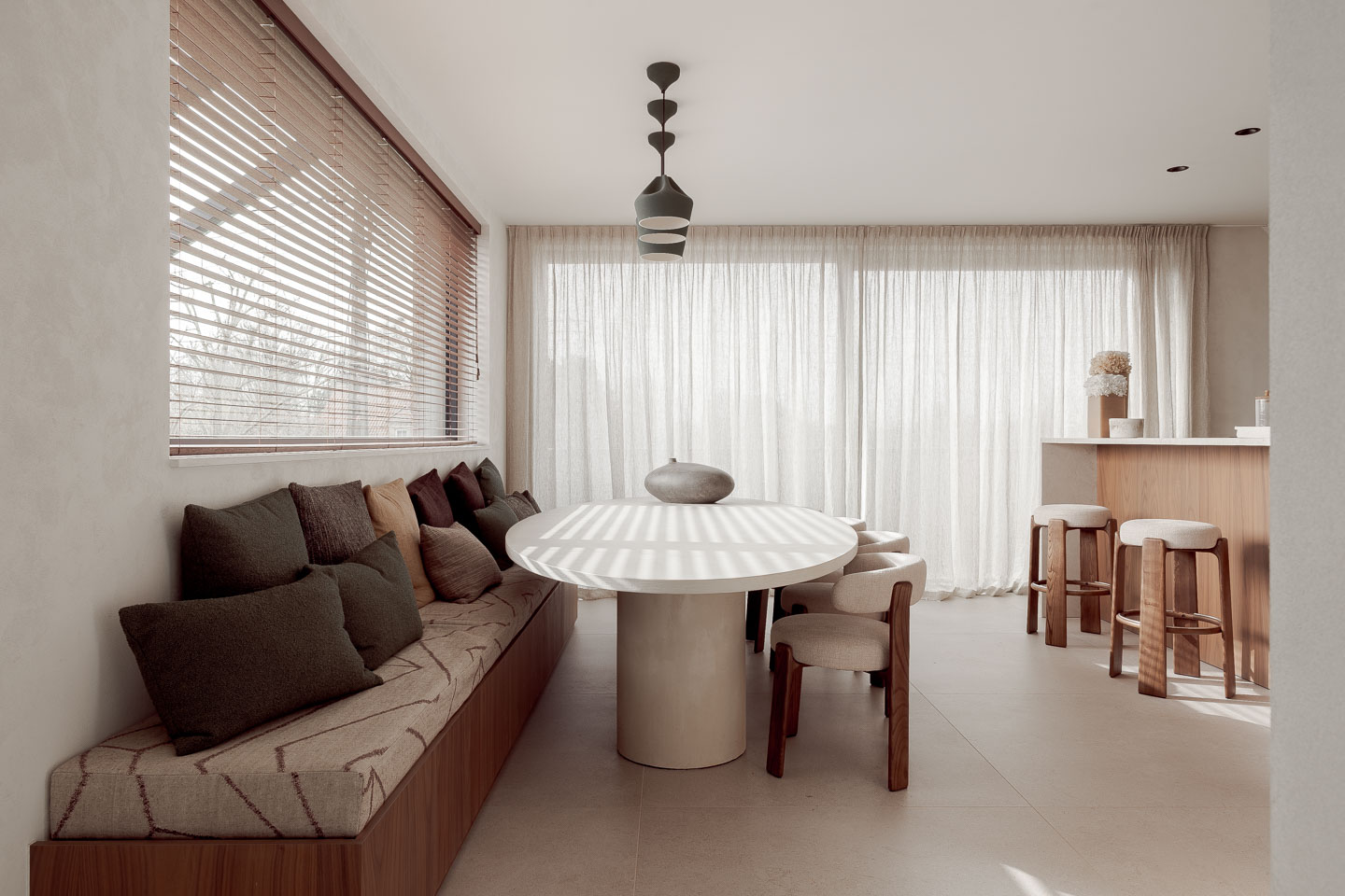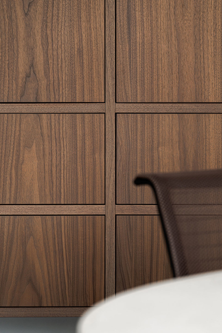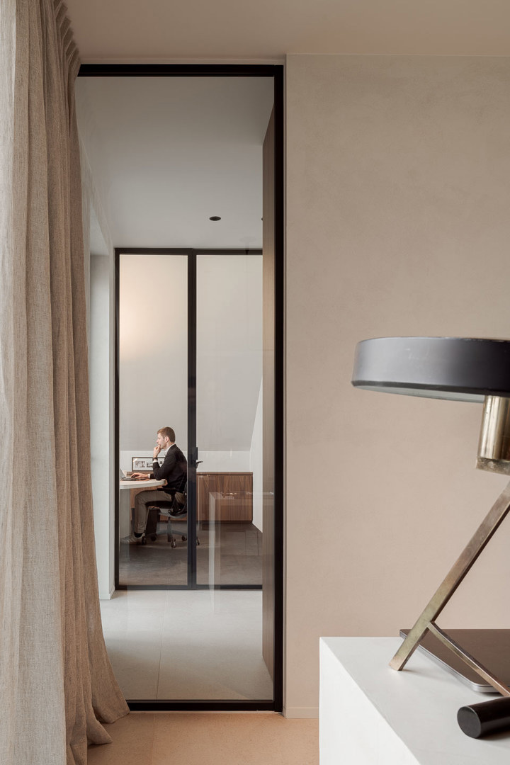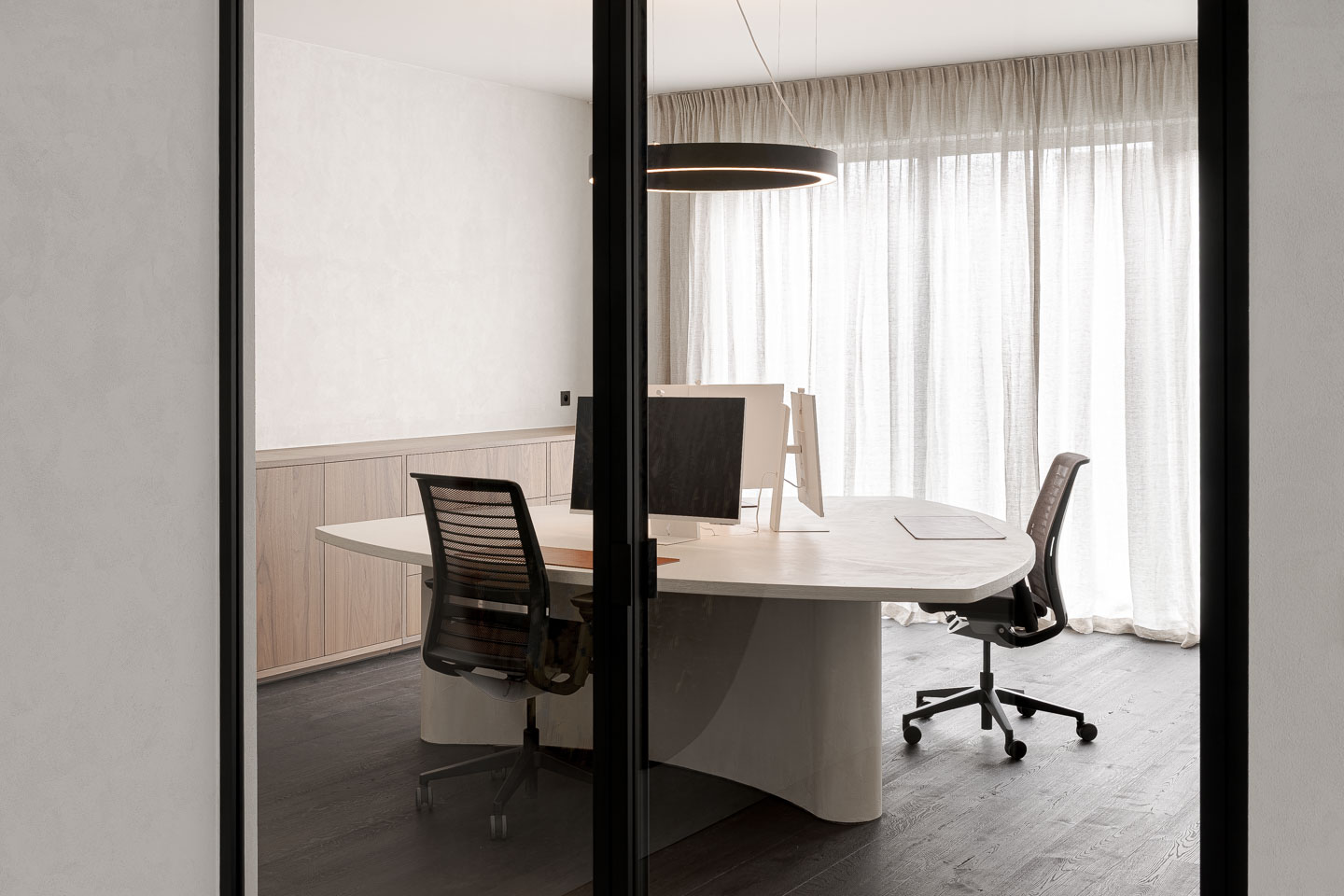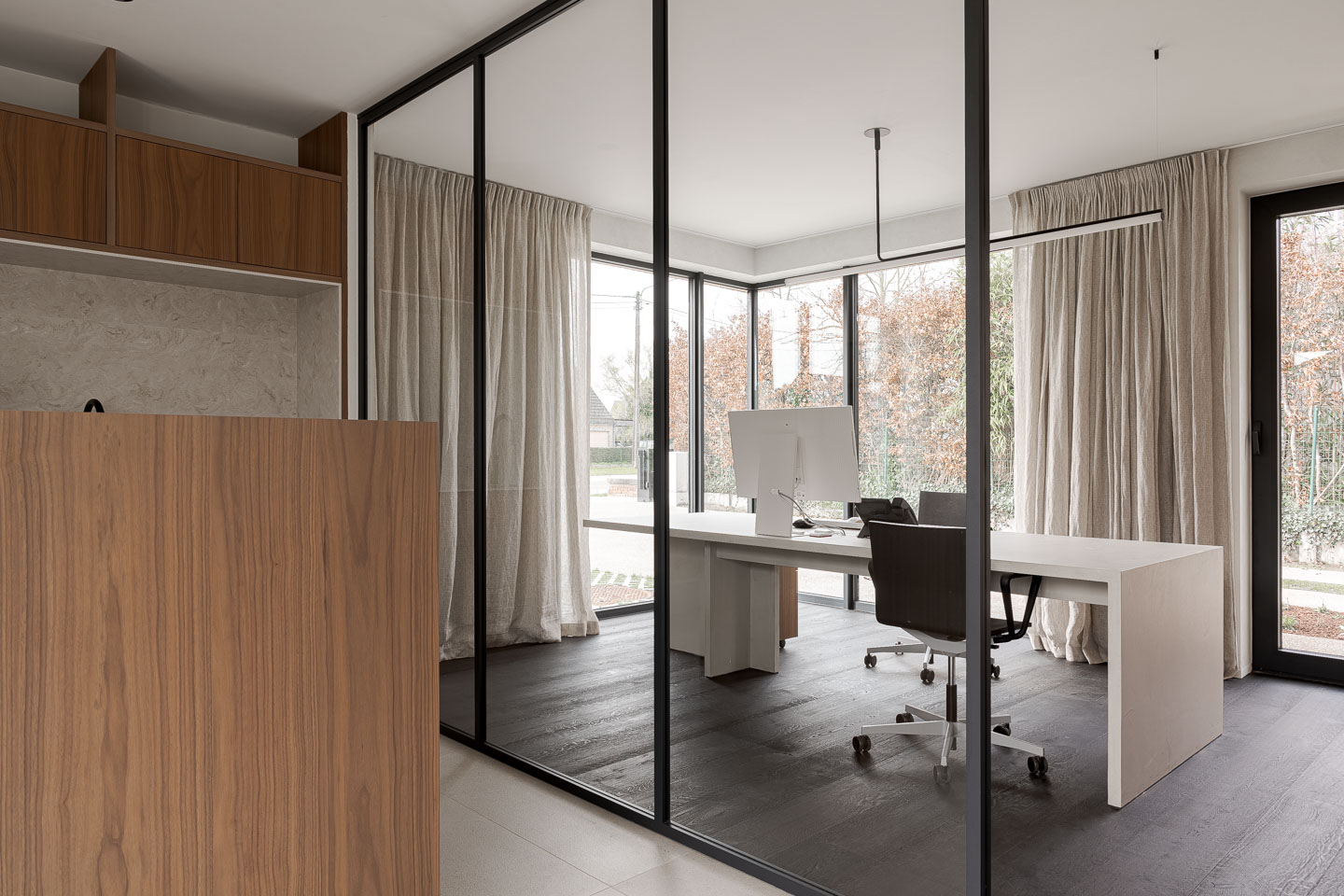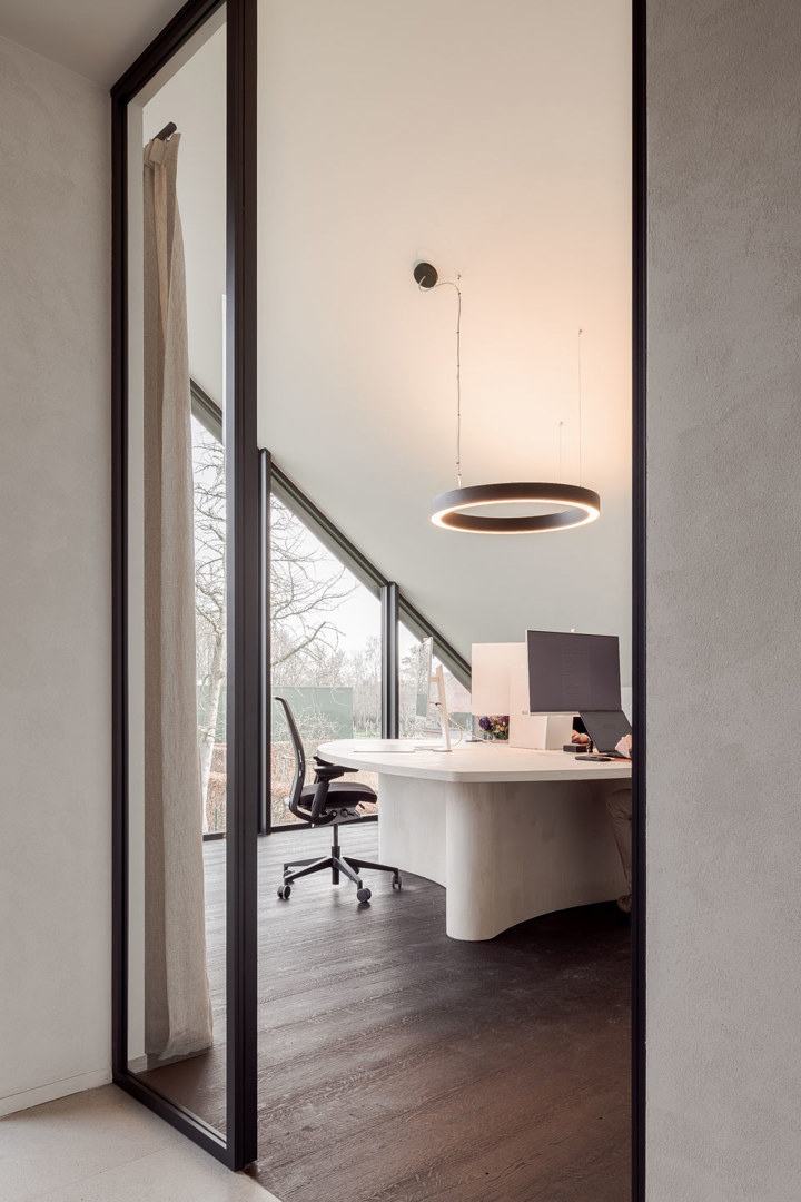 Het welbevinden wordt bevorderd door een omgeving die rust en huiselijkheid uitstraalt en stress reduceert. Linnen gordijnen en kalkpleister temperen de hardheid van glas en staal, terwijl notelaar zorgt voor tactiele warmte. De ruimtelijke indeling stimuleert sociale interactie; de keuken met vaste zitbank en ronde tafel nodigt uit tot gedeelde lunchmomenten en spontaan overleg. Tegelijkertijd garanderen glazen wanden met slanke profielen transparantie en akoestische privacy. De volledige integratie van technieken in het meubilair zorgt voor een optimaal binnenklimaat zonder tocht of visuele ruis, wat essentieel is voor een gezonde en serene werkplek.