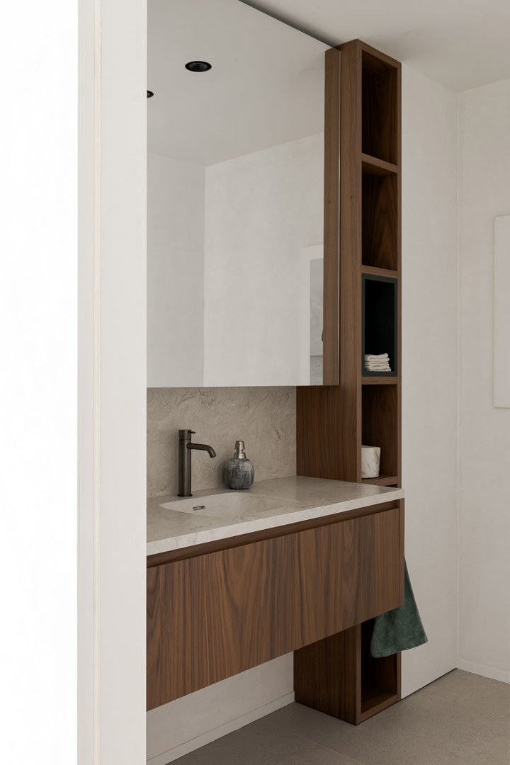 Duurzaamheid uit zich in de keuze voor tijdloze en kwalitatieve materialen zoals notelaar, natuursteen en kalkpleister die mooi verouderen en generaties meegaan. Het project zet sterk in op sociale duurzaamheid door de creatie van een sociaal hart met een ruime keuken en terras, wat de groepsdynamiek en het welzijn bevordert. De integratie van geavanceerde klimatisatie in het meubilair zorgt voor een energie efficiënt binnenklimaat zonder visuele vervuiling. Door maatwerk te koppelen aan de specifieke identiteit van de opdrachtgever, ontstaat een gebouw dat niet alleen vandaag functioneert, maar door zijn intrinsieke kwaliteit ook morgen relevant blijft voor de familiale onderneming.