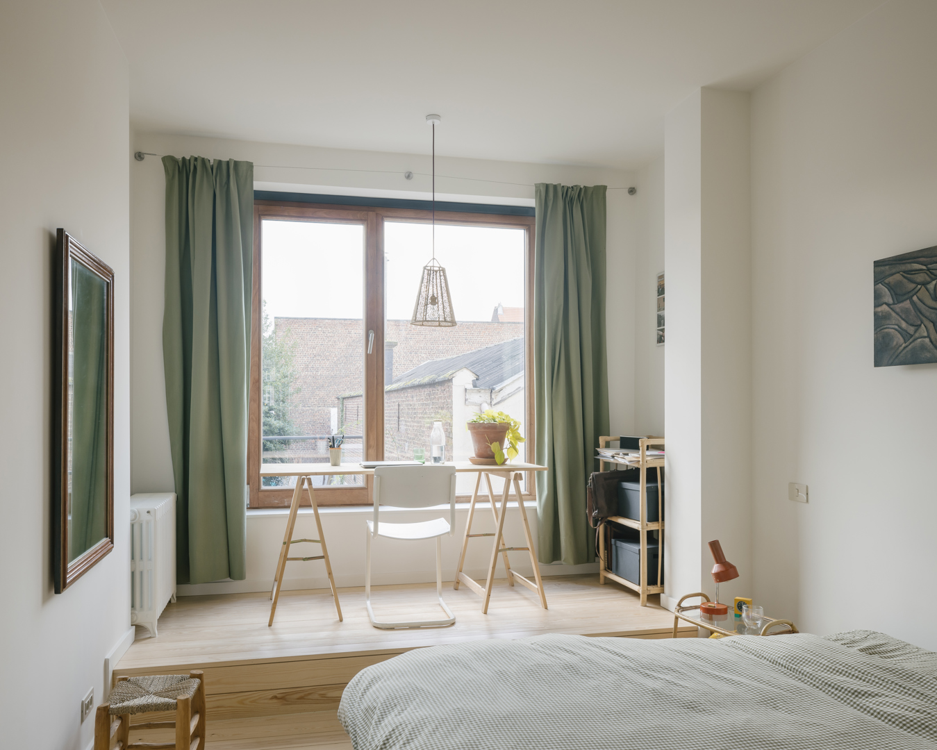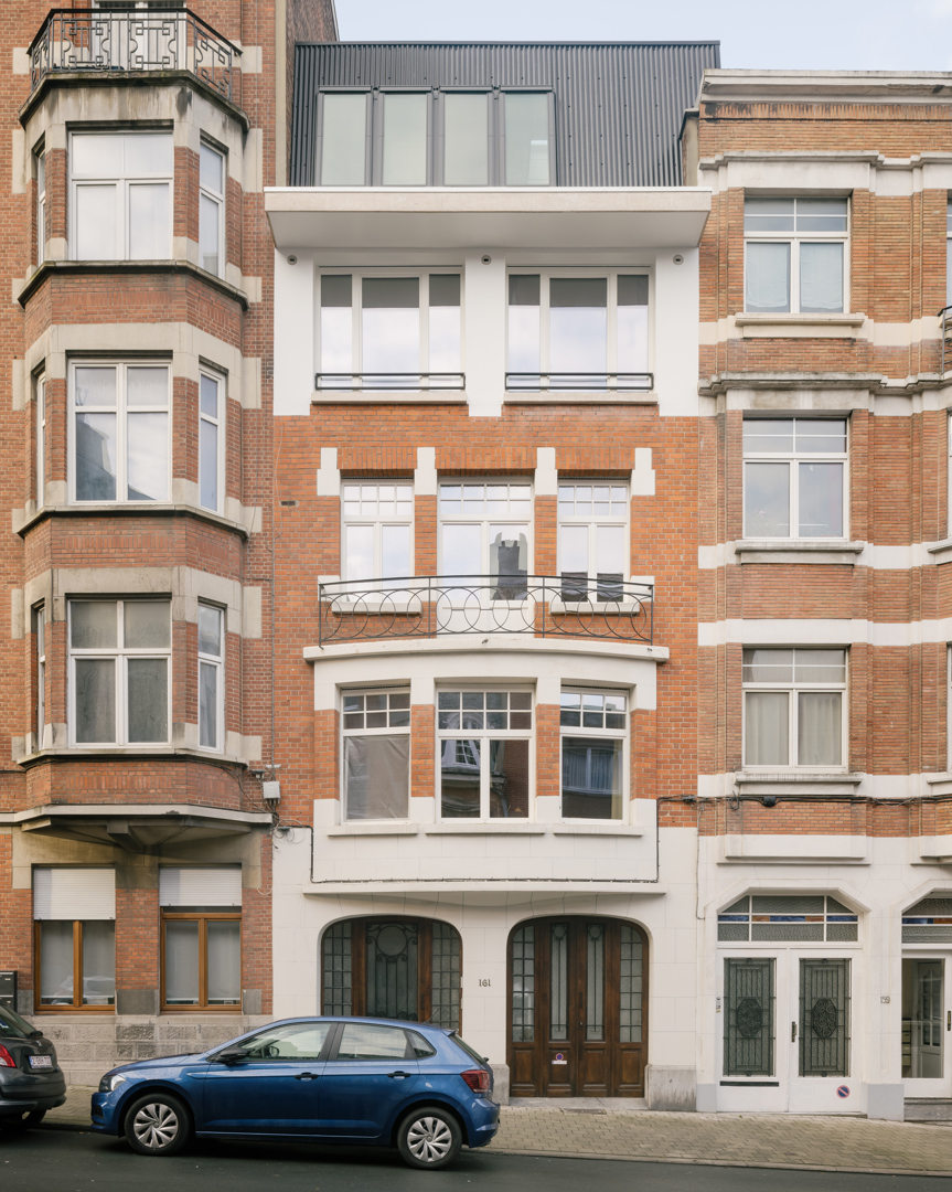De belangrijkste uitdaging was een alledaags gebouw te transformeren zonder zijn kwaliteiten uit te wissen, en er tegelijk een hedendaagse ingreep aan toe te voegen zonder een breuk te creëren. We wilden het bestaande patrimonium zichtbaar maken, het wooncomfort verbeteren, op een beheerste manier verdichten en eenvoudig bouwen, met veel aandacht voor de context. Ons antwoord was een precieze ingreep: maximale bewaring van elementen die het karakter van het gebouw bepalen, gericht openwerken van de plattegrond om de voorgevel en de binnenruimtes beter te benutten, een zorgvuldige herorganisatie van de woningen en een optopping die voortbouwt op de oorspronkelijke compositie. Nieuwe elementen gaan in dialoog met het bestaande via materiaal, verhoudingen en detaillering.