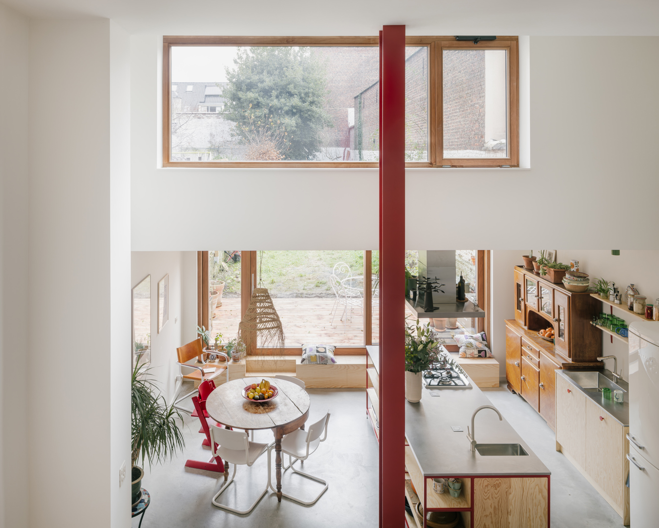Een familie met drie generaties — grootouders, kinderen en kleinkinderen — vertrouwde ons de verbouwing toe van dit Brusselse gebouw uit 1924, aangekocht als basis voor een intergenerationeel woonproject. De vraag was om de geest van het gebouw te bewaren, de oorspronkelijke materialen en ruimtelijke kwaliteiten zo veel mogelijk te behouden, en tegelijk het comfort, de isolatie en de energieprestaties te verbeteren. De bouwheer wilde ook inzetten op ecologische materialen en, waar mogelijk, hergebruik, zonder de budgetbeheersing uit het oog te verliezen. De opdracht bestond er dus in om met het bestaande te werken en een sobere, duurzame en genereuze transformatie te realiseren die nieuwe woonvormen mogelijk maakt zonder het geheugen van de plek uit te wissen.