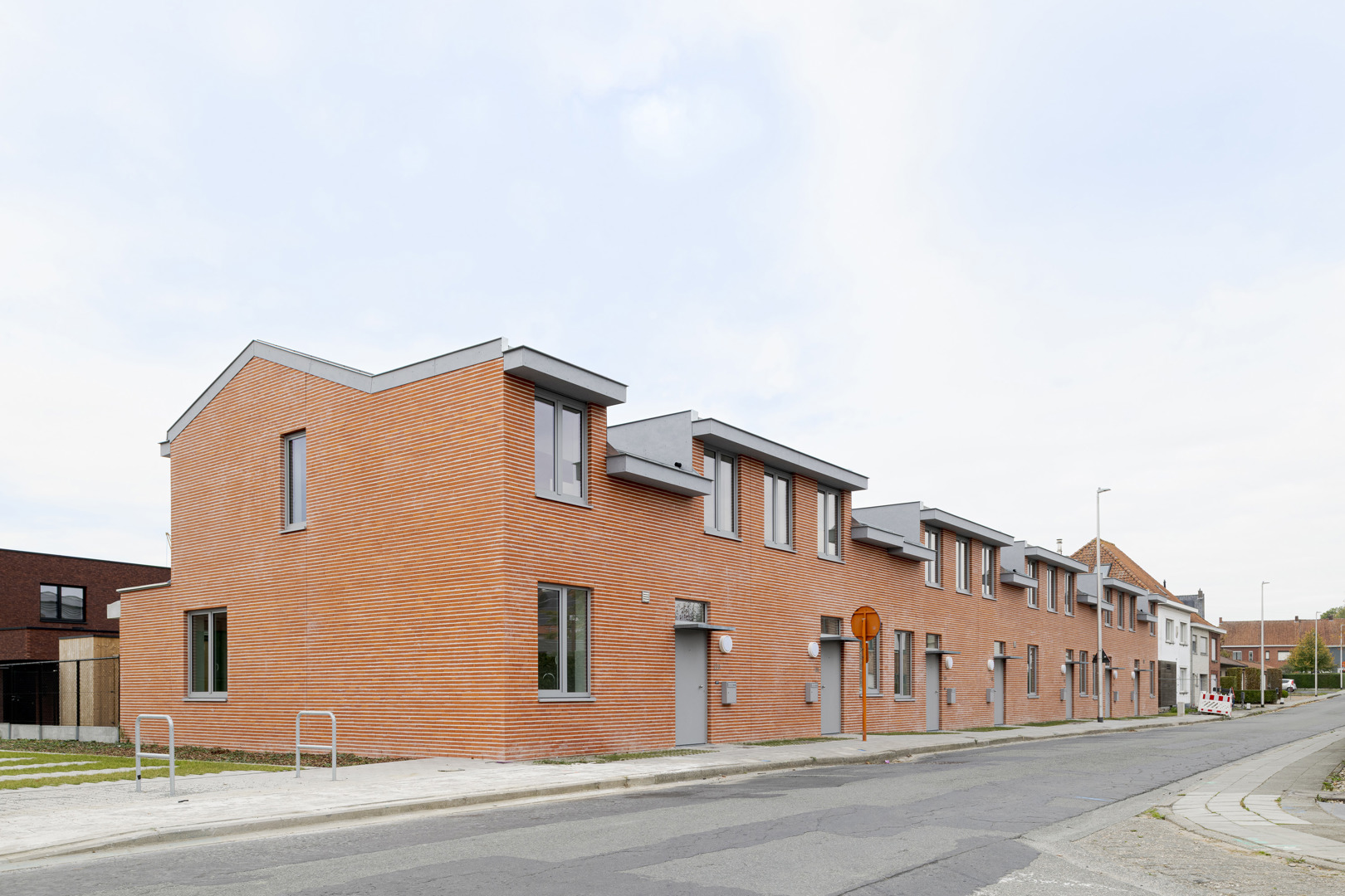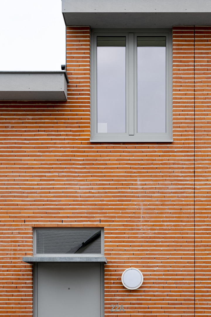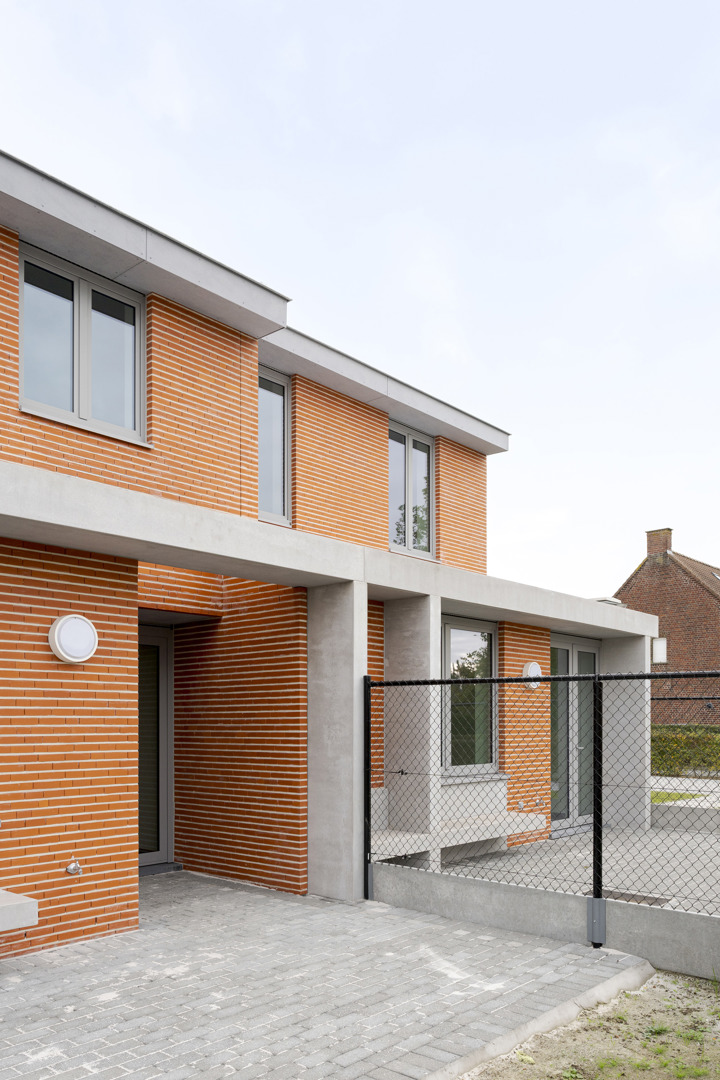Het project onderzoekt hoe sociale woningbouw kan optreden als kwalitatieve hefboom voor de dorpsrand van Lendelede. 7 woningen vormen een scharnier tussen het bestaande weefsel en de nieuwe wijk rond het Bergkapelpark. De opdracht werd opgevat als een oefening in verdichting zonder verlies aan leefkwaliteit: compact, herkenbaar en collectief ingebed. Door één krachtig architecturaal gebaar met subtiele variaties ontstaat een samenhangend geheel dat het straatbeeld versterkt en tegelijk een hedendaagse wooncultuur introduceert, geworteld in het dorp en gericht op de toekomst. De architectuurtaal gaat om met een vooraf bepaald en uitgeschreven lexicon door de opdrachtgever vanuit het oogpunt van efficiënt en duurzaam onderhoud van de verschillende woningen die zij beheren.