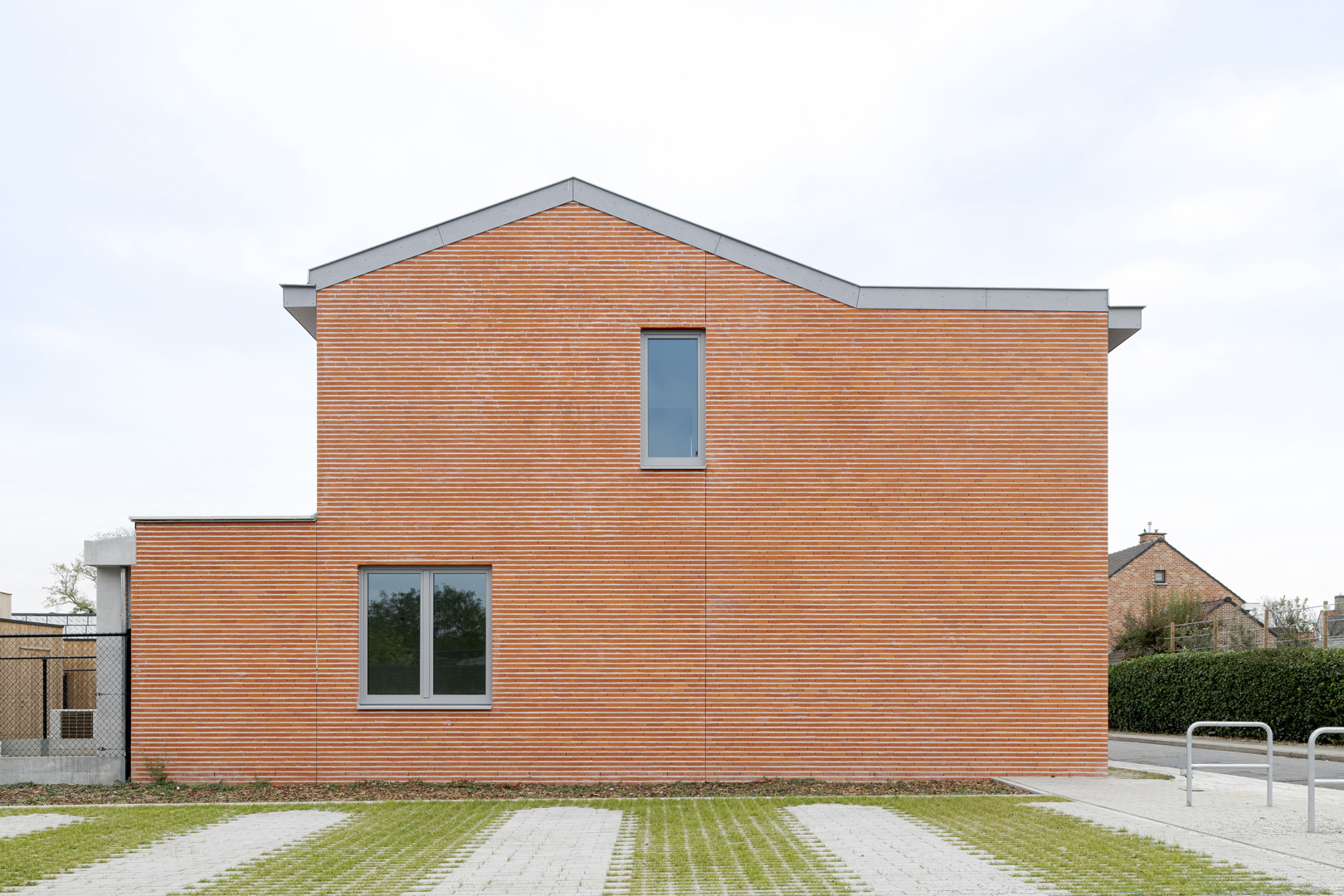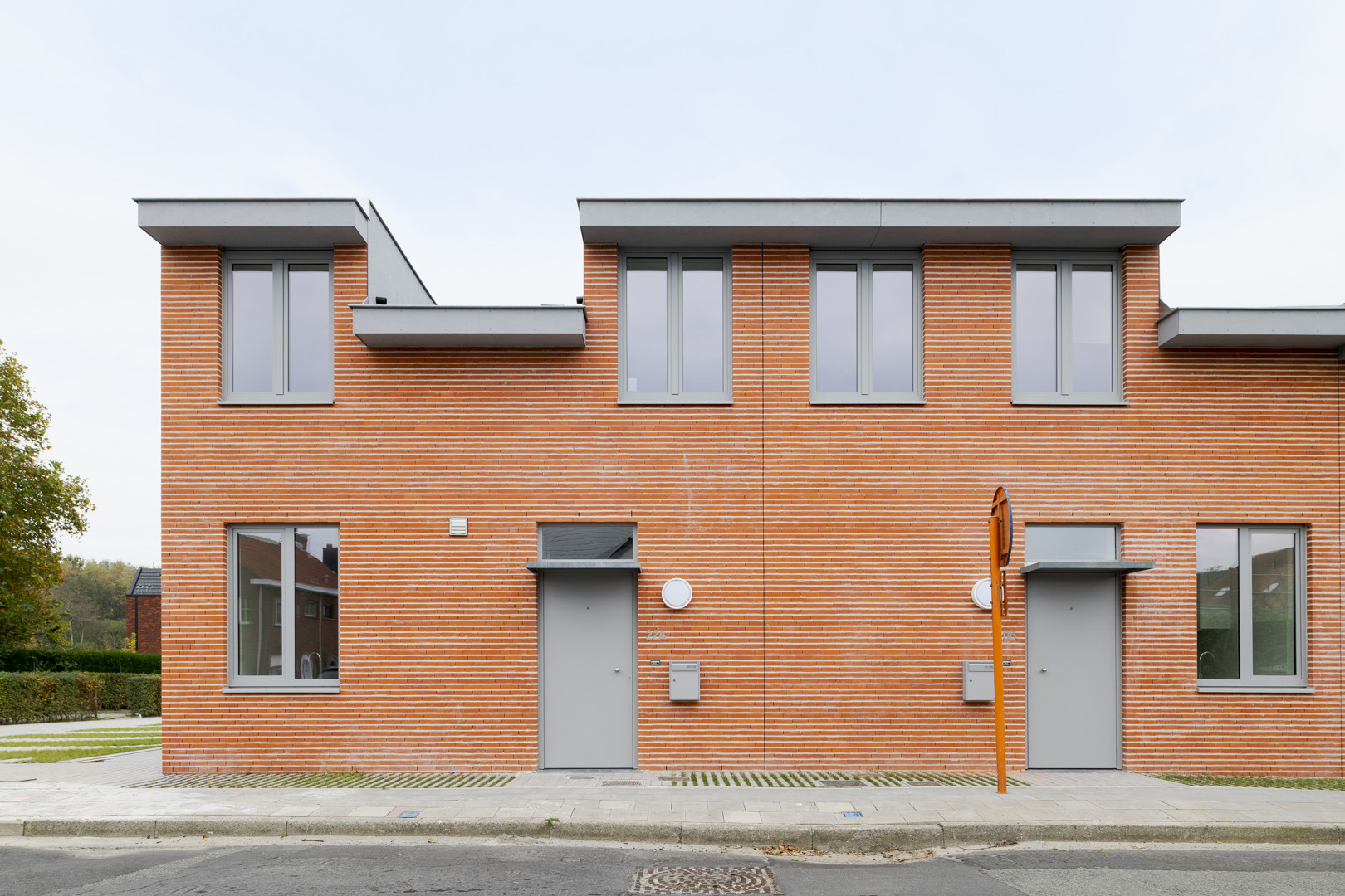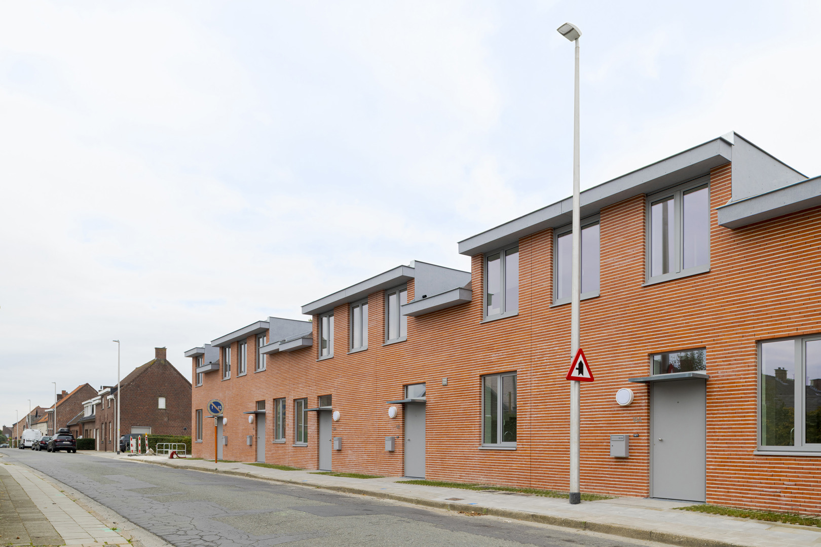 Het project onderzoekt hoe sociale woningbouw kan optreden als kwalitatieve hefboom voor de dorpsrand van Lendelede. 7 woningen vormen een scharnier tussen het bestaande weefsel en de nieuwe wijk rond het Bergkapelpark. De opdracht werd opgevat als een oefening in verdichting zonder verlies aan leefkwaliteit: compact, herkenbaar en collectief ingebed. Door één krachtig architecturaal gebaar met subtiele variaties ontstaat een samenhangend geheel dat het straatbeeld versterkt en tegelijk een hedendaagse wooncultuur introduceert, geworteld in het dorp en gericht op de toekomst. De architectuurtaal gaat om met een vooraf bepaald en uitgeschreven lexicon door de opdrachtgever vanuit het oogpunt van efficiënt en duurzaam onderhoud van de verschillende woningen die zij beheren.