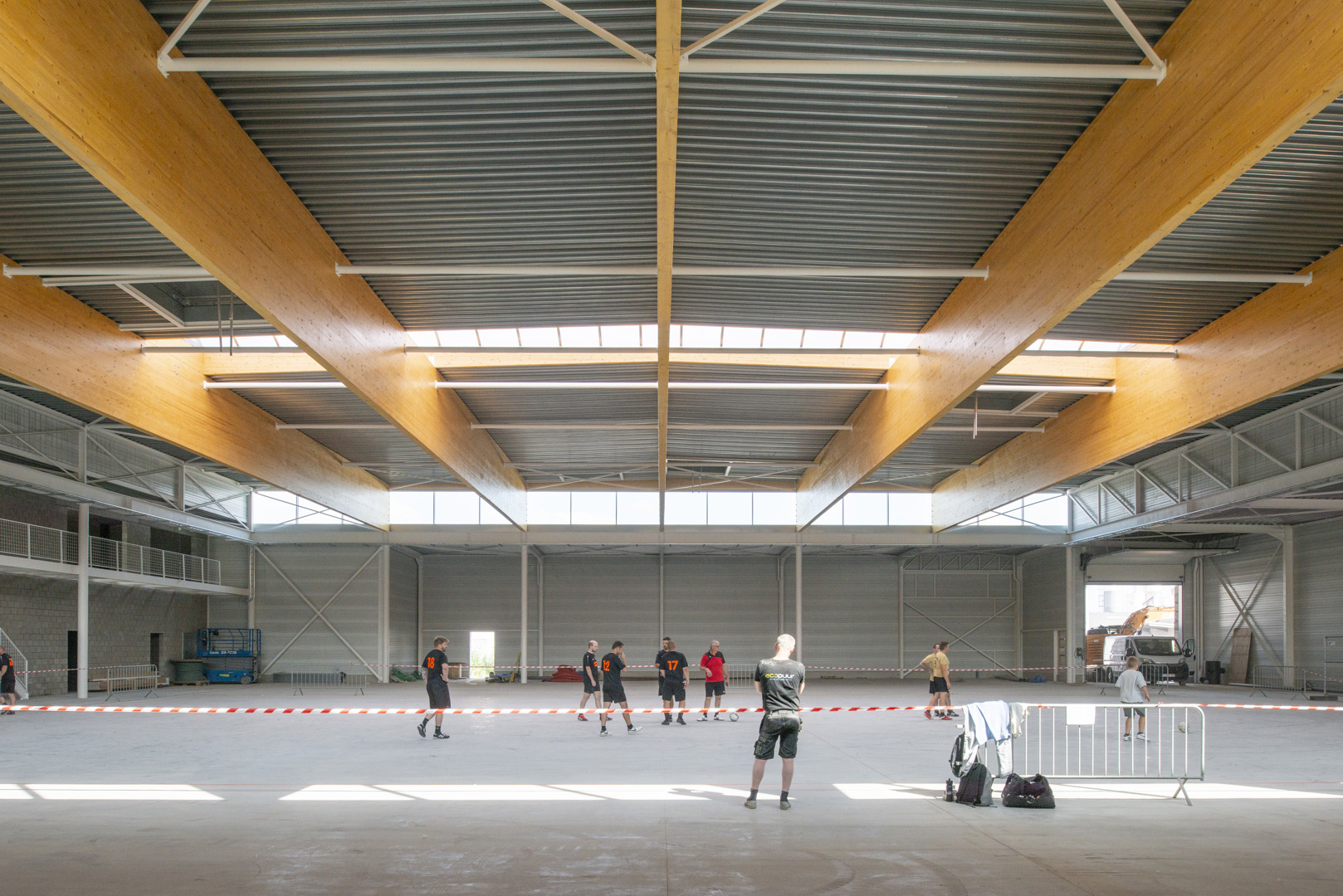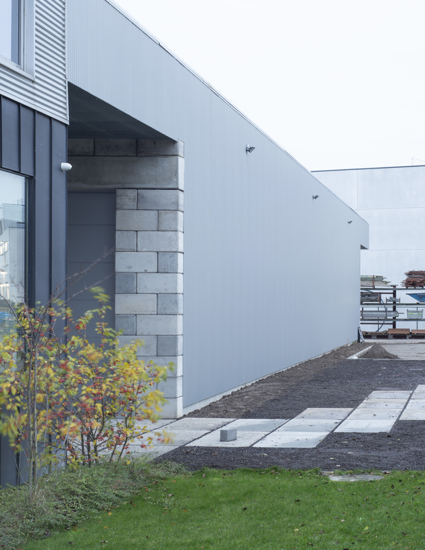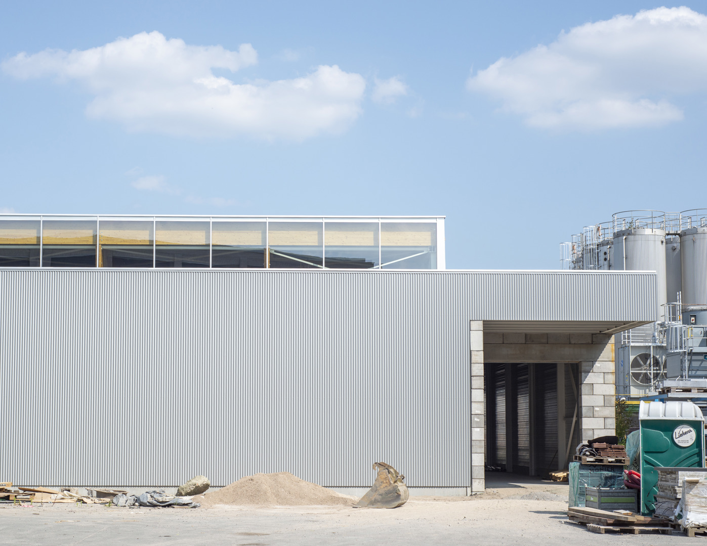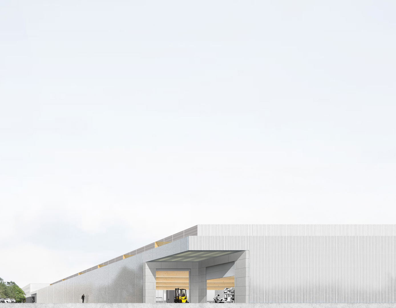 Een nieuwe houtbouwproductiehal wordt gebouwd achter een kantoorgebouw op de hoek van een perceel aan de rand van een driehoekig industriegebied nabij de snelweg. Een bestaande hoogspanningscabine beperkt het bouwoppervlak, waardoor een standaard rechthoek niet mogelijk is. Het ontwerp vertrekt vanuit een vierkante hoofdruimte met zijkamers; twee vervallen voor de cabine. Zijkamers langs het kantoor bevatten nieuwe kantoren, andere dienen als opslag. Hoeken functioneren als luifels voor leveringen. Een witgeschilderde stalen structuur met ronde kolommen draagt houten balken die een hoger volume en lichtinval creëren. Metalen gevelbekleding verwijst naar het kantoor met verticale geleding. Hergebruikte betonblokken maken de structuur demonteerbaar en circulair.