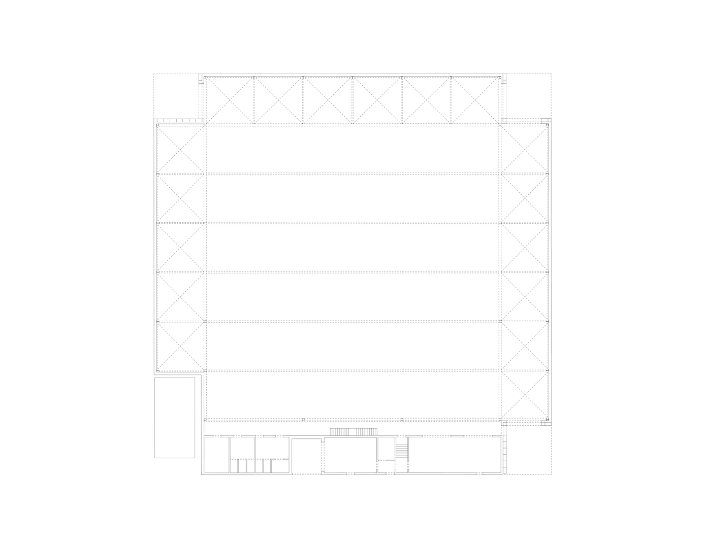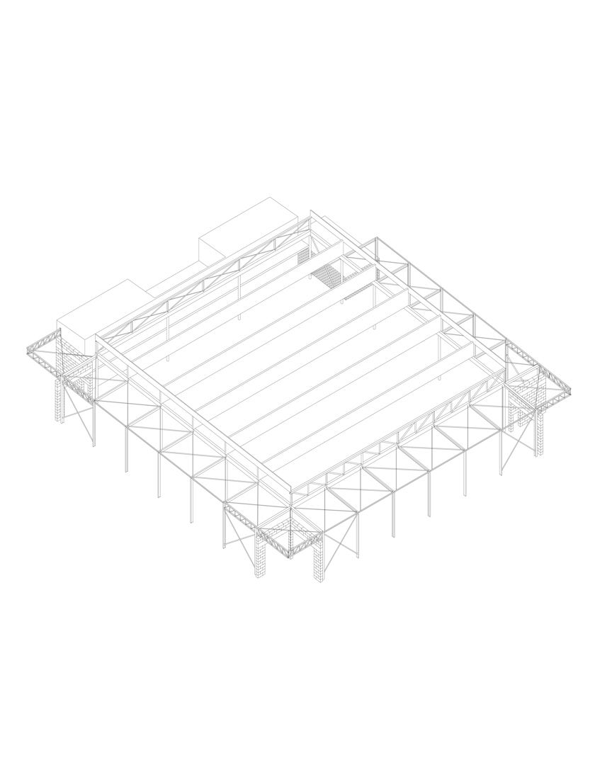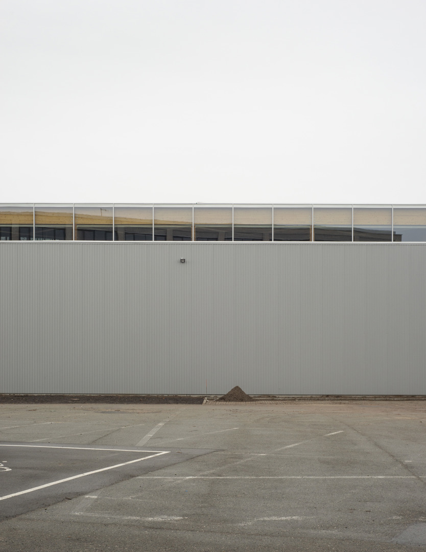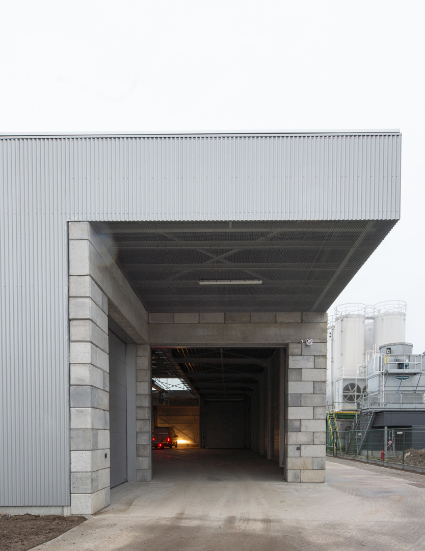 Een nieuwe houtbouwproductiehal wordt gebouwd achter een kantoorgebouw op de hoek van een perceel aan de rand van een driehoekig industriegebied nabij de snelweg. Een bestaande hoogspanningscabine beperkt het bouwoppervlak, waardoor een standaard rechthoek niet mogelijk is. Het ontwerp vertrekt vanuit een vierkante hoofdruimte met zijkamers; twee vervallen voor de cabine. Zijkamers langs het kantoor bevatten nieuwe kantoren, andere dienen als opslag. Hoeken functioneren als luifels voor leveringen. Een witgeschilderde stalen structuur met ronde kolommen draagt houten balken die een hoger volume en lichtinval creëren. Metalen gevelbekleding verwijst naar het kantoor met verticale geleding. Hergebruikte betonblokken maken de structuur demonteerbaar en circulair.