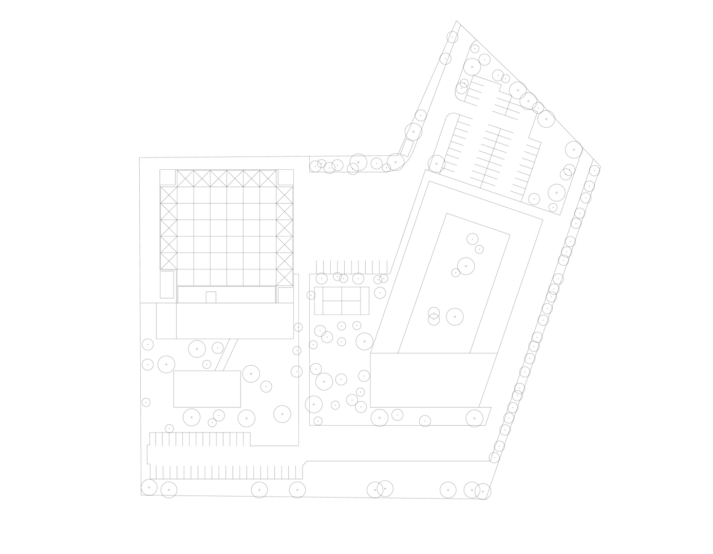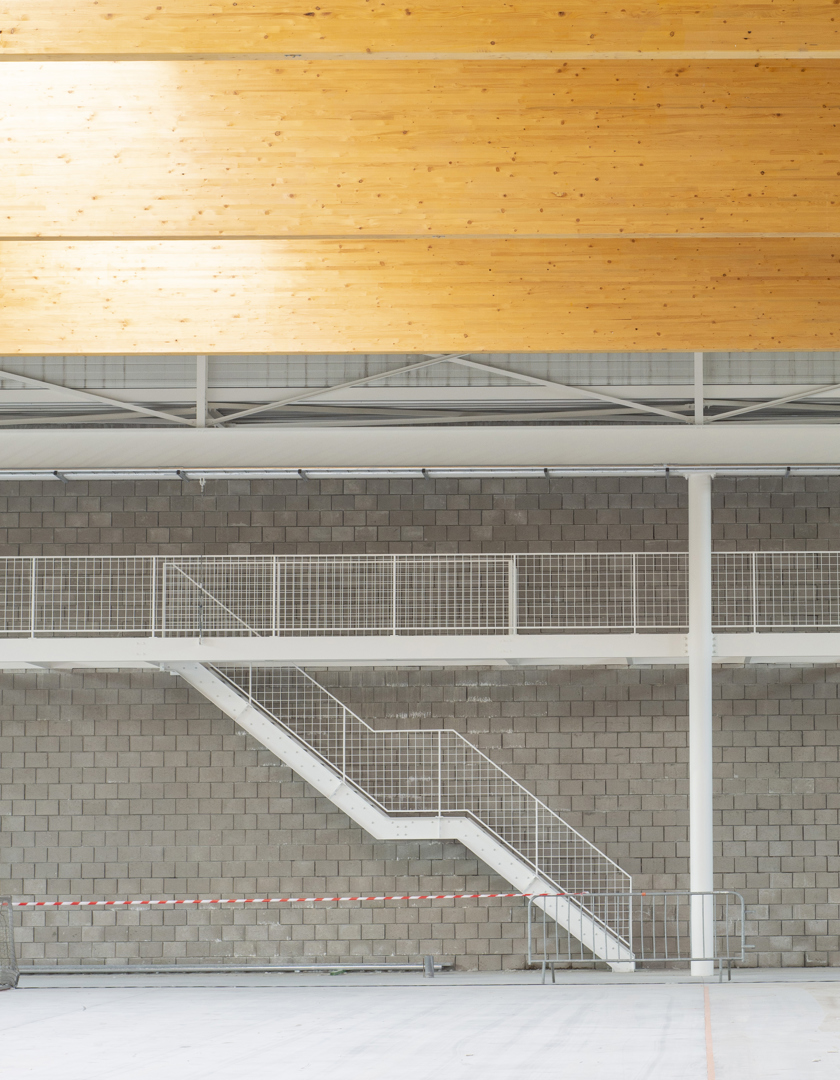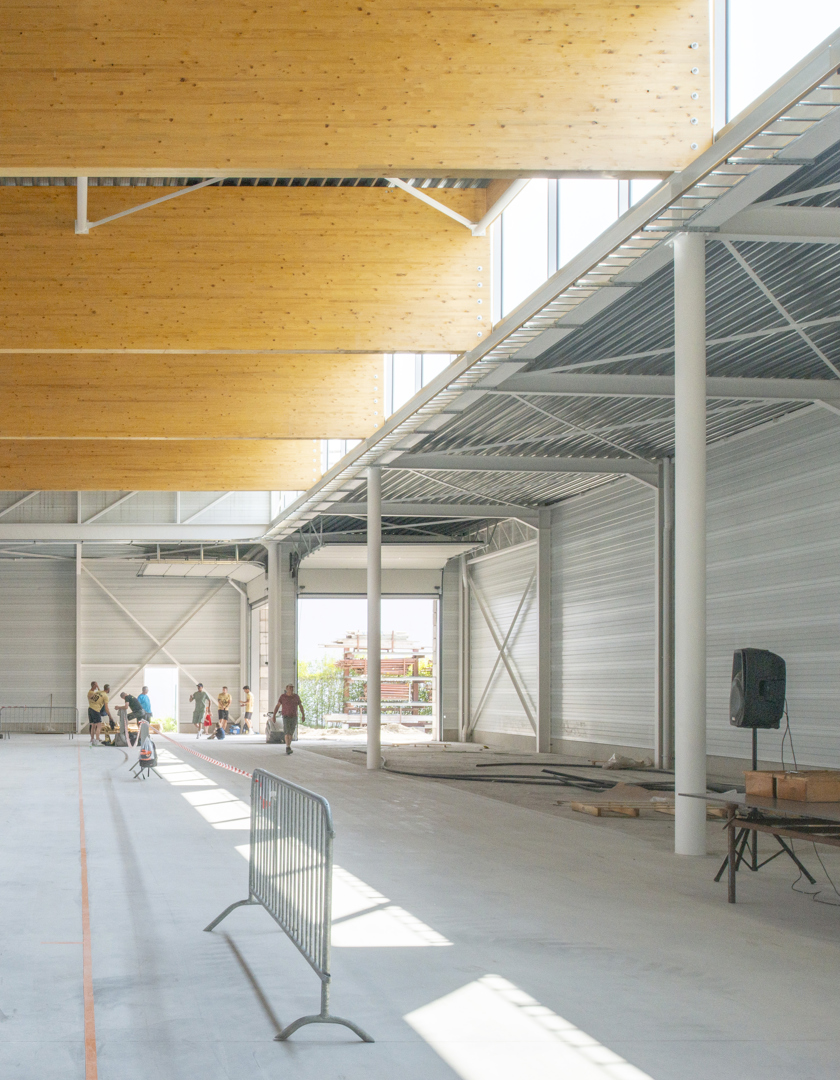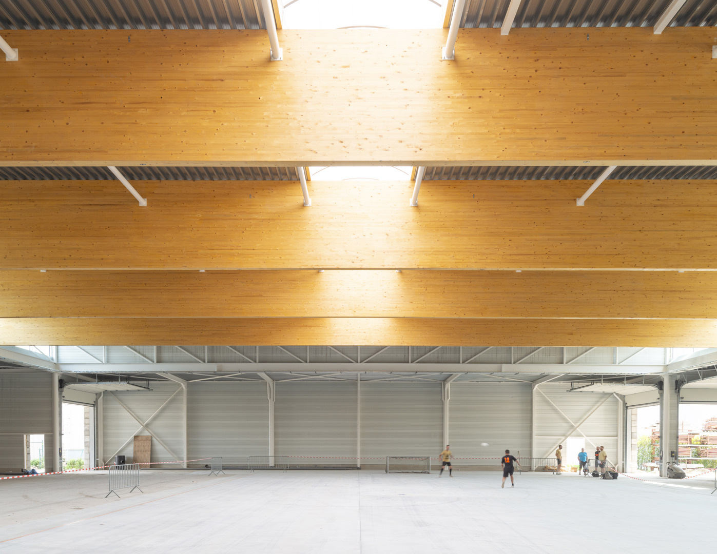 Een nieuwe houtbouwproductiehal wordt gebouwd achter een kantoorgebouw op de hoek van een perceel aan de rand van een driehoekig industriegebied nabij de snelweg. Een bestaande hoogspanningscabine beperkt het bouwoppervlak, waardoor een standaard rechthoek niet mogelijk is. Het ontwerp vertrekt vanuit een vierkante hoofdruimte met zijkamers; twee vervallen voor de cabine. Zijkamers langs het kantoor bevatten nieuwe kantoren, andere dienen als opslag. Hoeken functioneren als luifels voor leveringen. Een witgeschilderde stalen structuur met ronde kolommen draagt houten balken die een hoger volume en lichtinval creëren. Metalen gevelbekleding verwijst naar het kantoor met verticale geleding. Hergebruikte betonblokken maken de structuur demonteerbaar en circulair.