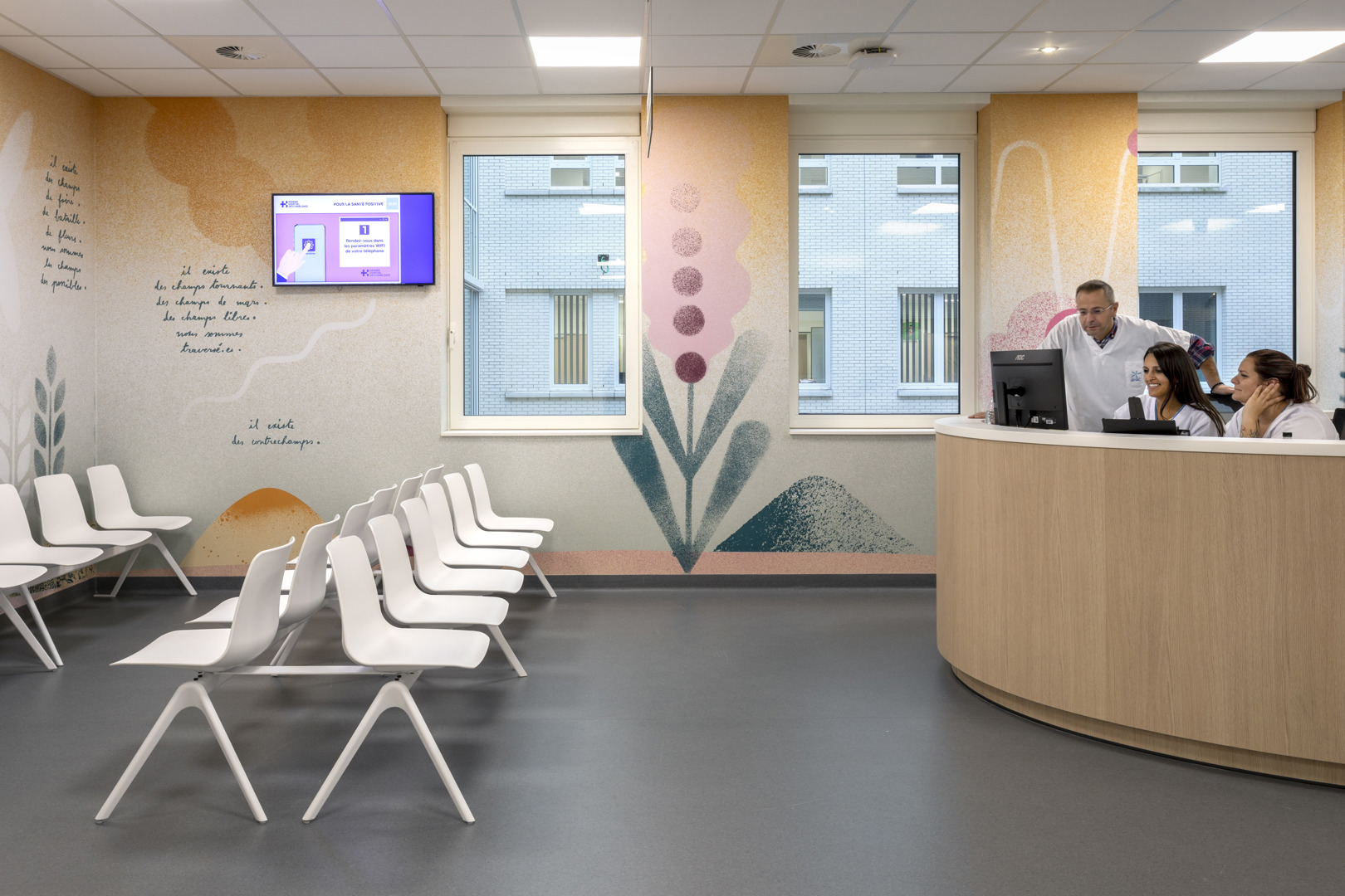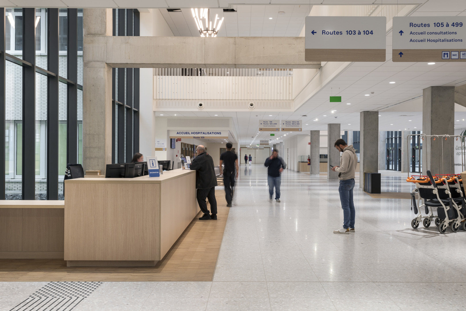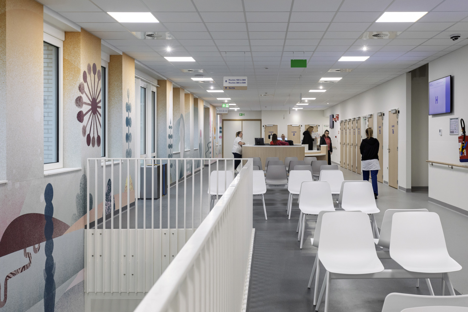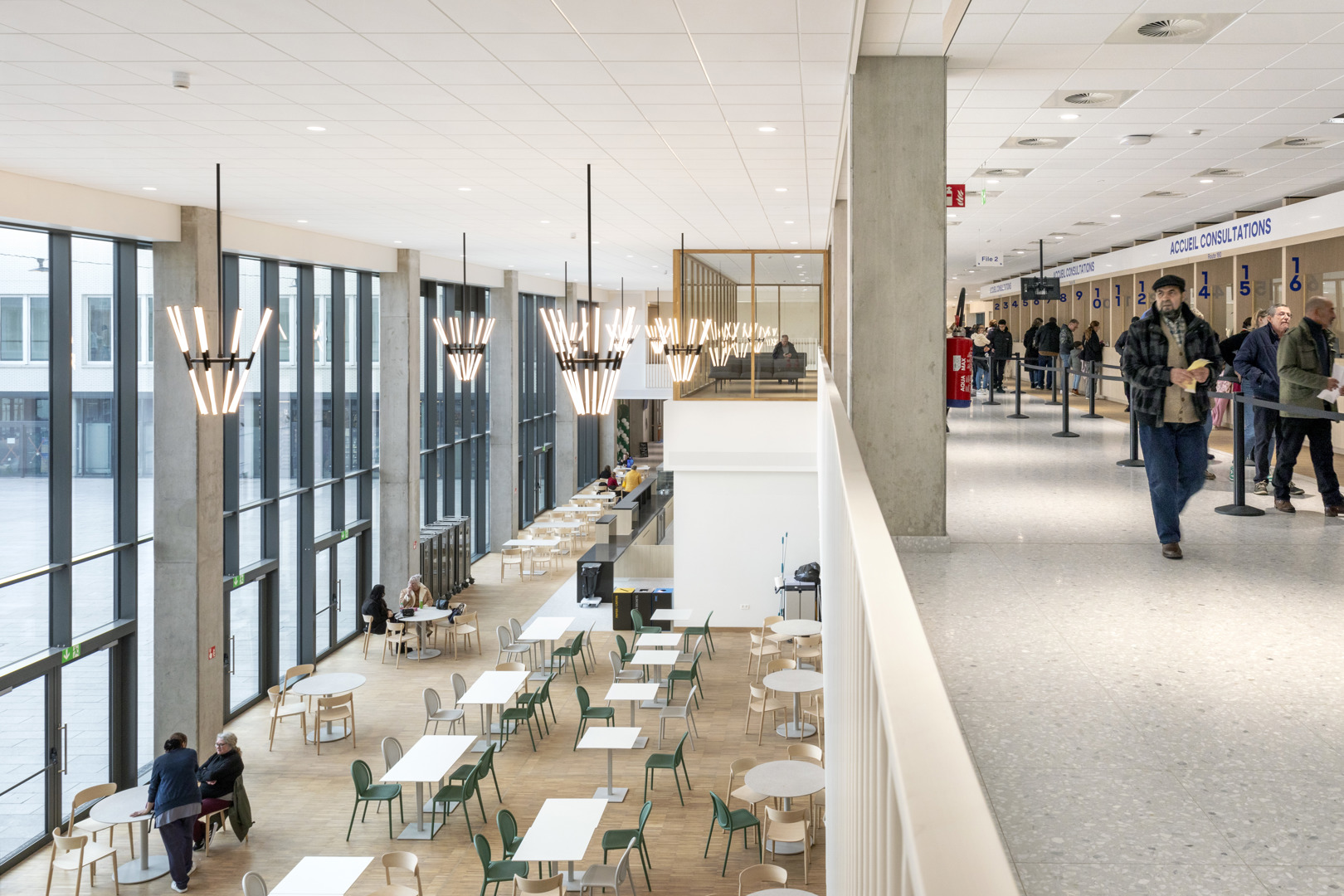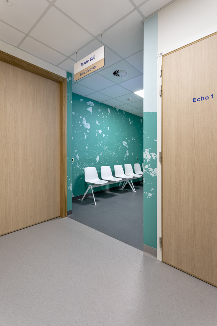 Het Grand Hôpital de Charleroi (GHdC) stelt welzijn centraal in zijn ontwerp door in te zetten op een symbiose tussen architectuur en landschap. Het ziekenhuis ligt in een park van 10,5 hectare en biedt een rustgevende natuurlijke omgeving die het lichamelijke en geestelijke herstel bevordert. Om te breken met het massieve uiterlijk van ziekenhuisgebouwen, maakt het project gebruik van openingen en kleurenspel die een intuïtieve oriëntatie vergemakkelijken. Deze geruststellende aanpak is erop gericht dat patiënten en naasten zich ‘thuis’ voelen. De humanisering van de ruimtes komt tot uiting in een gradatie van intimiteit, waarbij de voorkeur wordt gegeven aan hout in de kamers en artistieke muurschilderingen worden geïntegreerd.